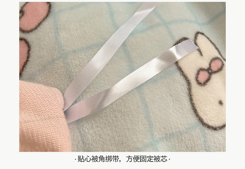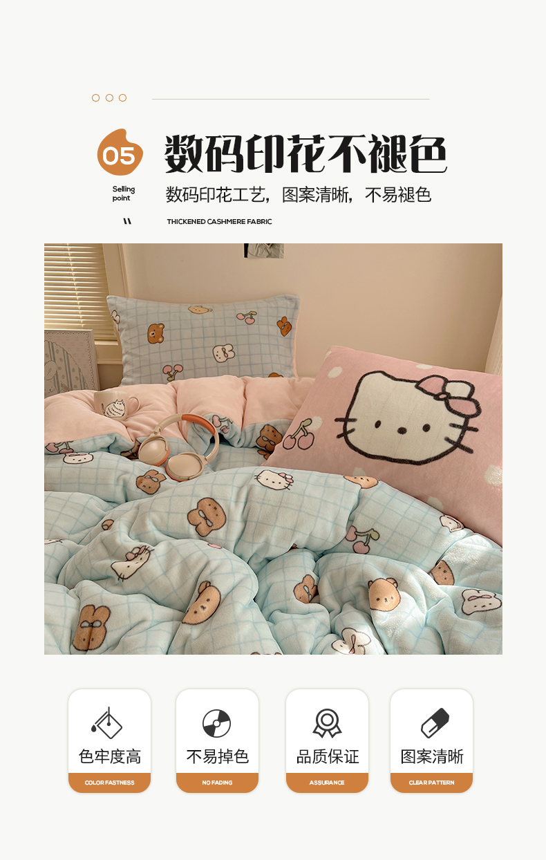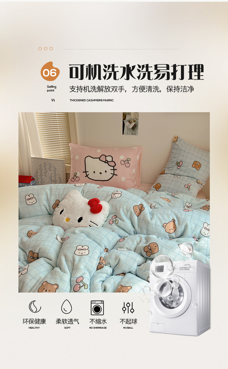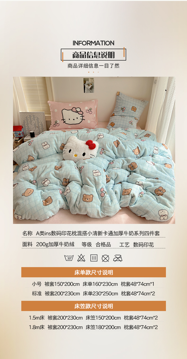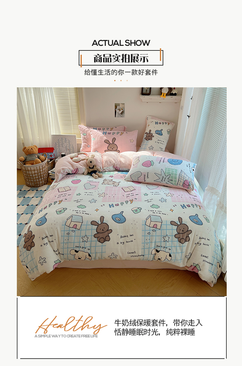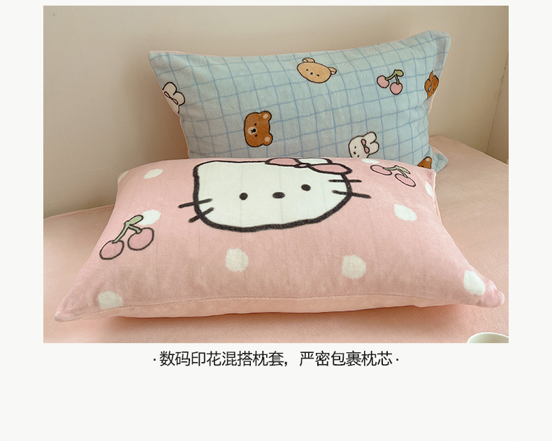 商品名称:桃子家居 2025新款A类ins数码印花枕混搭小清新少女卡通猫咪加厚牛奶系列四件套 绒-混搭樱桃熊兔