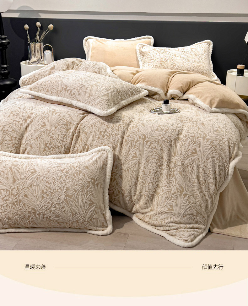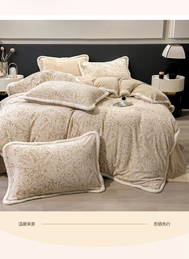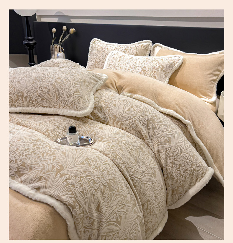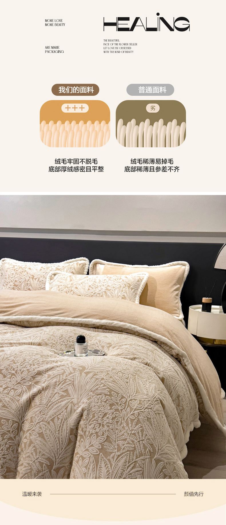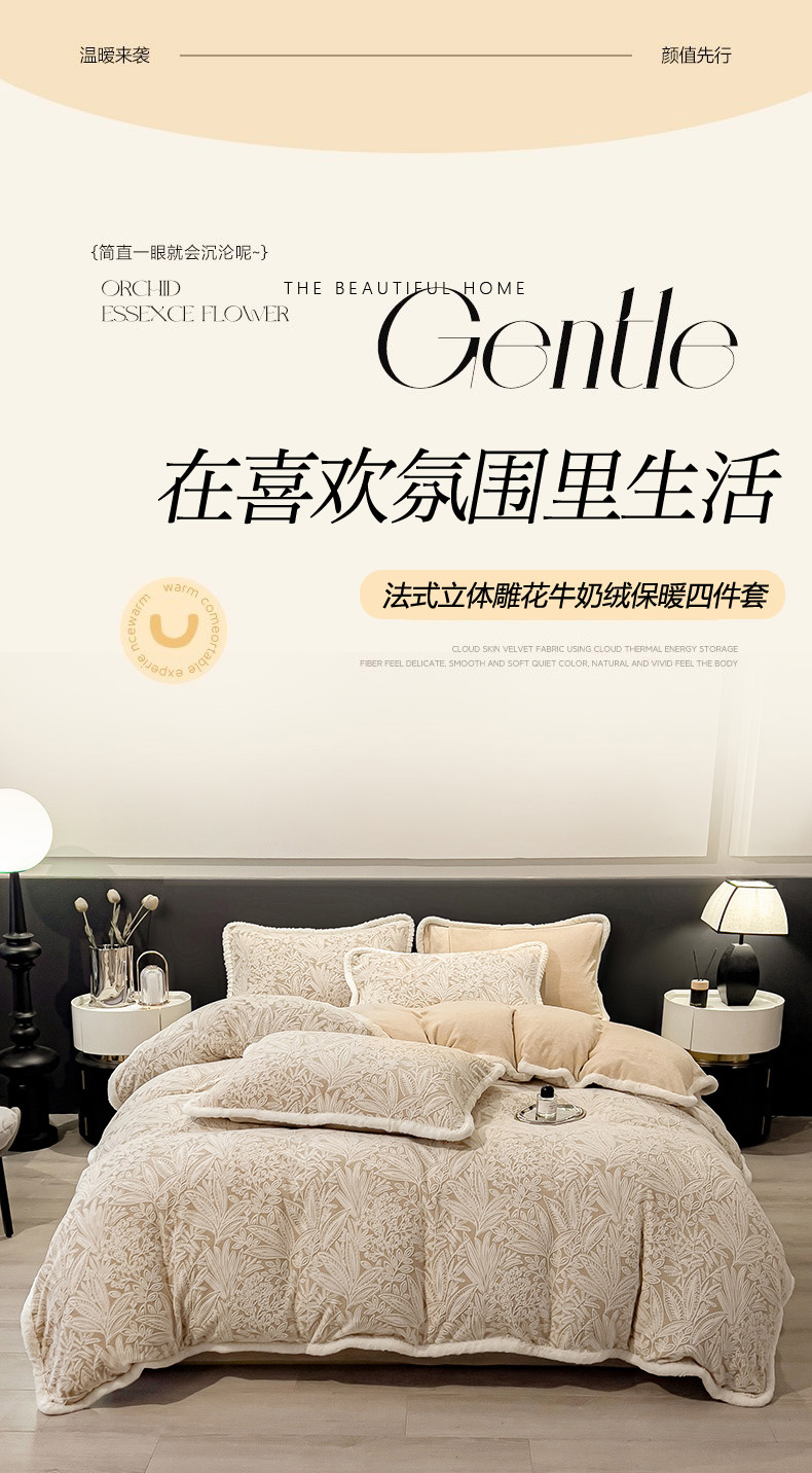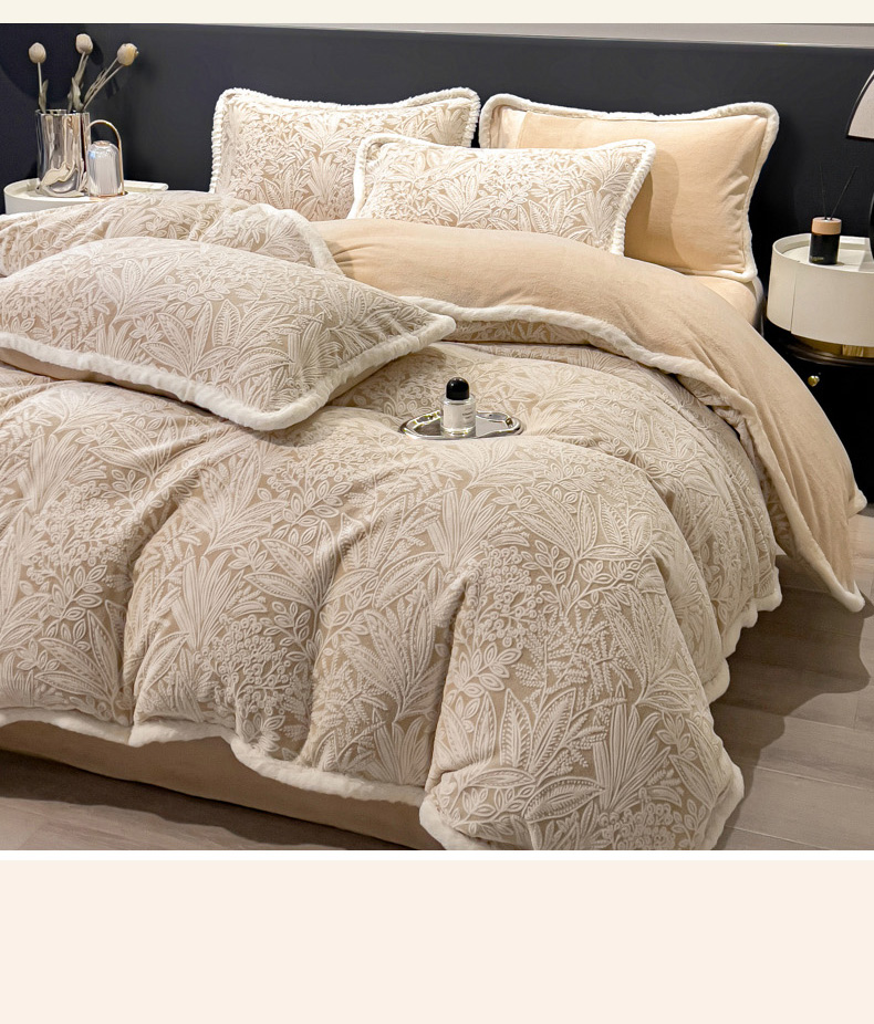 当前位置: 91家纺网 > 商品网购 > 床品套件 > 四件套 > 兔毛绒四件套 > 印季家纺 2025新款法式立体雕花绒兔毛包边四件套 山茶庄园-米黄