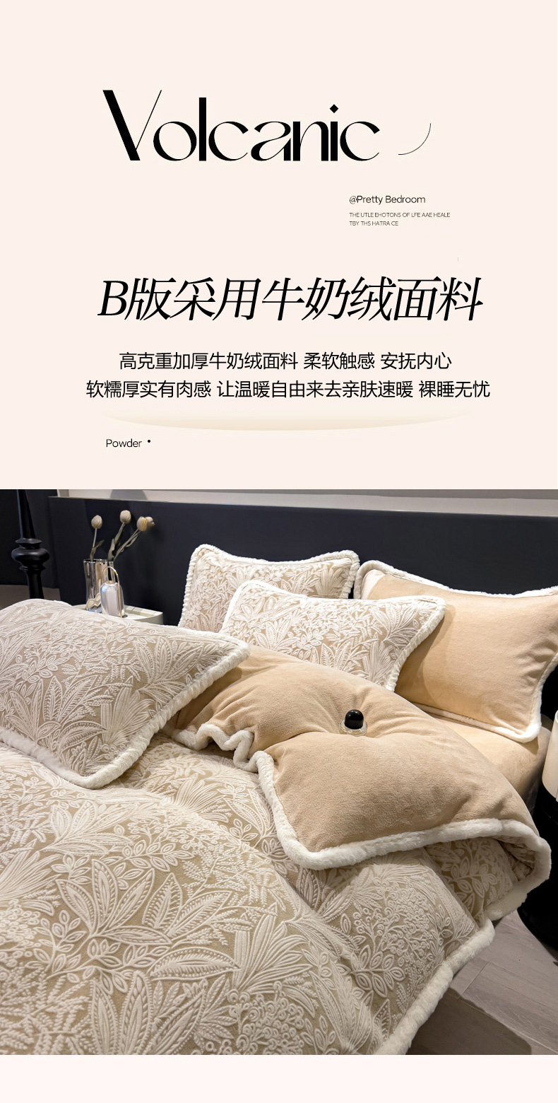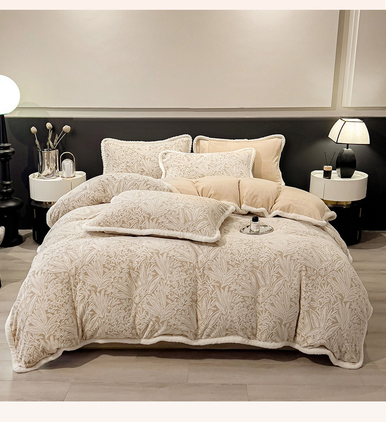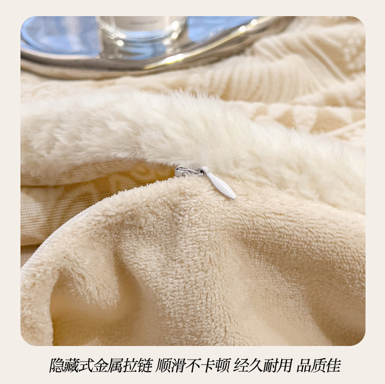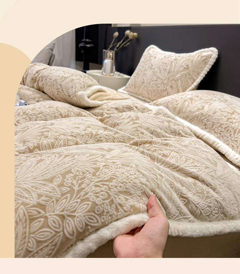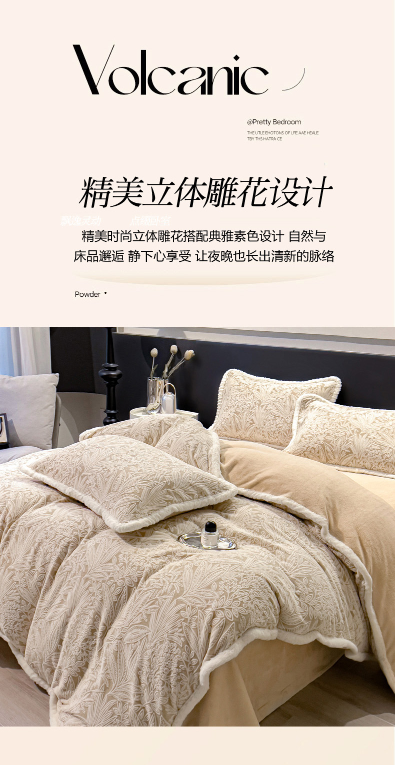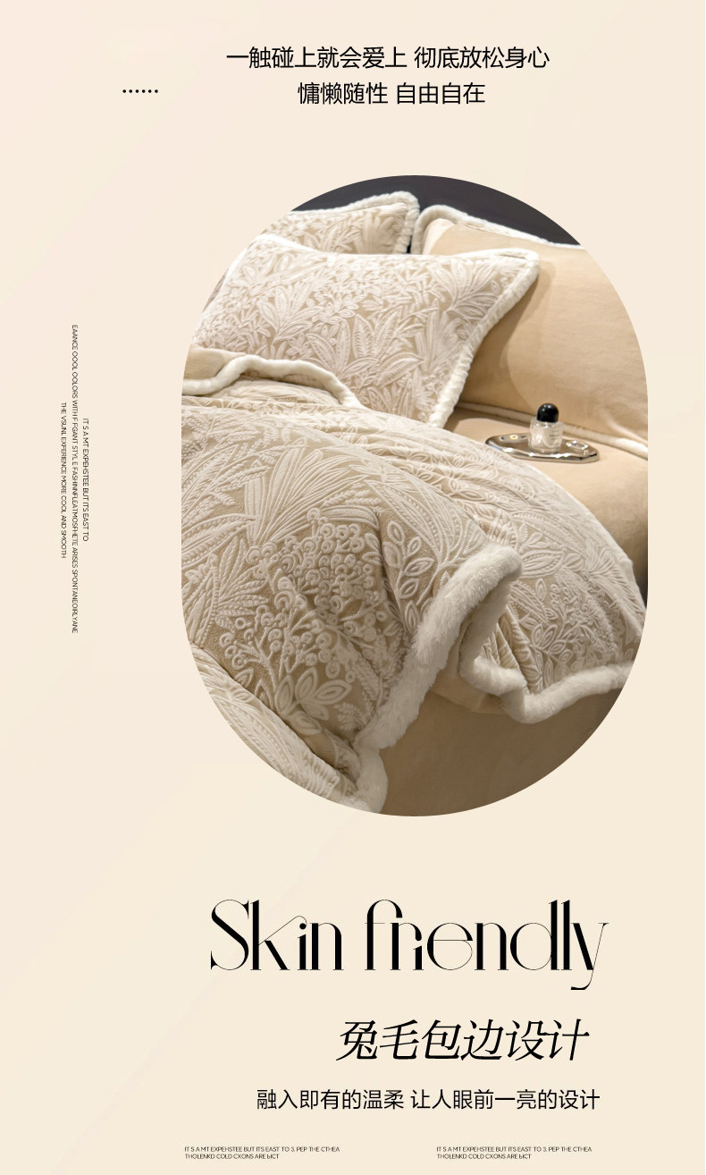 当前位置: 91家纺网 > 商品网购 > 床品套件 > 四件套 > 兔毛绒四件套 > 印季家纺 2025新款法式立体雕花绒兔毛包边四件套 山茶庄园-米黄