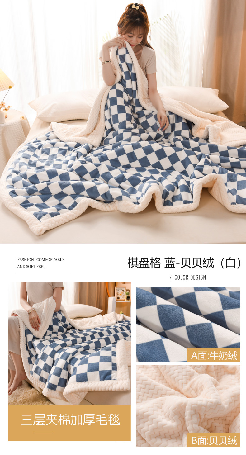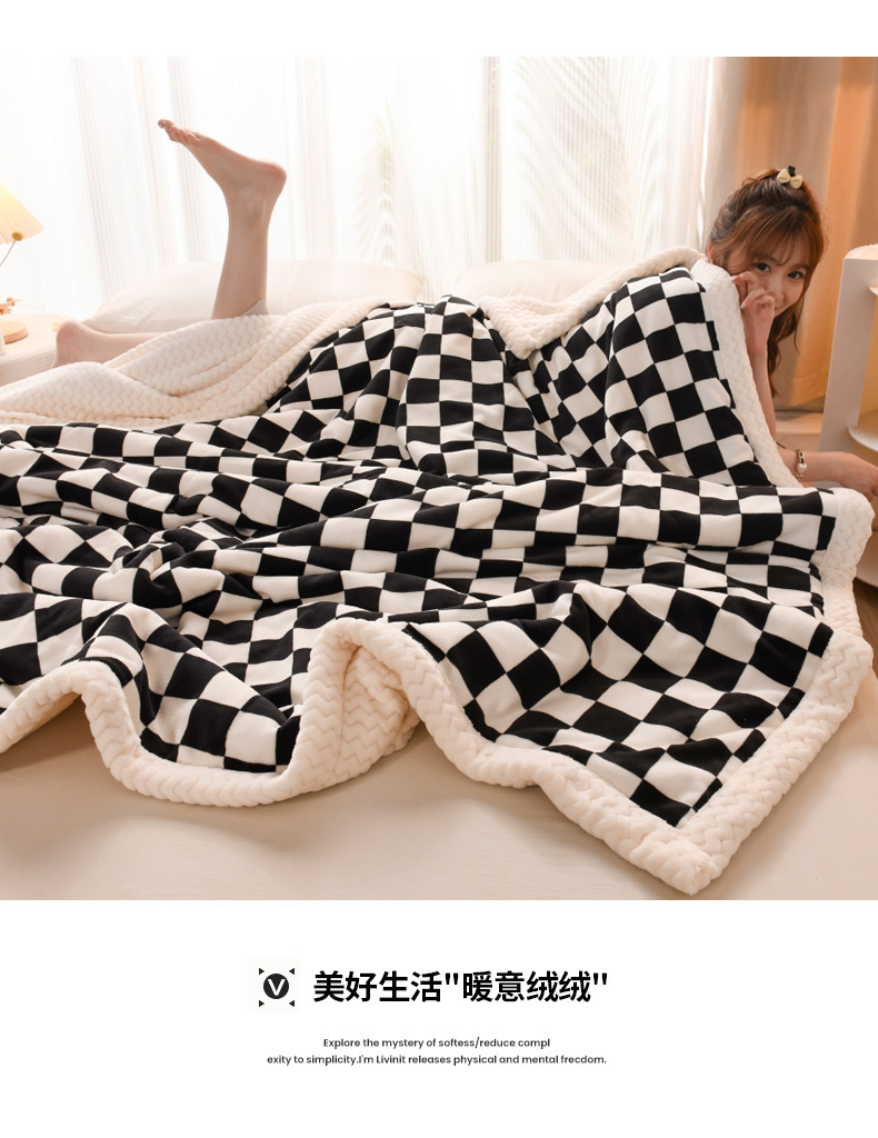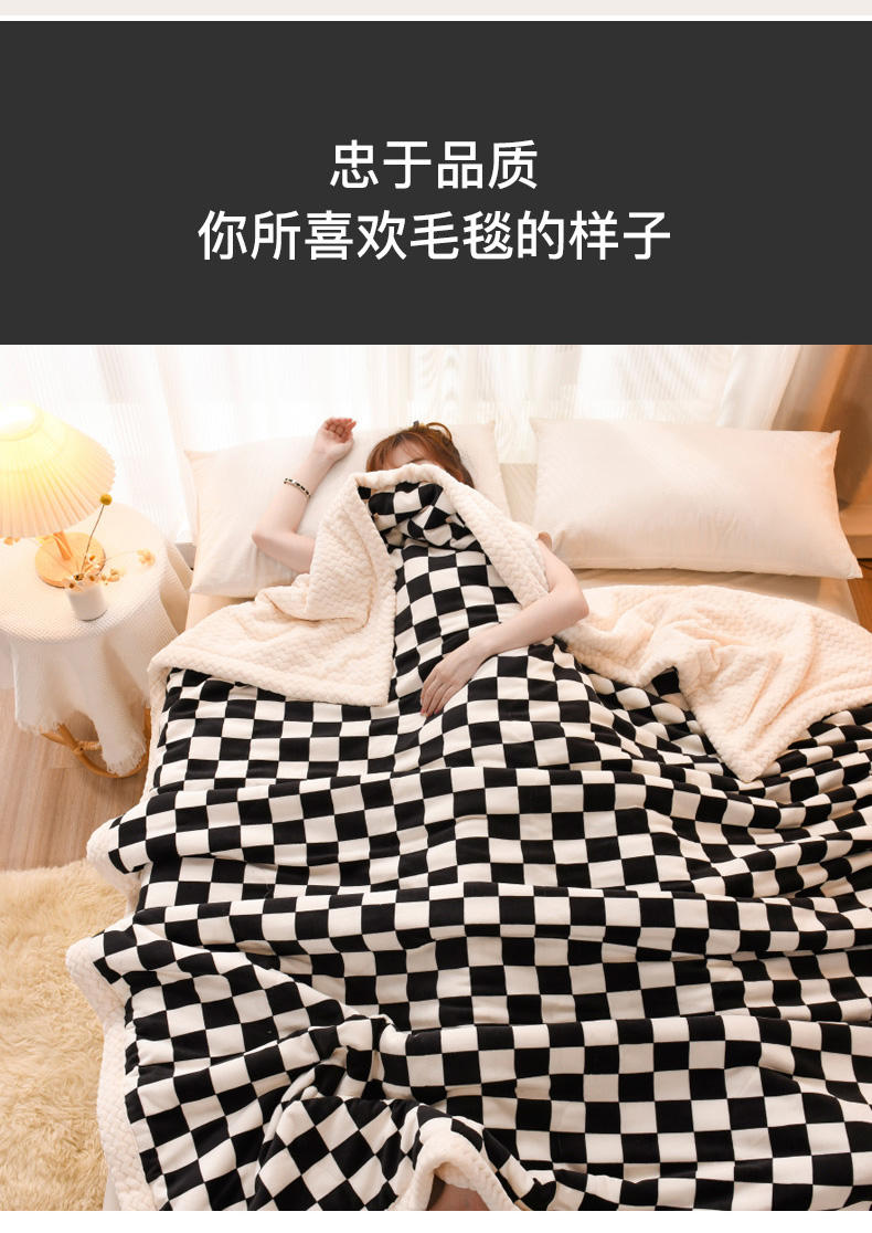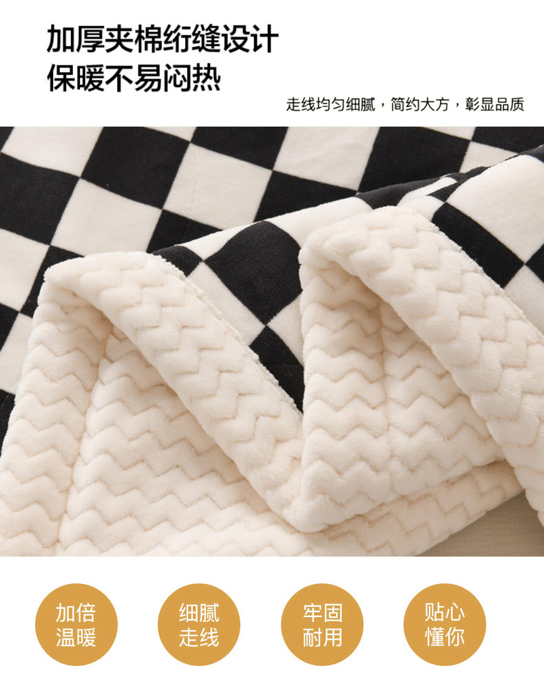 印季家纺 2025新款三层夹棉印花牛奶绒毛毯毯子 棋盘格-黑-贝贝绒