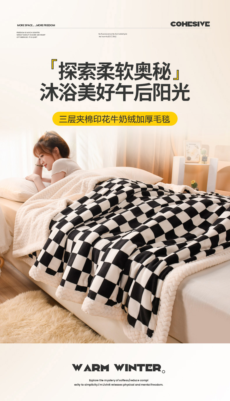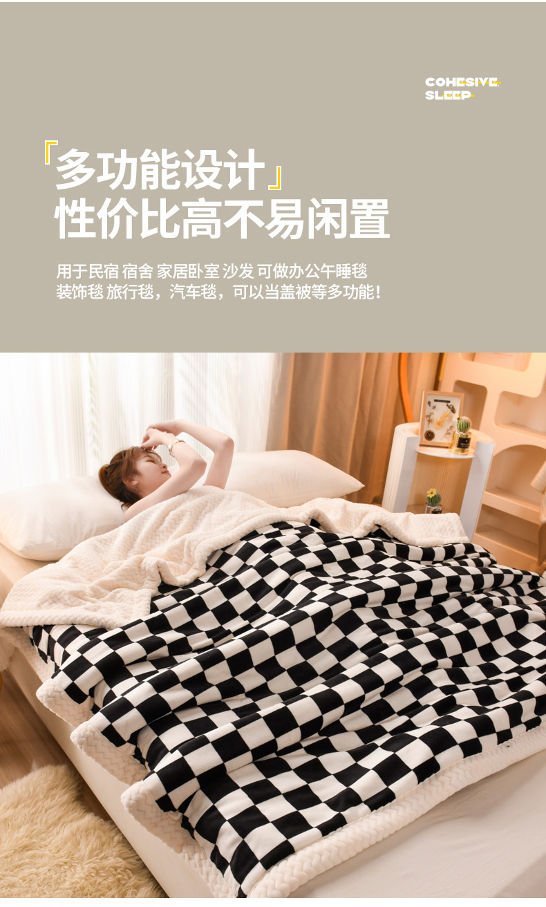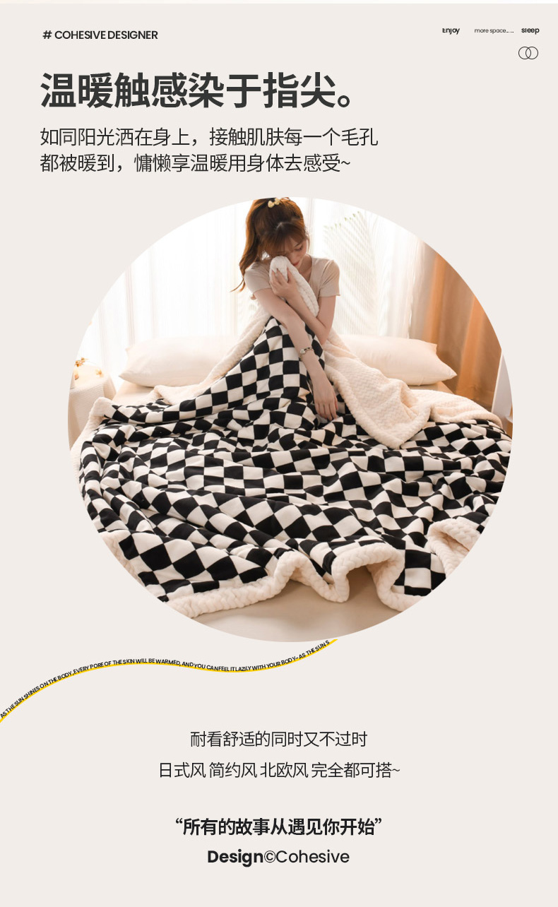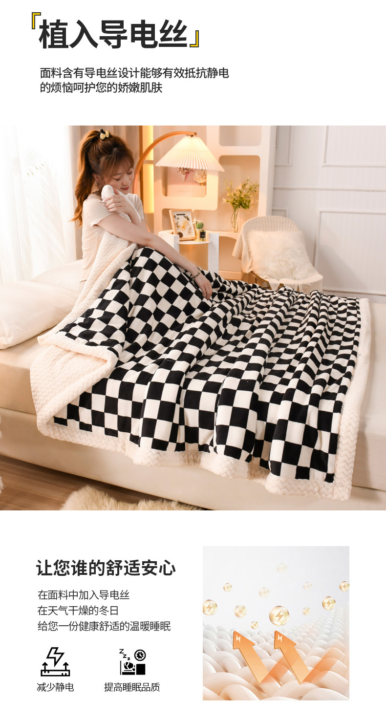 印季家纺 2025新款三层夹棉印花牛奶绒毛毯毯子 棋盘格-黑-贝贝绒