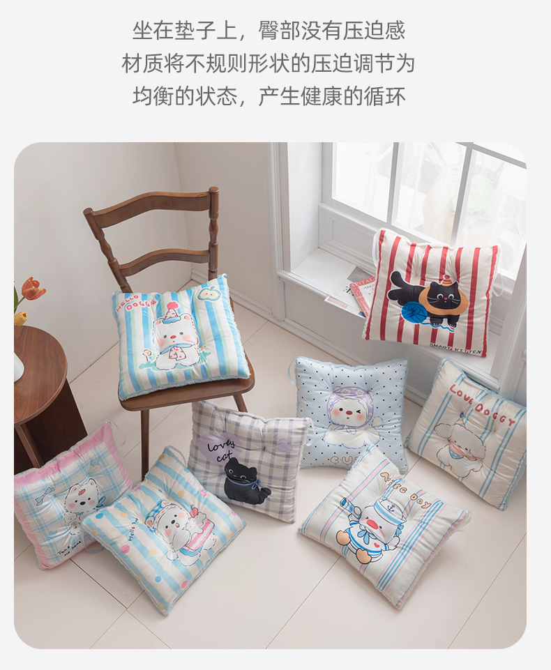 (总)博笔熊家纺 2025新款双面卡通坐垫,组合图仅做展示不可下单,格子西高地,格子小黑,海盗鸭,可爱西高地,甜品西高地,条纹西高地,围脖西高地,小黑毛线团