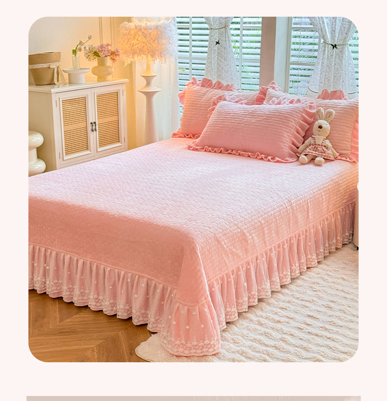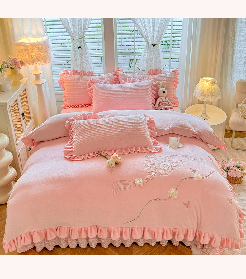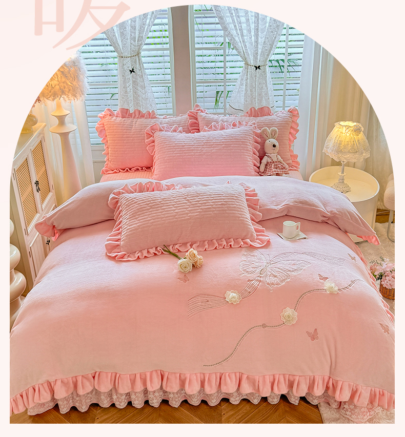 商品名称:唐人居 2025新款高克重牛奶绒花边夹棉四件套-蝴蝶纷飞 蝴蝶纷飞-粉色