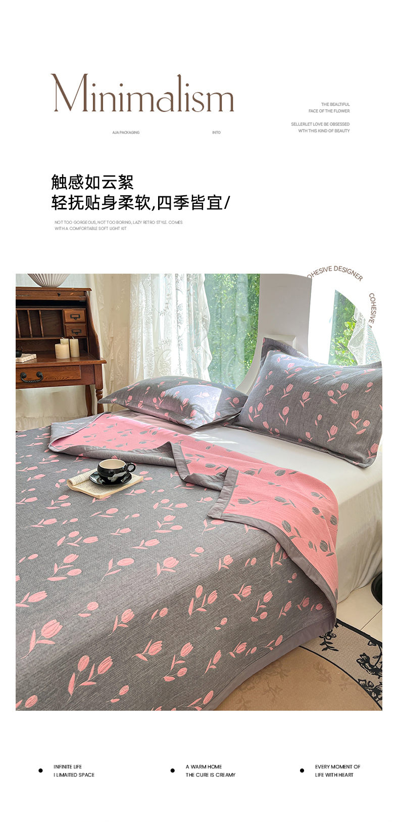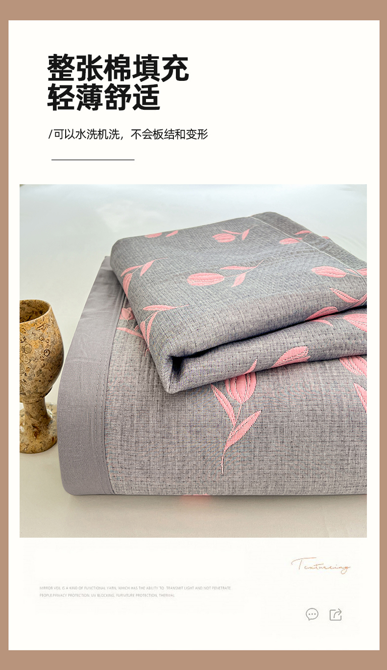 商品名称:yyds网供 2025新款A类色织全棉三层纱布床盖三件套喷气夹棉盖毯夏被厚床单多功能榻榻米风格一 相遇灰粉
