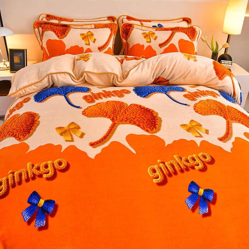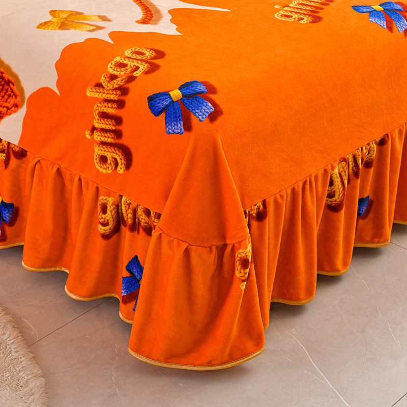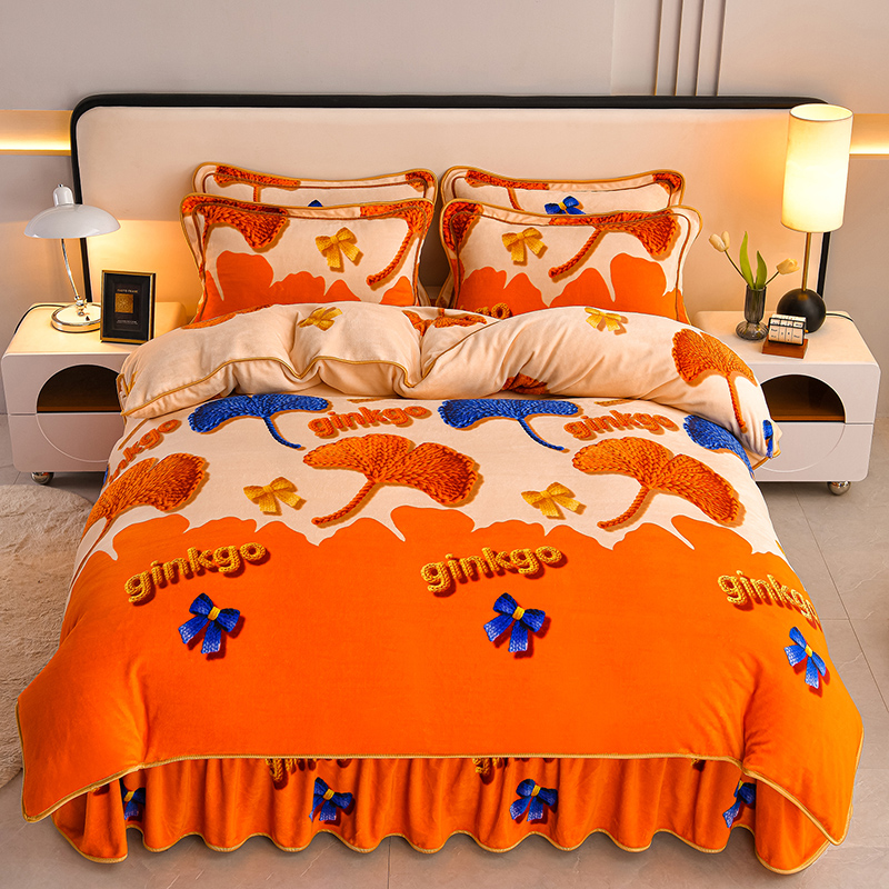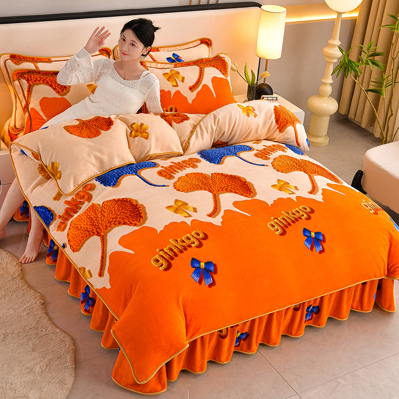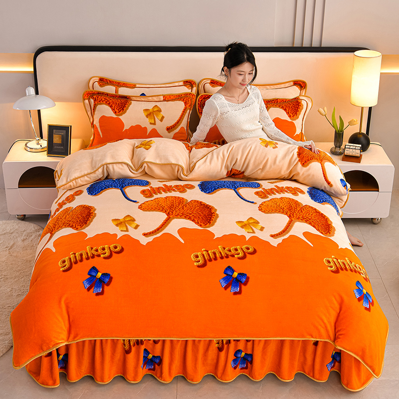 妮恒美 2025新款牛奶绒印花床裙款四件套法莱绒四件套珊瑚金貂绒四件套 杏运一生