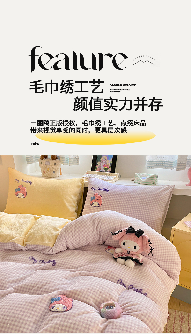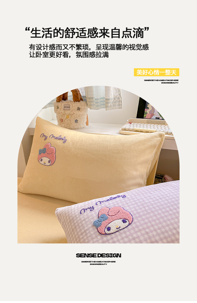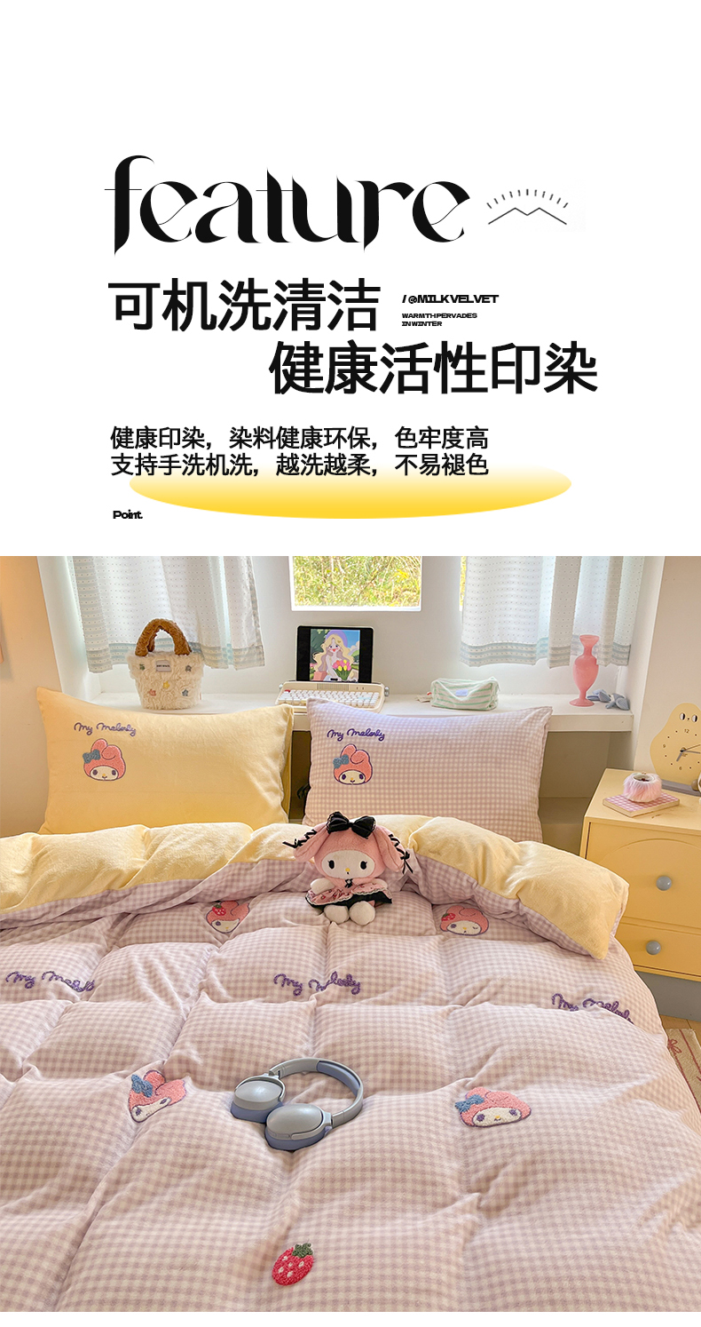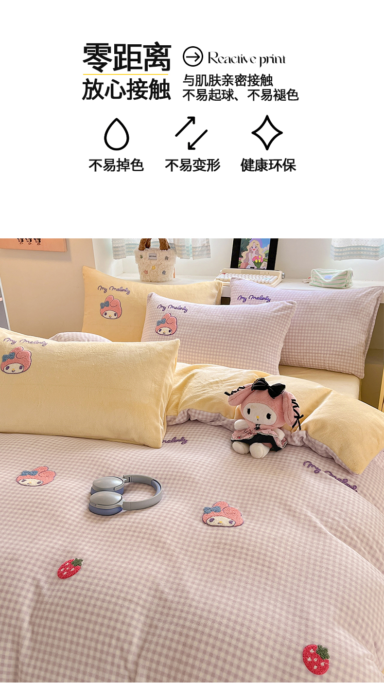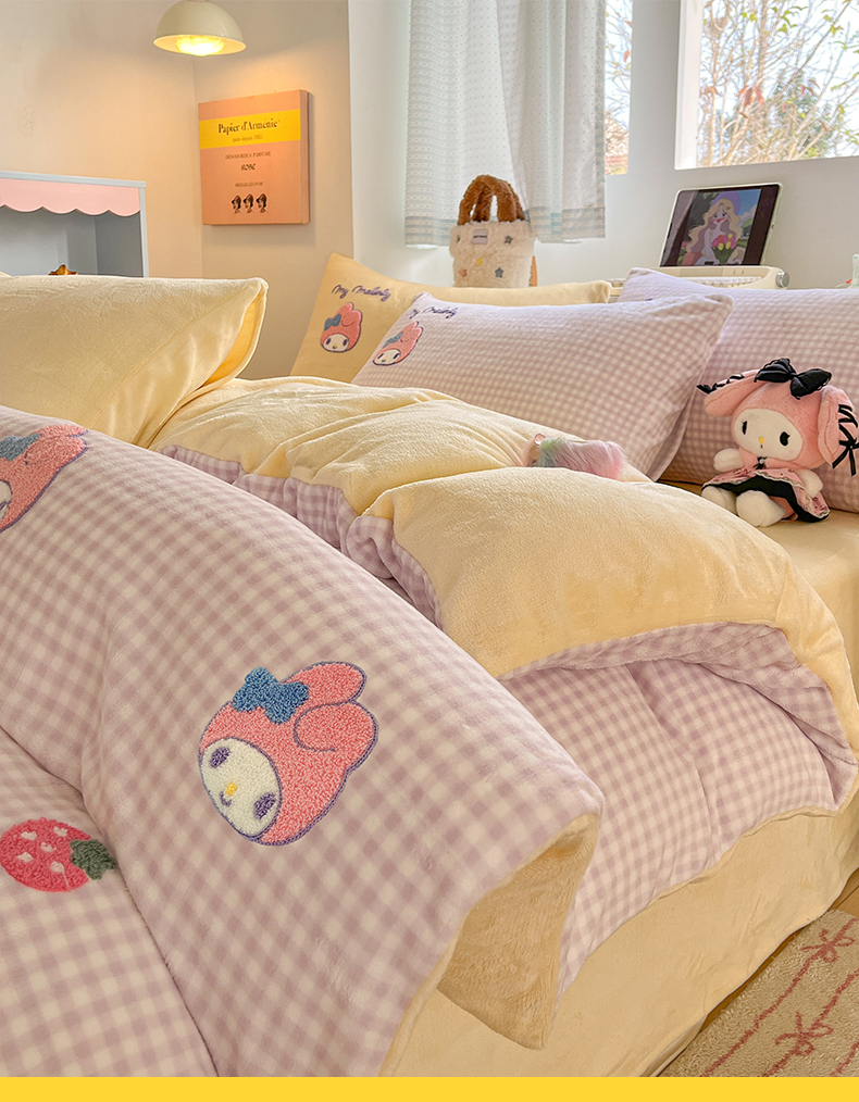 当前位置: 91家纺网 > 商品网购 > 床品套件 > 四件套 > 牛奶绒四件套 > 金爱家 2025新款A类三丽鸥授权毛巾绣混搭少女加厚牛奶绒系列四件套 绒毛巾绣-草莓美乐蒂紫黄