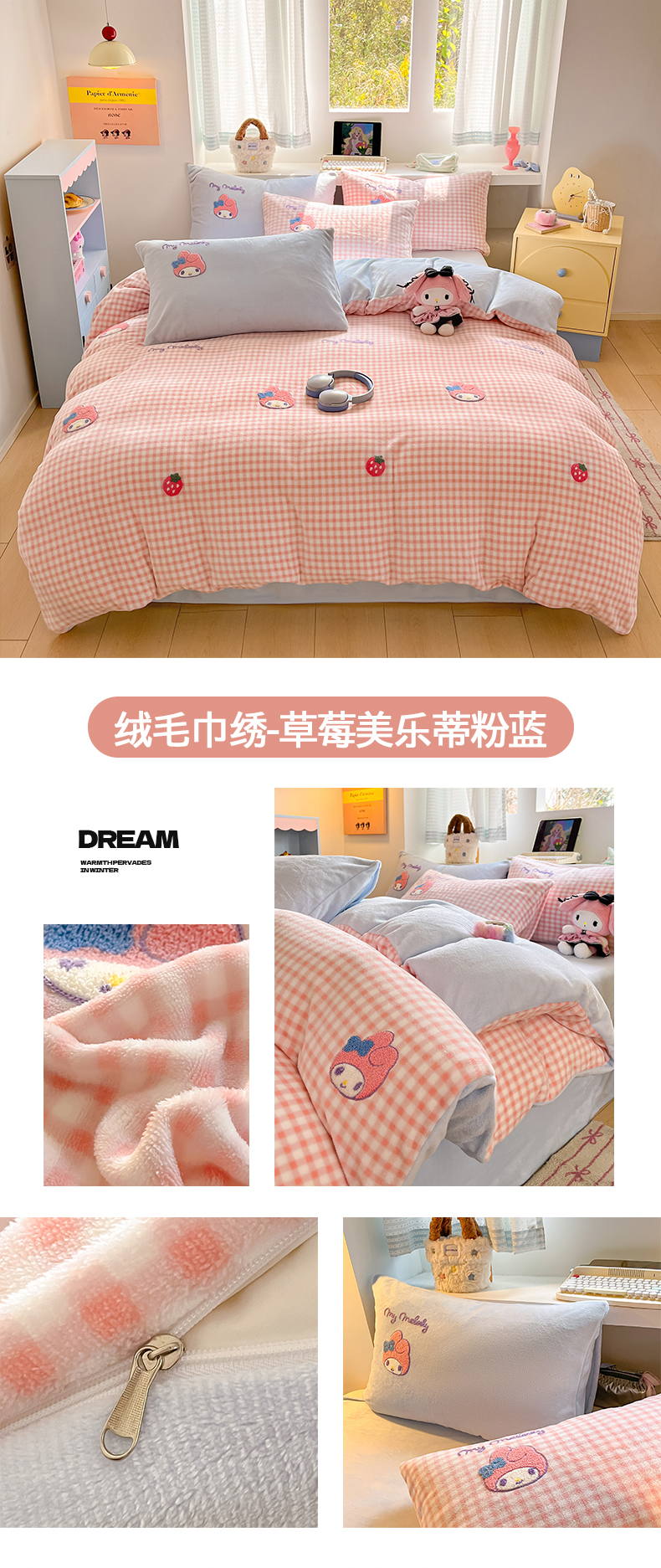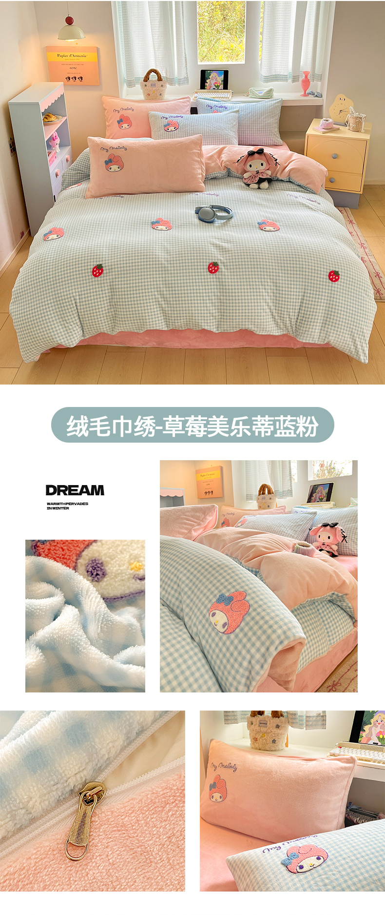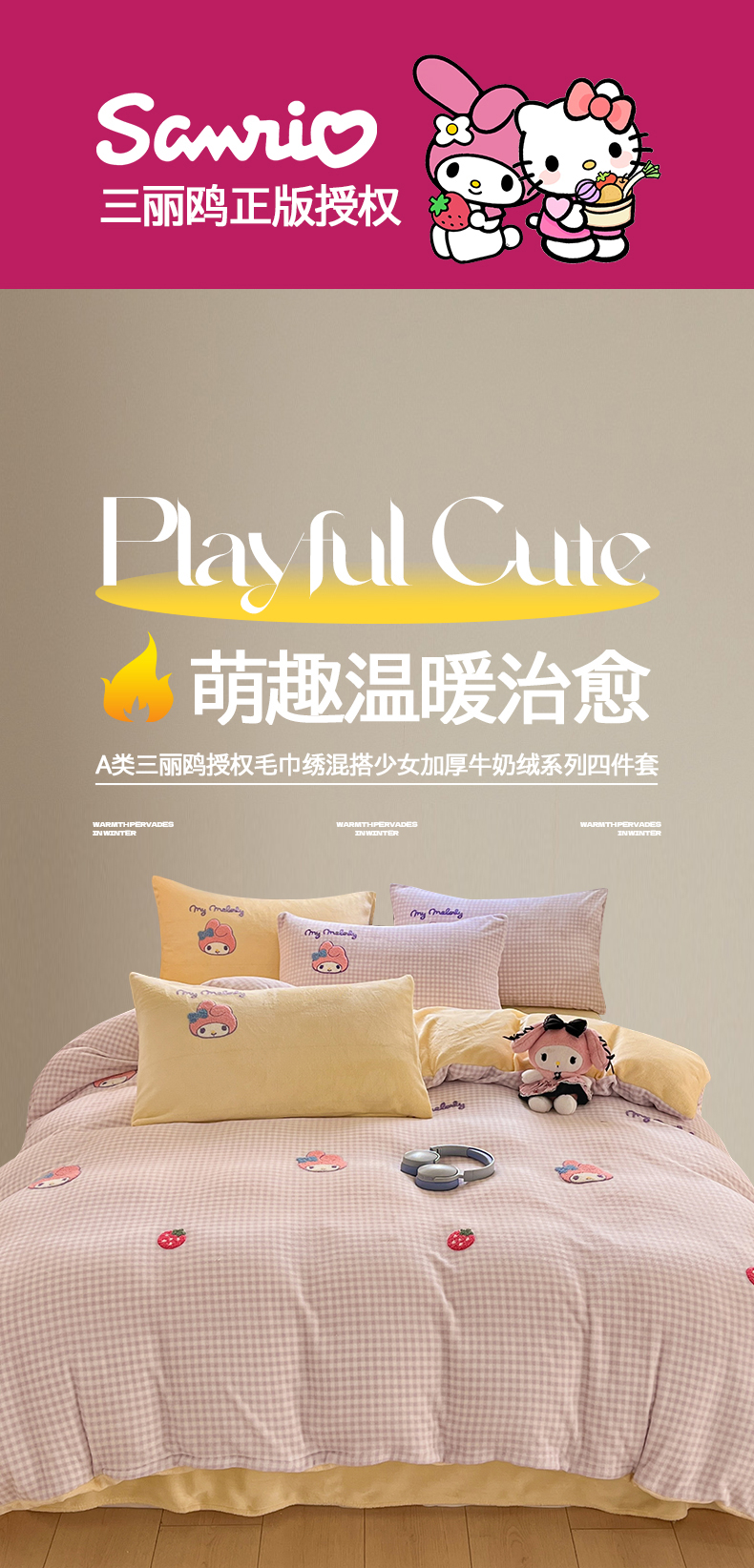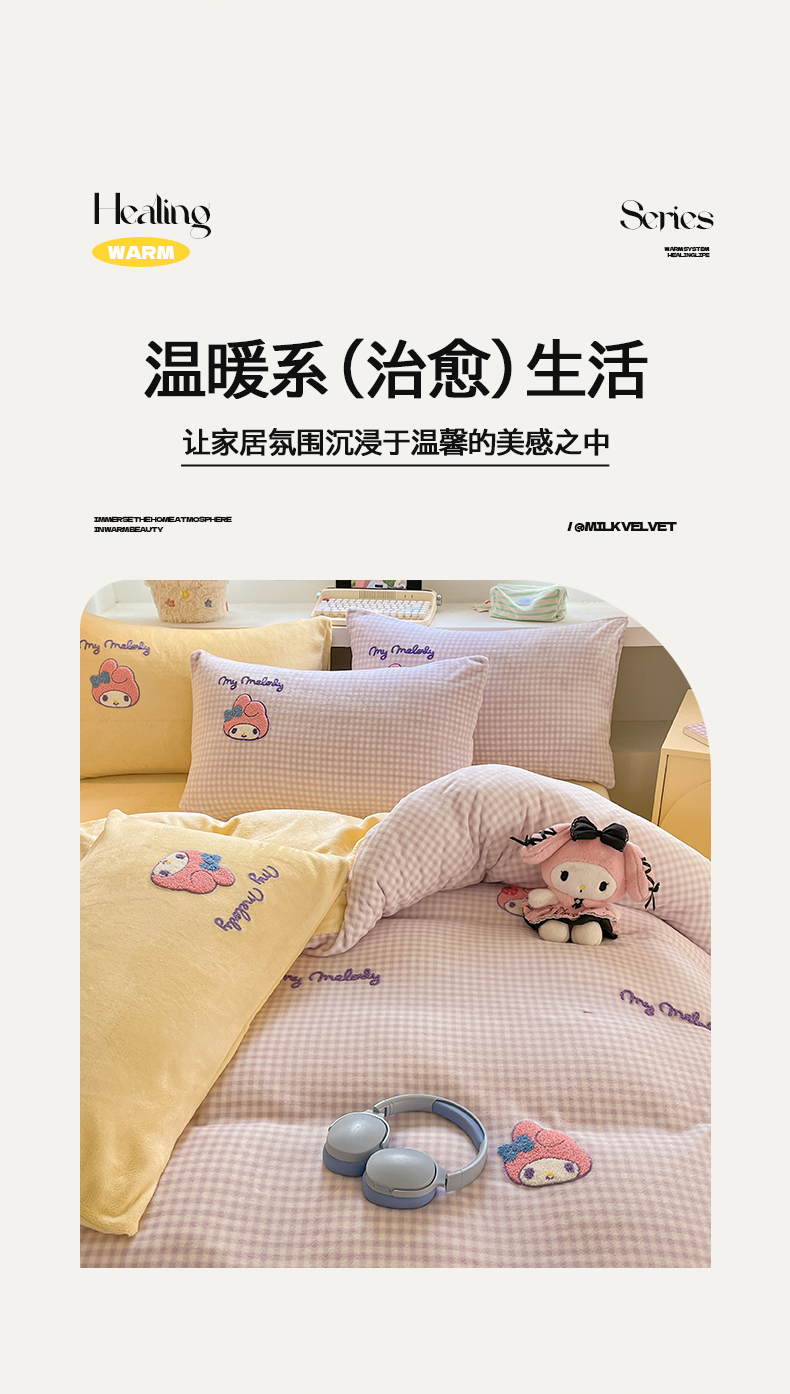 当前位置: 91家纺网 > 商品网购 > 床品套件 > 四件套 > 牛奶绒四件套 > 金爱家 2025新款A类三丽鸥授权毛巾绣混搭少女加厚牛奶绒系列四件套 绒毛巾绣-草莓美乐蒂紫黄