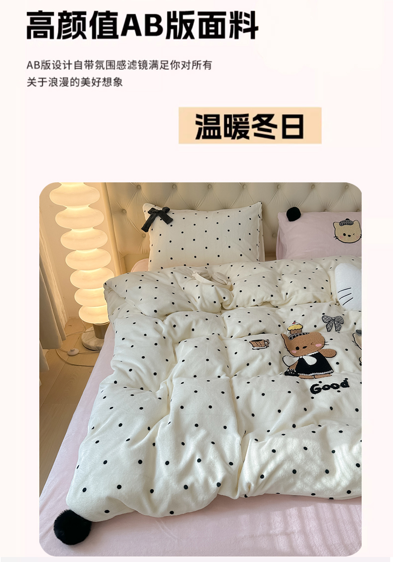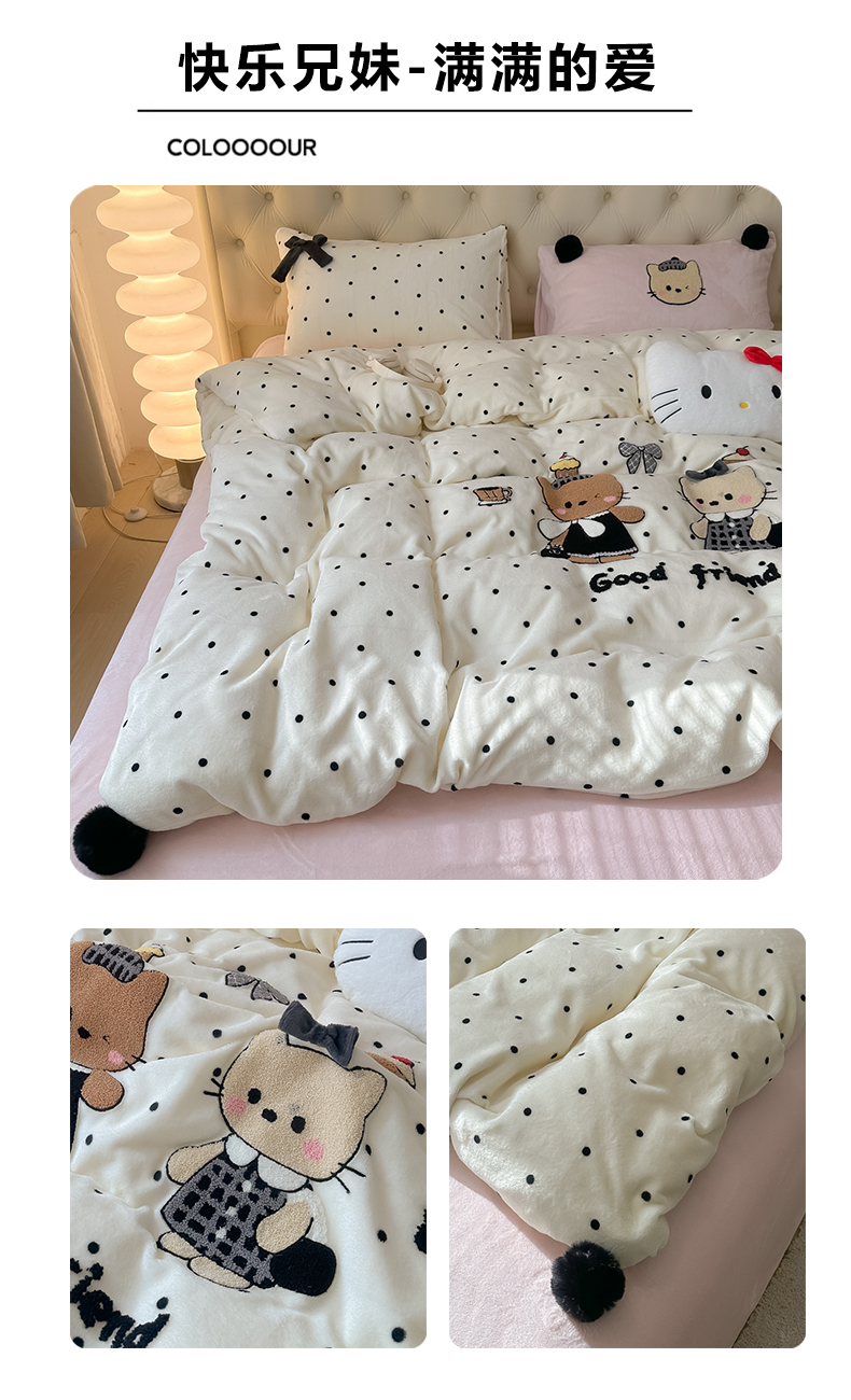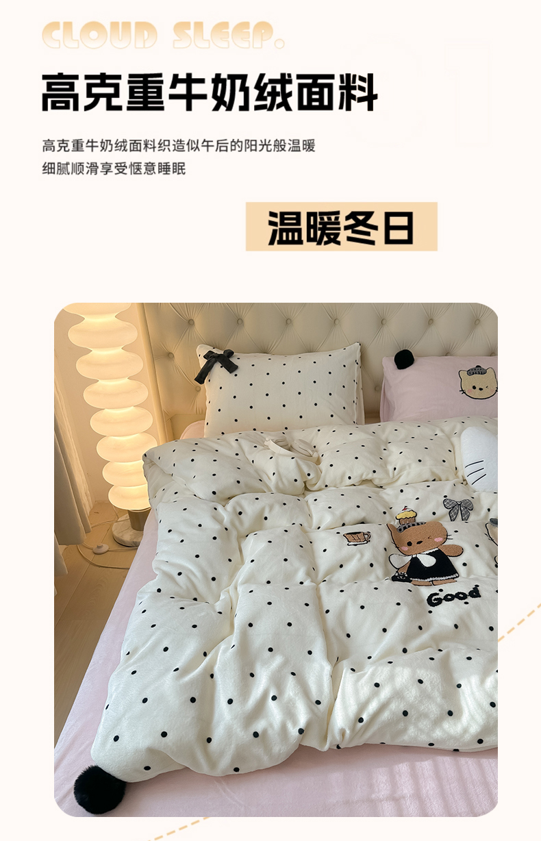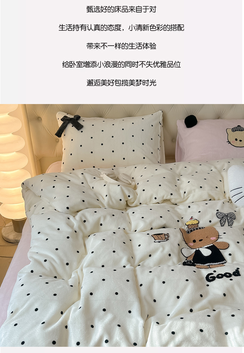 子钦家纺 2025秋冬新款暗黑系小红书同款加厚牛奶绒蝴蝶结款毛巾绣床单床笠四件套-快乐兄妹场景一 快乐兄妹-奶白波点