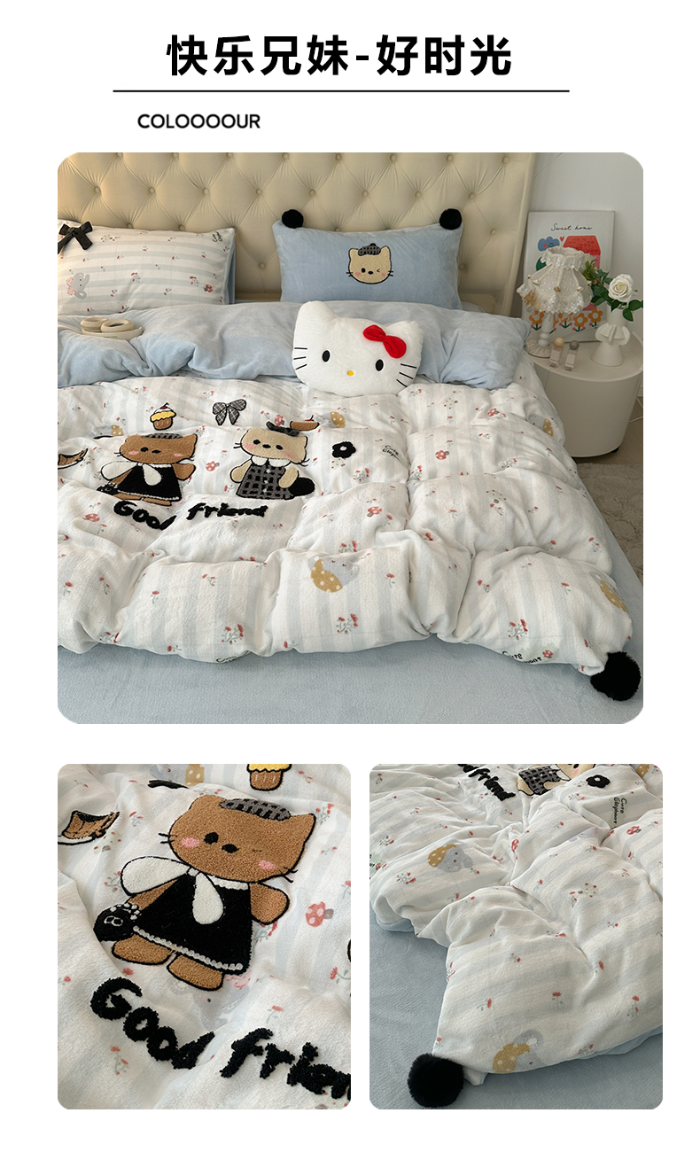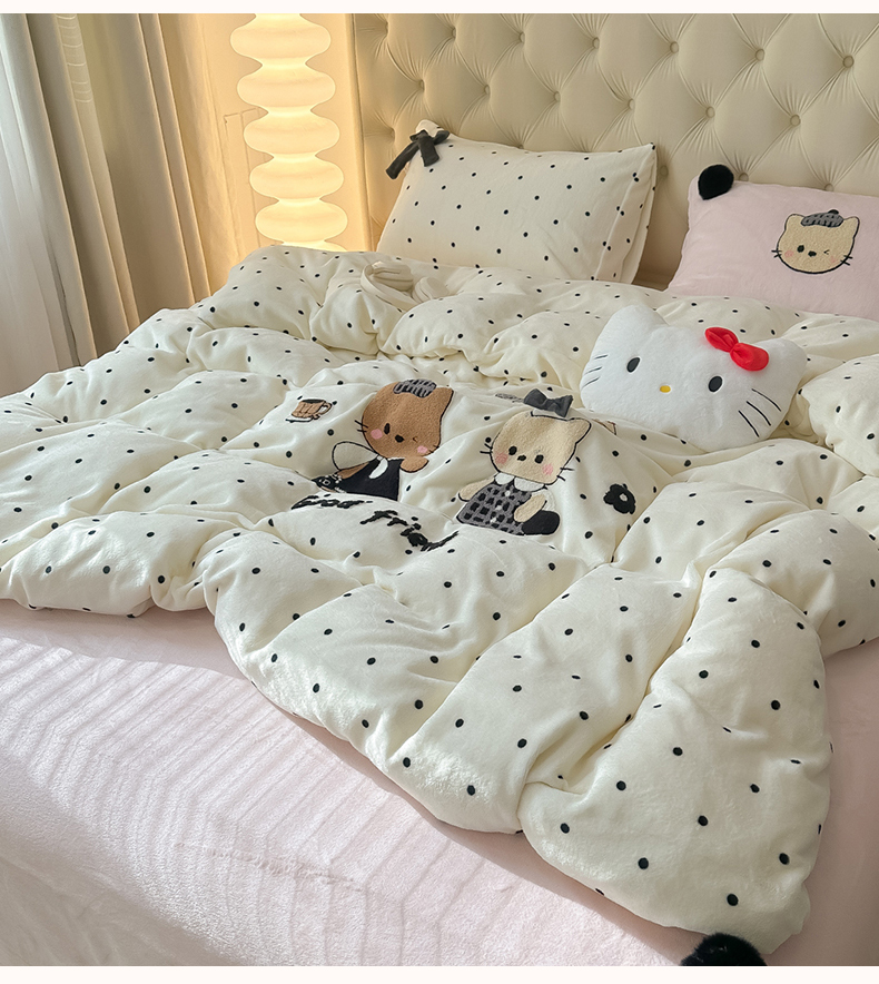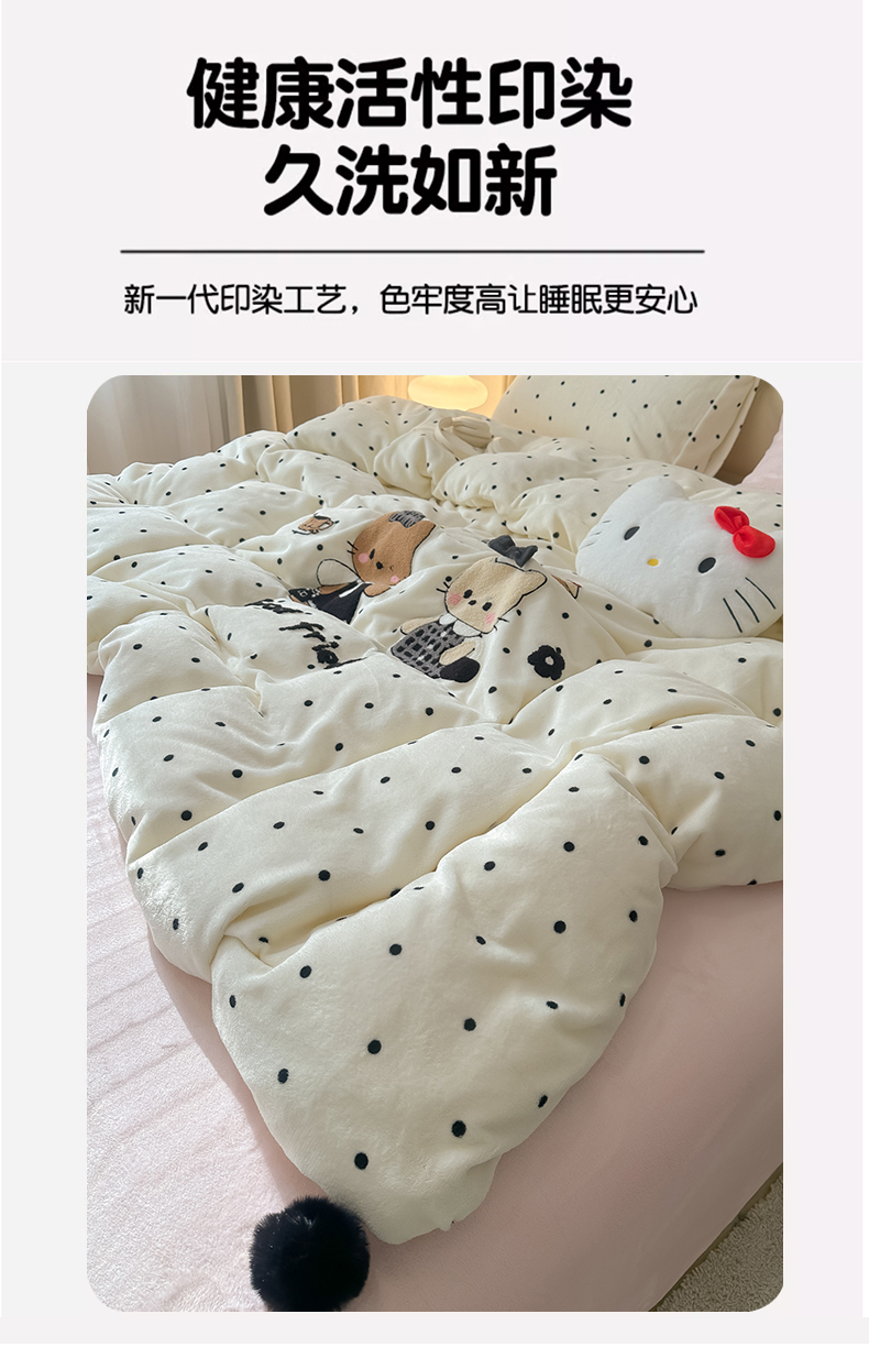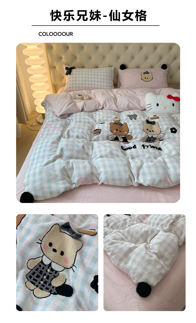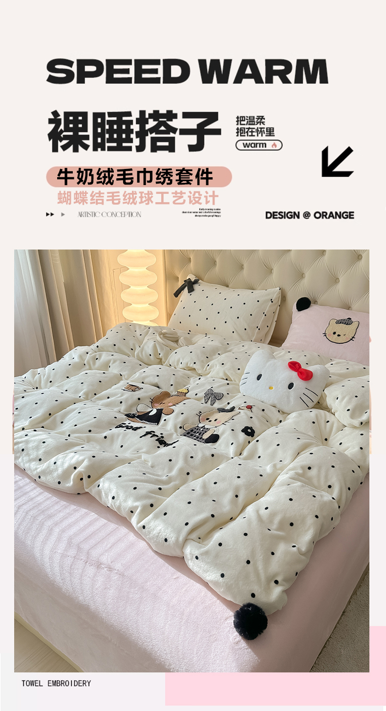 子钦家纺 2025秋冬新款暗黑系小红书同款加厚牛奶绒蝴蝶结款毛巾绣床单床笠四件套-快乐兄妹场景一 快乐兄妹-奶白波点