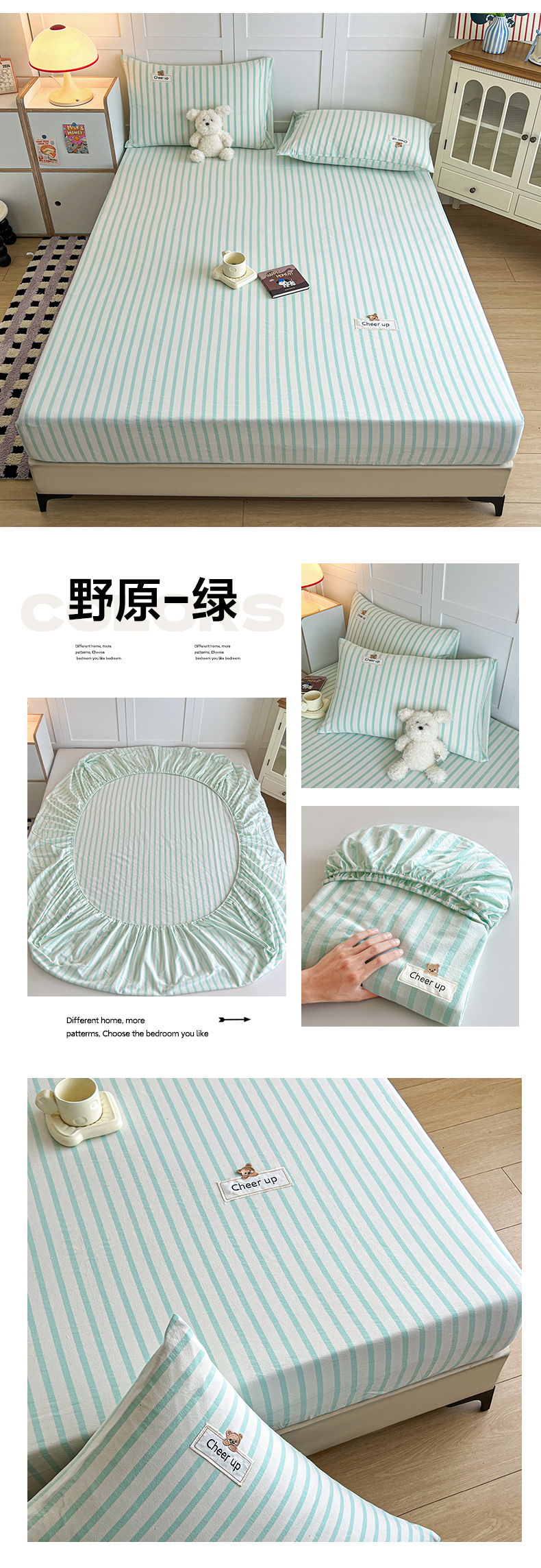 • 91家纺网 家纺一手货源 找家纺 佳笠家居 2026年新款kimi熊a类全棉色织水洗棉大尺寸单床笠 野原-绿