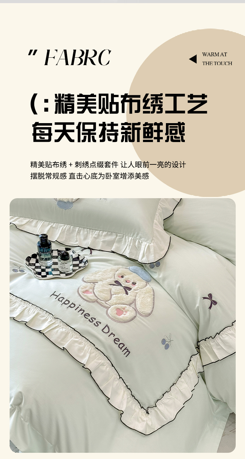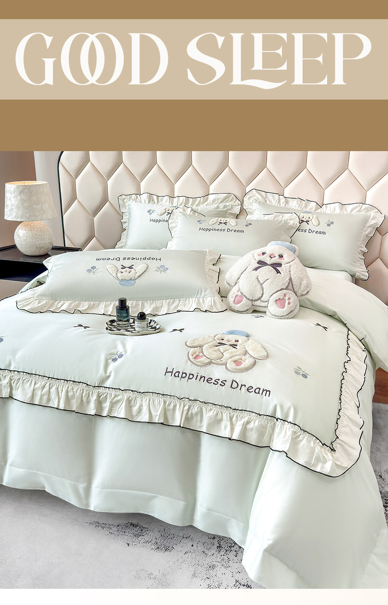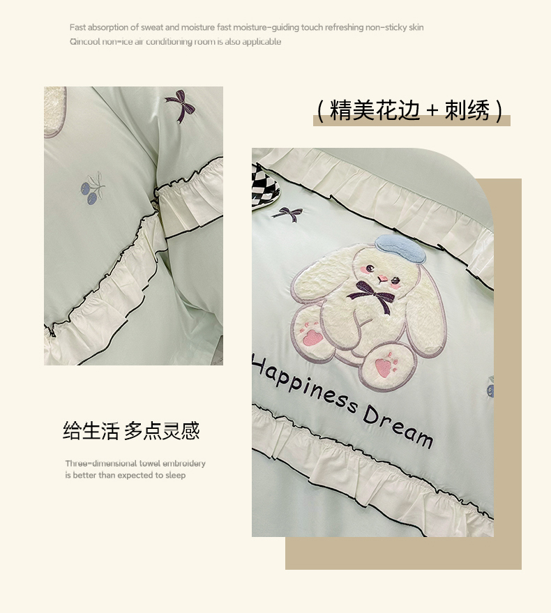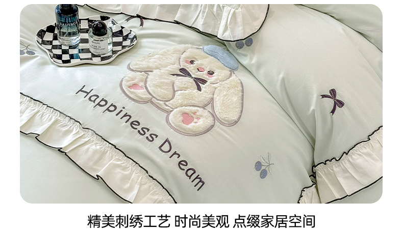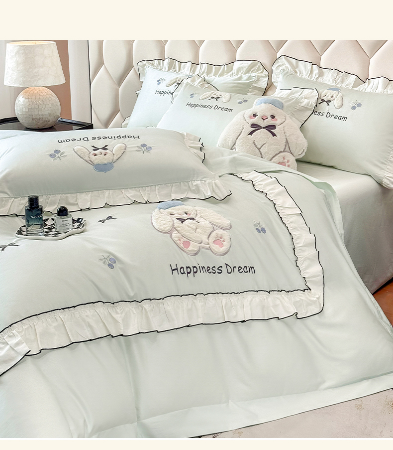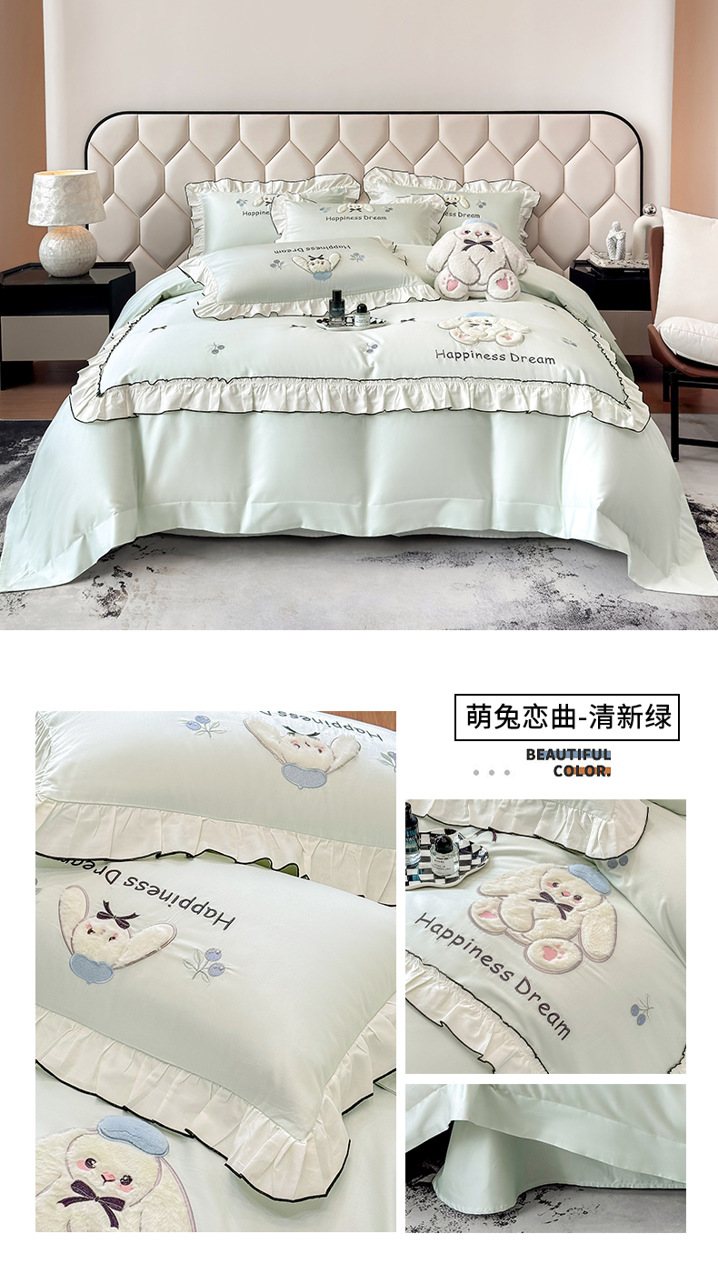商品名称:丞音家纺 2026新款卡通风少女心A类50s双股100支贡缎长绒棉四件套刺绣全棉被套绣花床笠高档礼盒装 萌兔恋曲-清新绿
