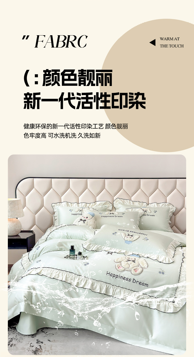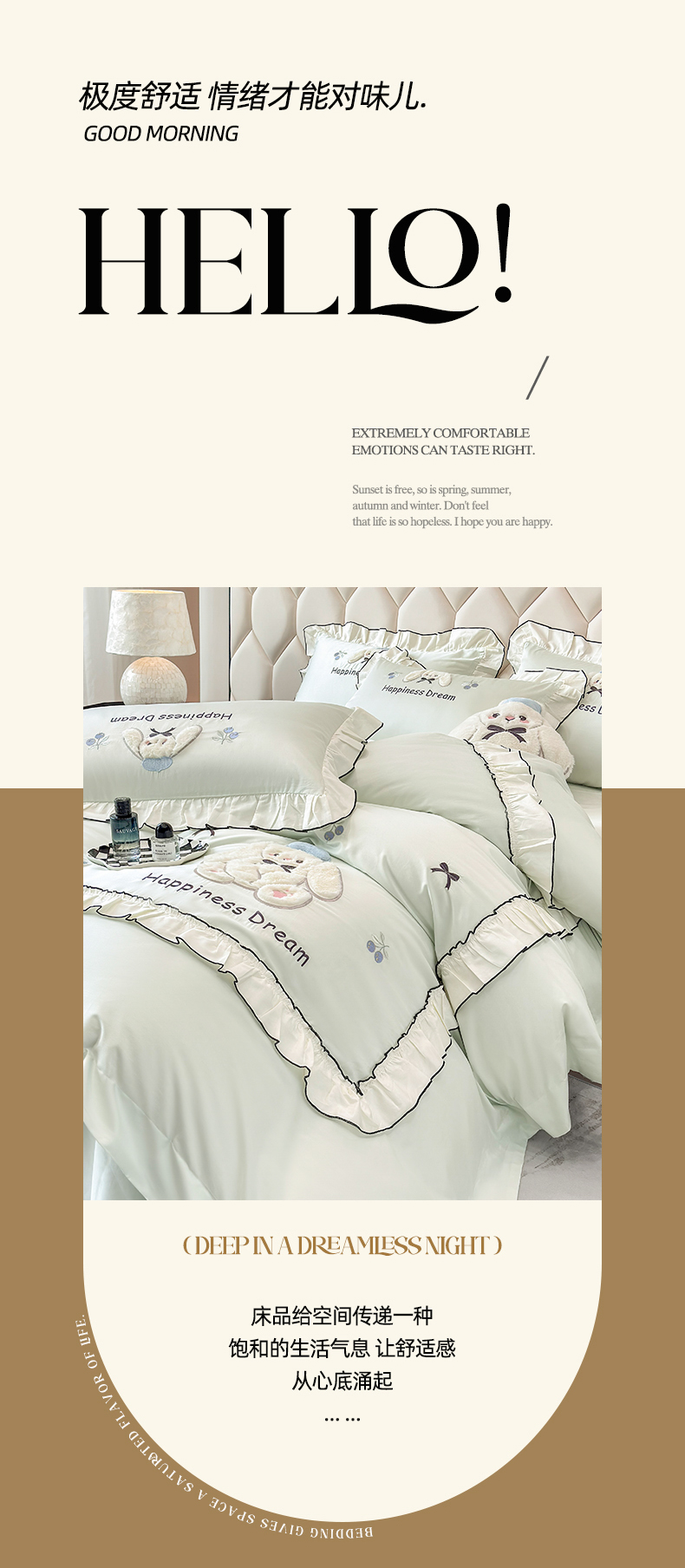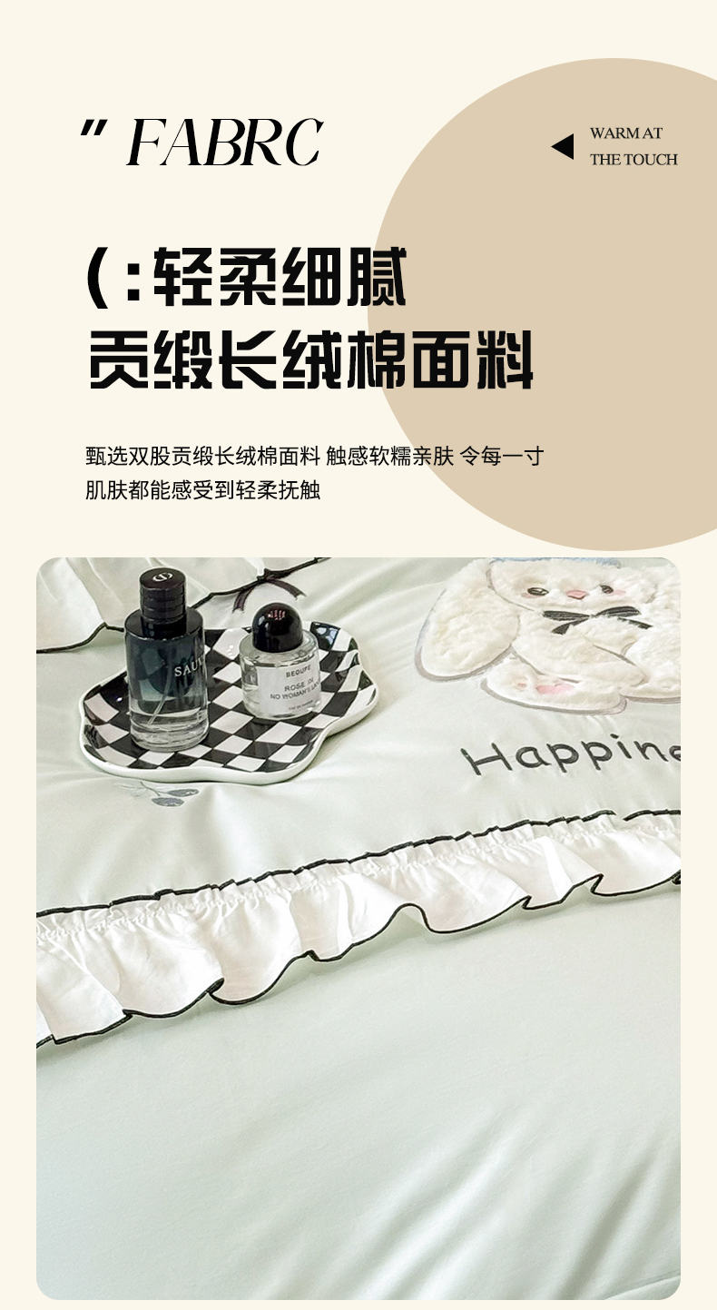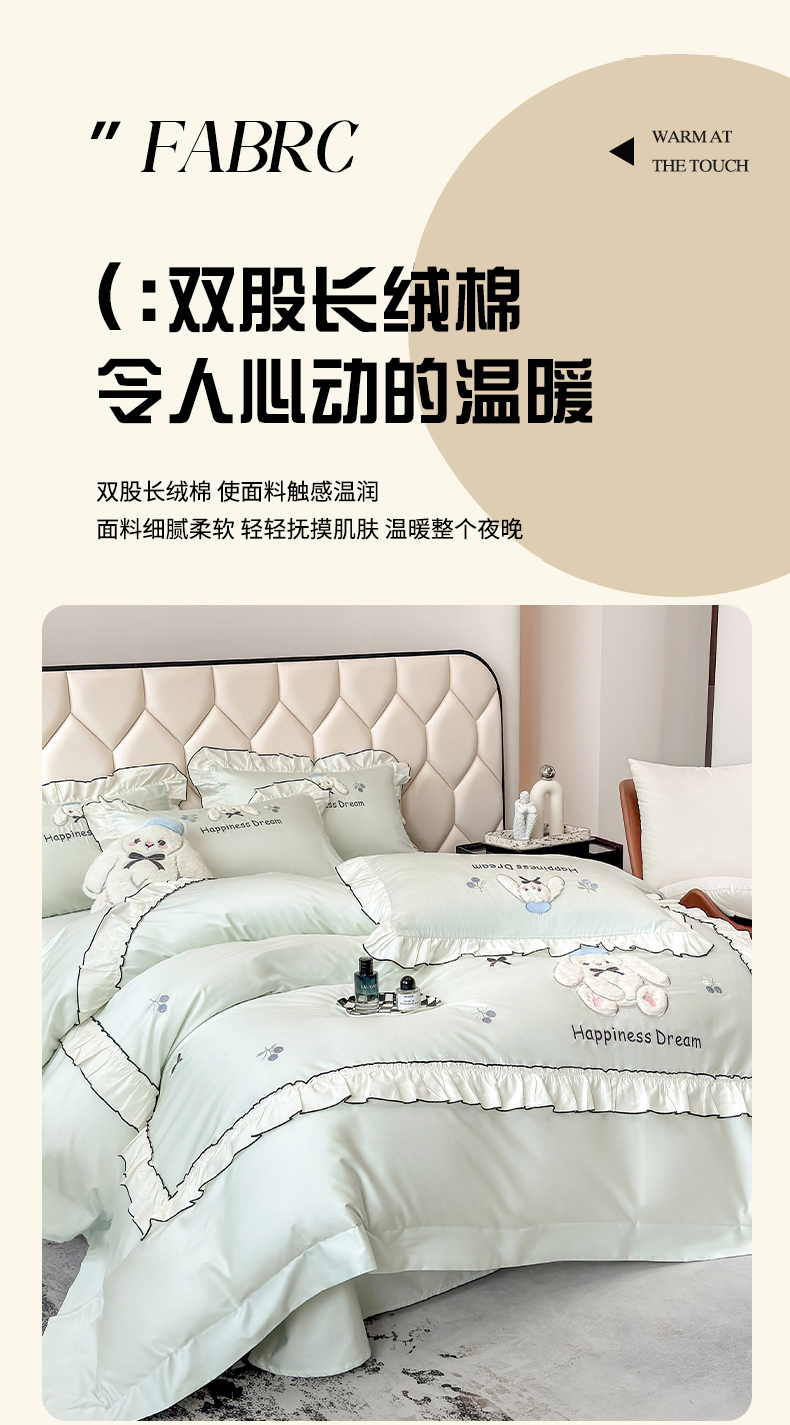 商品名称:丞音家纺 2026新款卡通风少女心A类50s双股100支贡缎长绒棉四件套刺绣全棉被套绣花床笠高档礼盒装 萌兔恋曲-清新绿