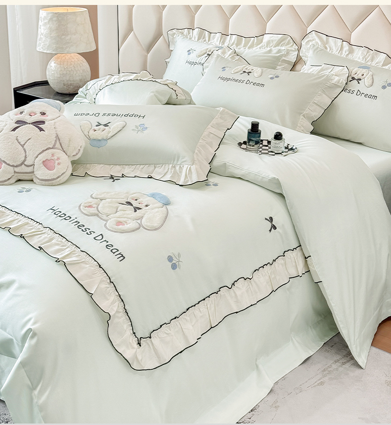 丞音家纺 2026新款卡通风少女心A类50s双股100支贡缎长绒棉四件套刺绣全棉被套绣花床笠高档礼盒装 萌兔恋曲-清新绿