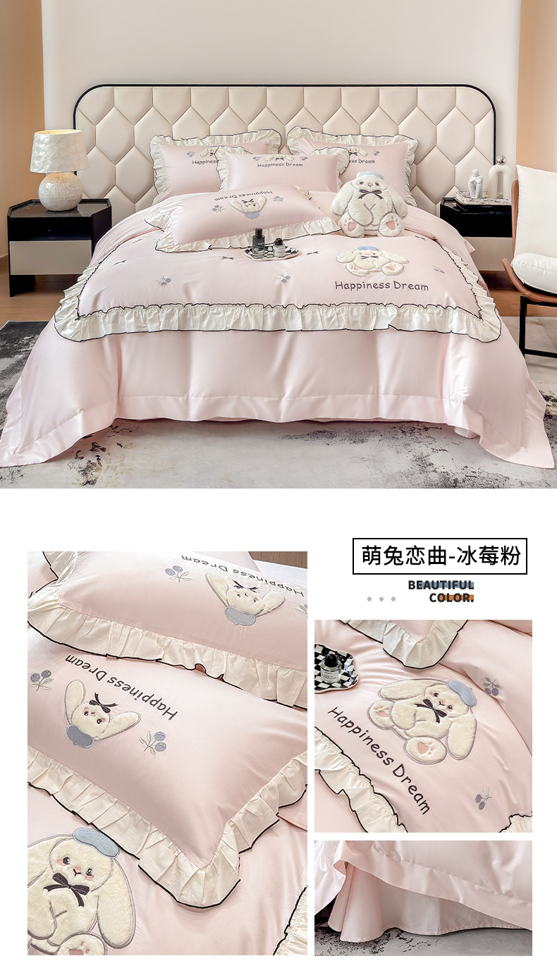 (总)丞音家纺 2026新款卡通风少女心A类50s双股100支贡缎长绒棉四件套刺绣全棉被套绣花床笠高档礼盒装,萌兔恋曲-冰莓粉,萌兔恋曲-迷雾蓝,萌兔恋曲-清新绿,萌兔恋曲-香芋紫