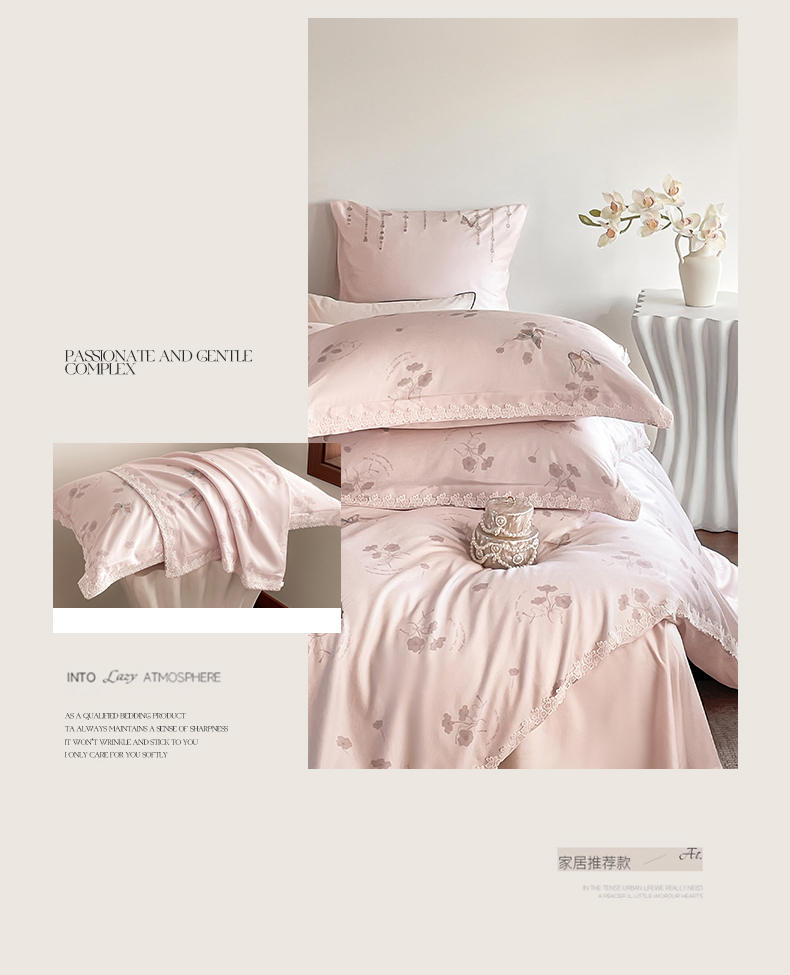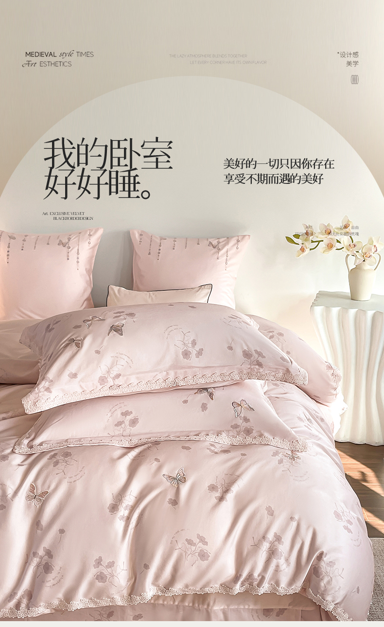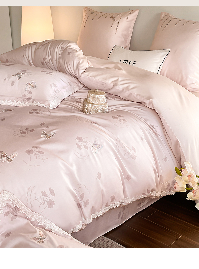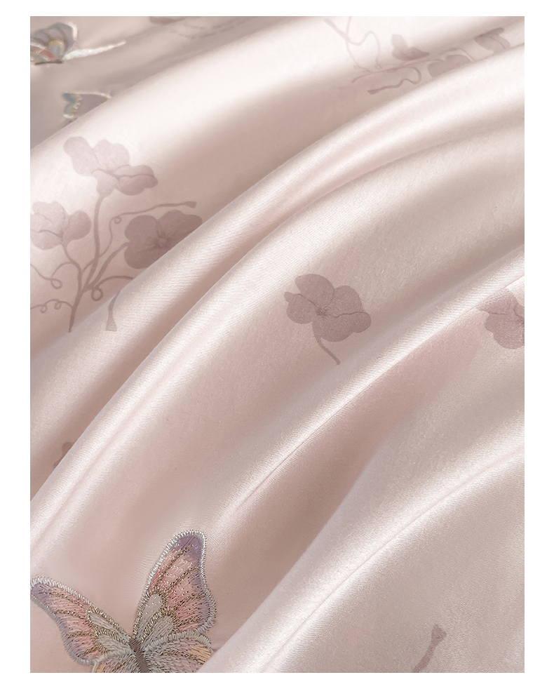 当前位置: 91家纺网 > 商品网购 > 床品套件 > 四件套 > 长绒棉四件套 > (总)蓝米卡夫 2026春季新款-60S长绒棉贡缎蝴蝶刺绣花边系列四件套-福蝶吉祥(礼盒)-拍摄风格1