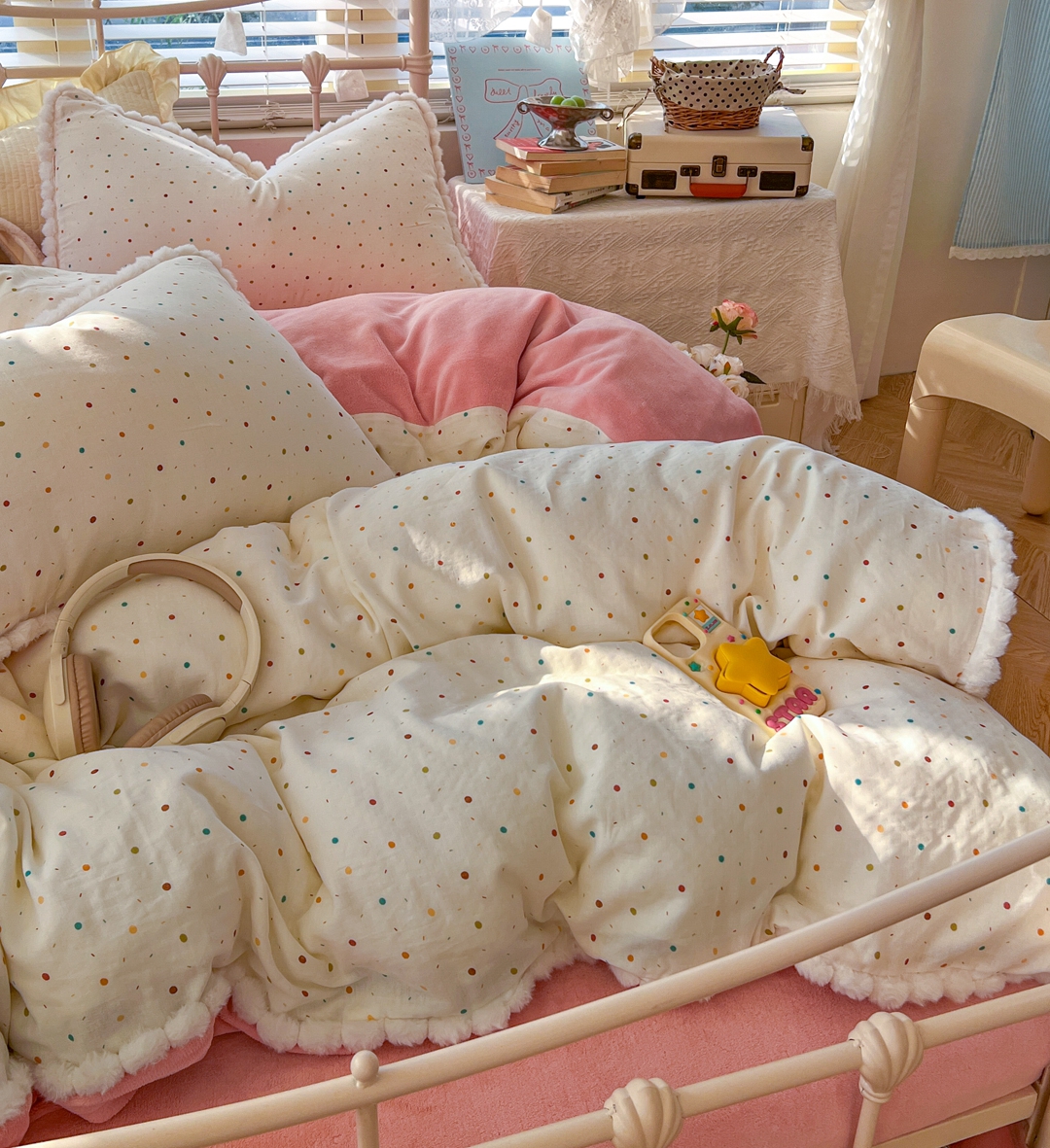 当前位置: 91家纺网 > 商品网购 > 床品套件 > 四件套 > 其它四件套 > 金丝鸟家纺 2026新款全棉双层纱加牛奶绒毛球花边四件套 毛球小黑点点