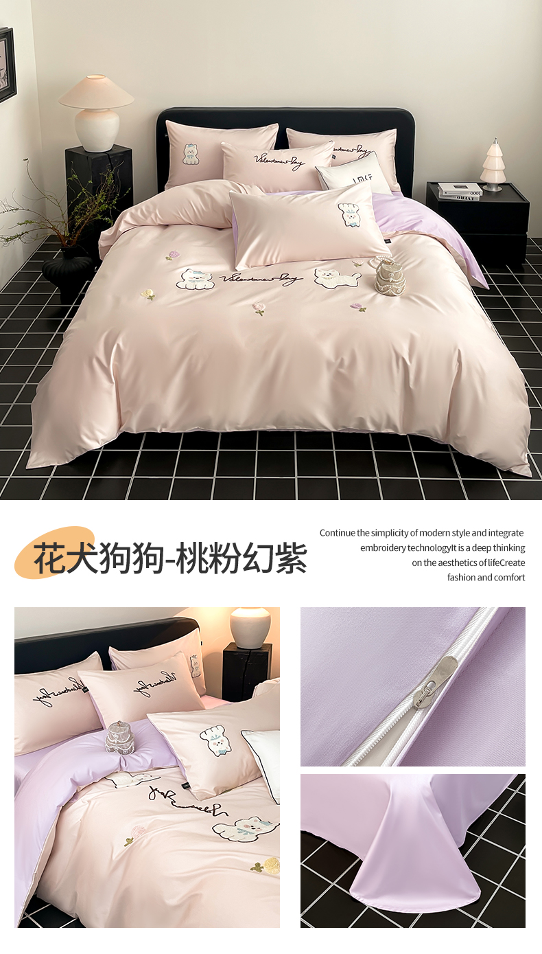 (总)蓝米卡夫 2026春季新款-100S长绒棉毛巾绣系列四件套-花犬狗狗(礼盒),花犬狗狗-桃粉幻紫,花犬狗狗-芝士粉芋