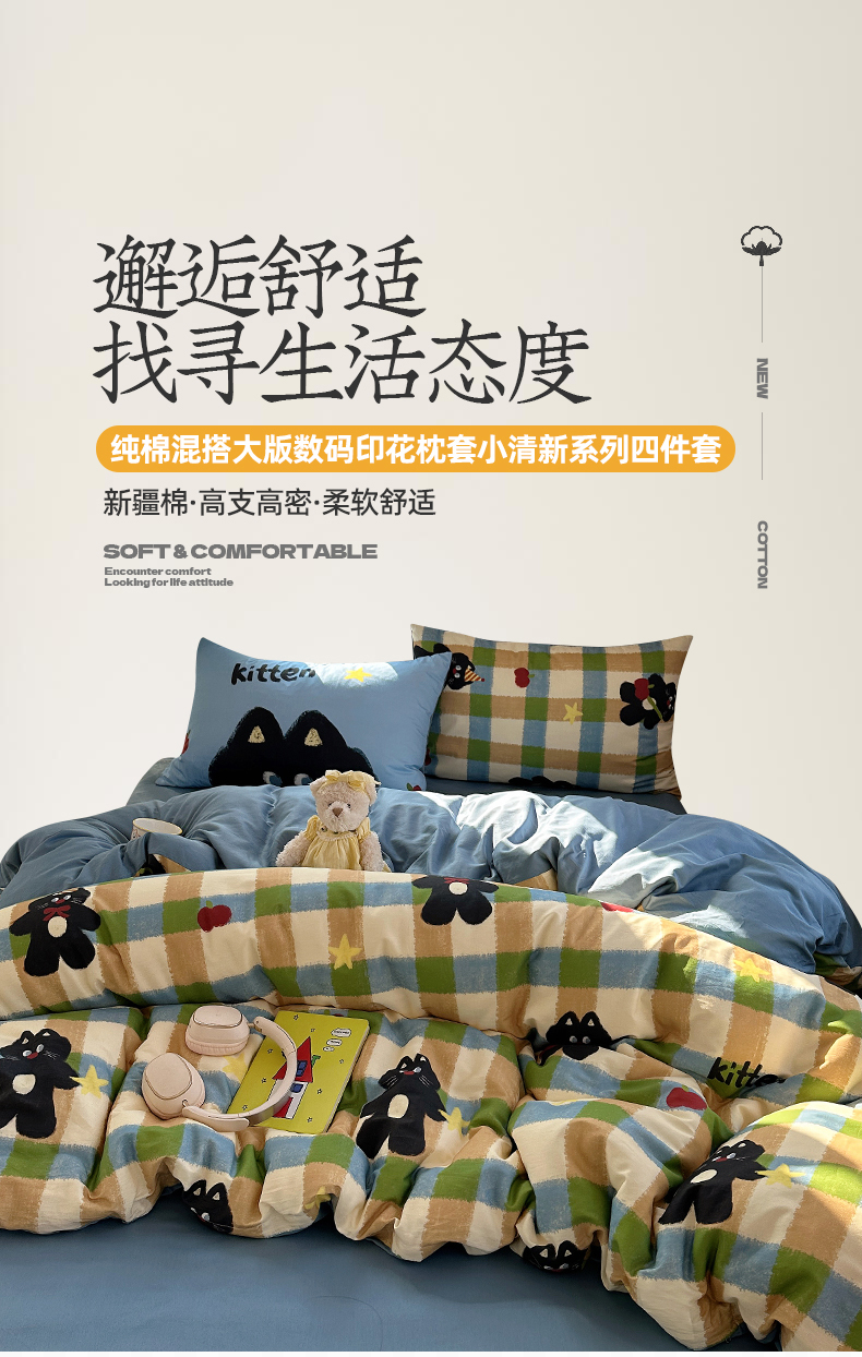 桃子家居 2026新款纯棉混搭大版数码印花枕套小清新猫咪可爱系列四件套 棉混搭-苹果哈曼猫