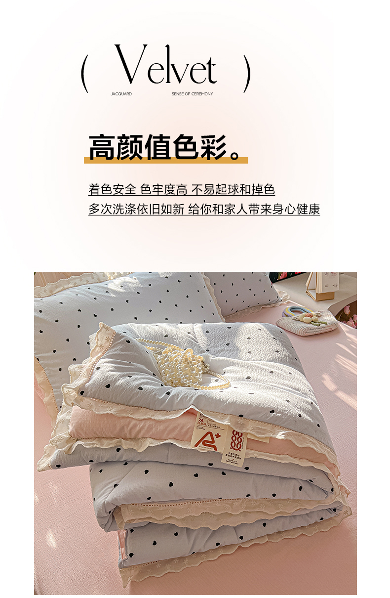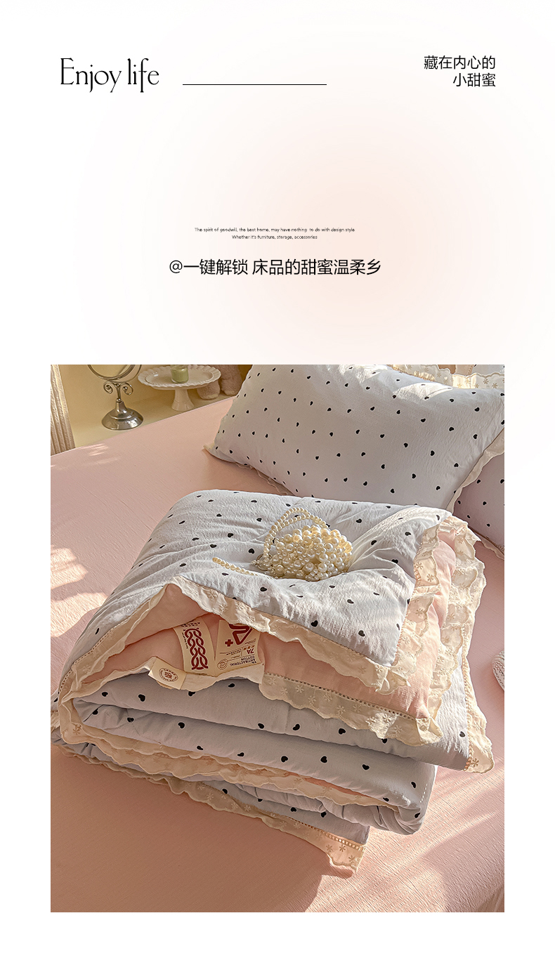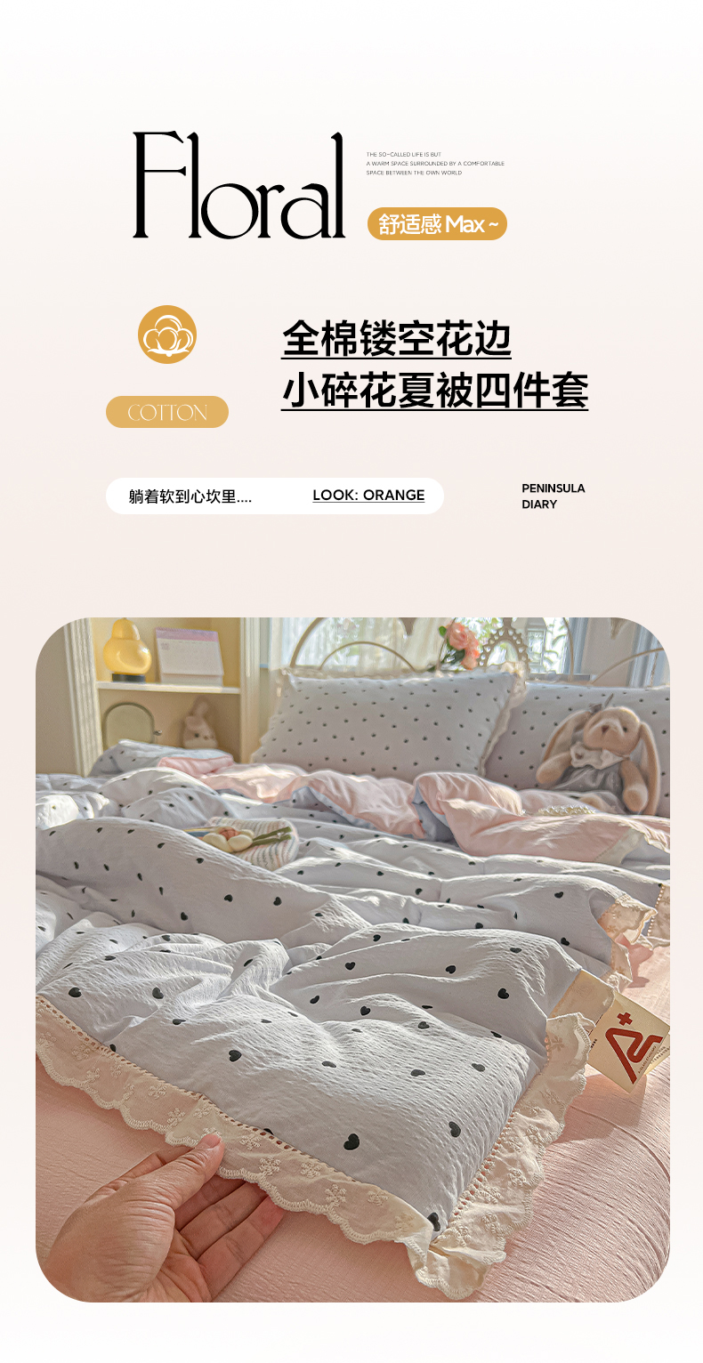 商品名称:罗亿家纺 2026新款全棉镂空花边云感双层纱夏被四件套 海盐甜心