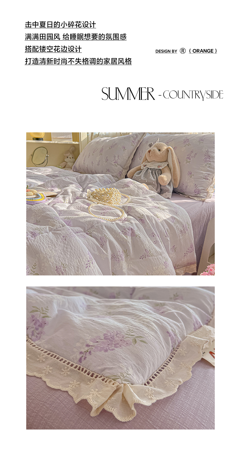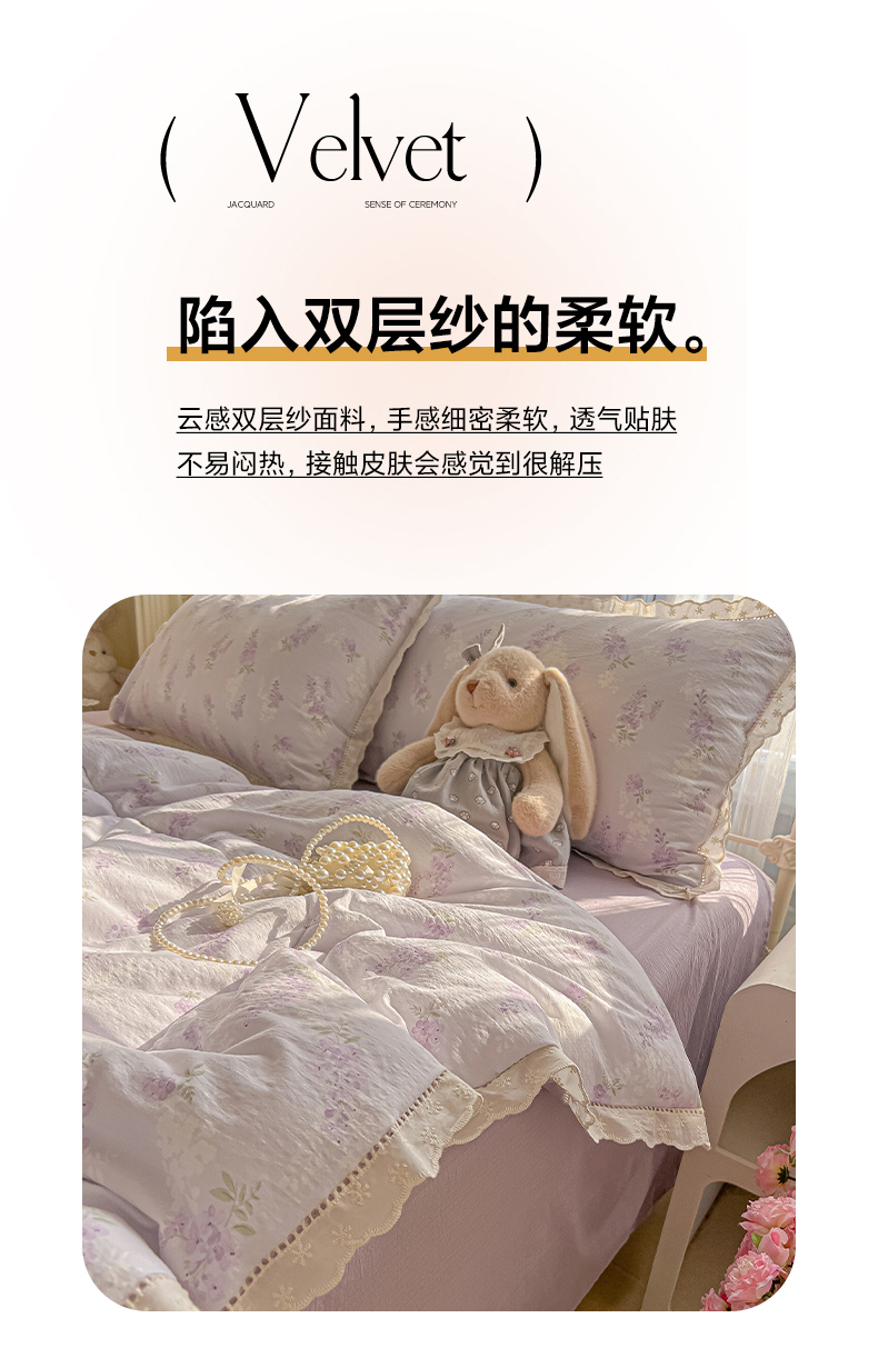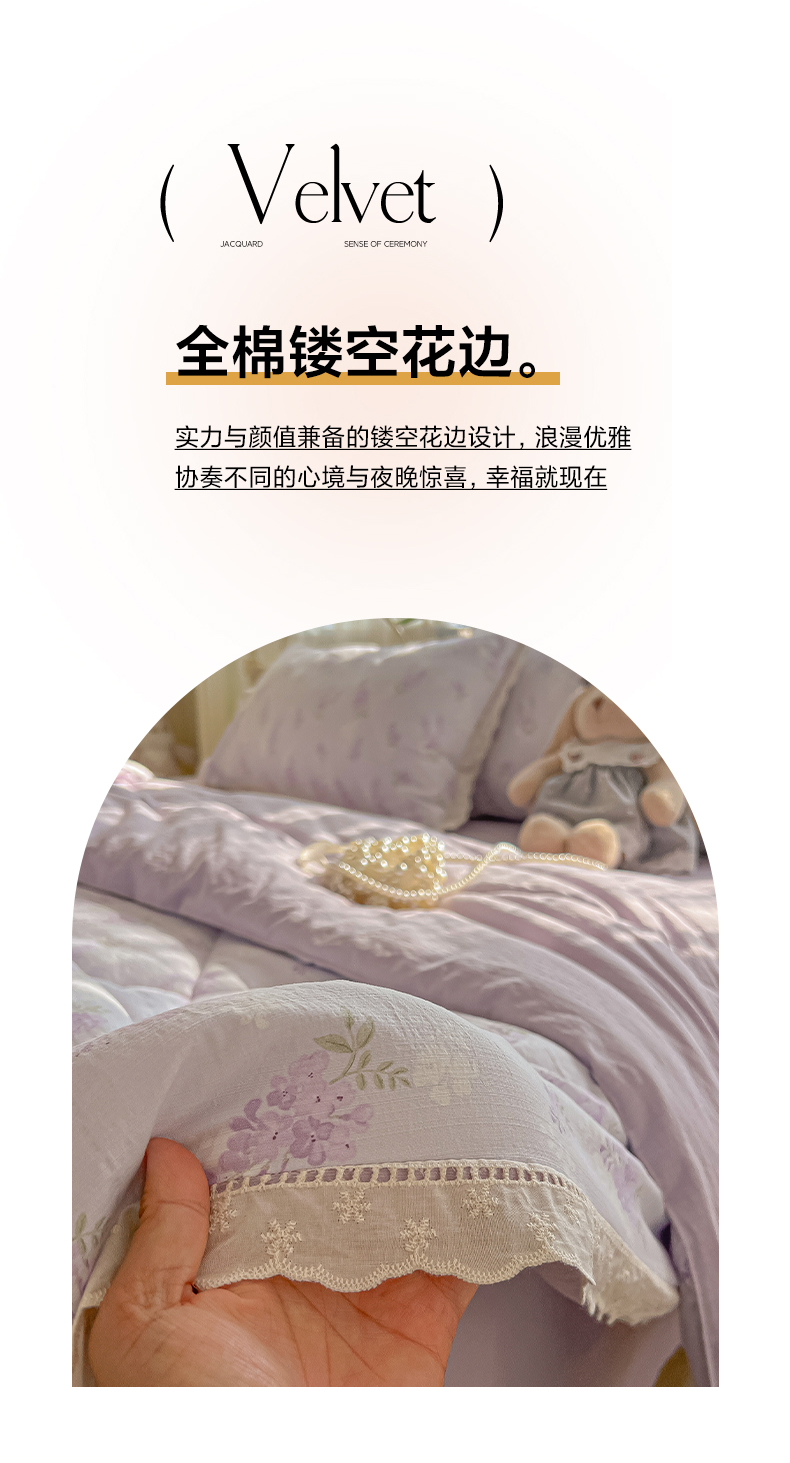 商品名称:罗亿家纺 2026新款全棉镂空花边云感双层纱夏被四件套 萄气满满