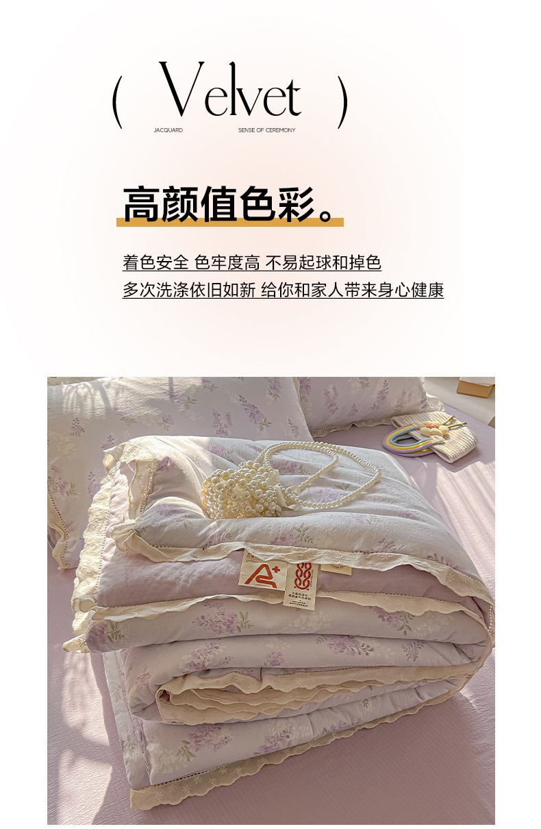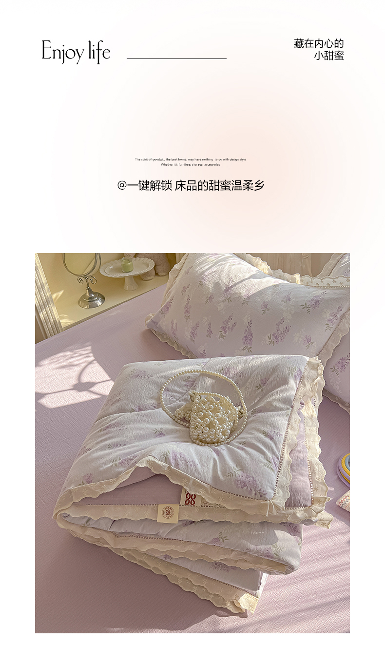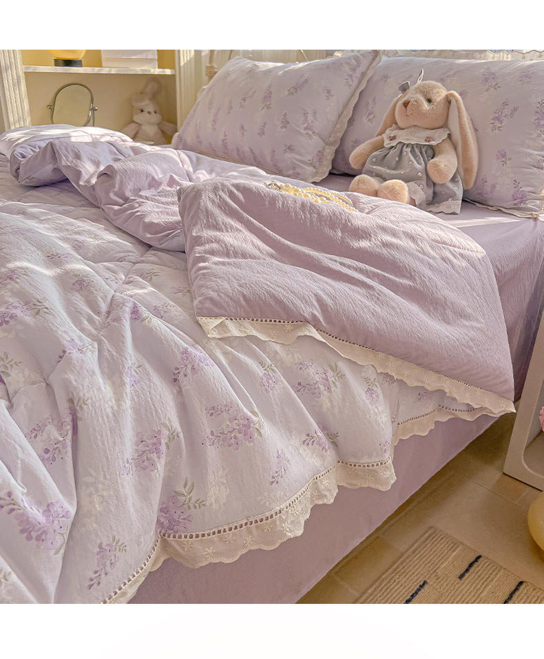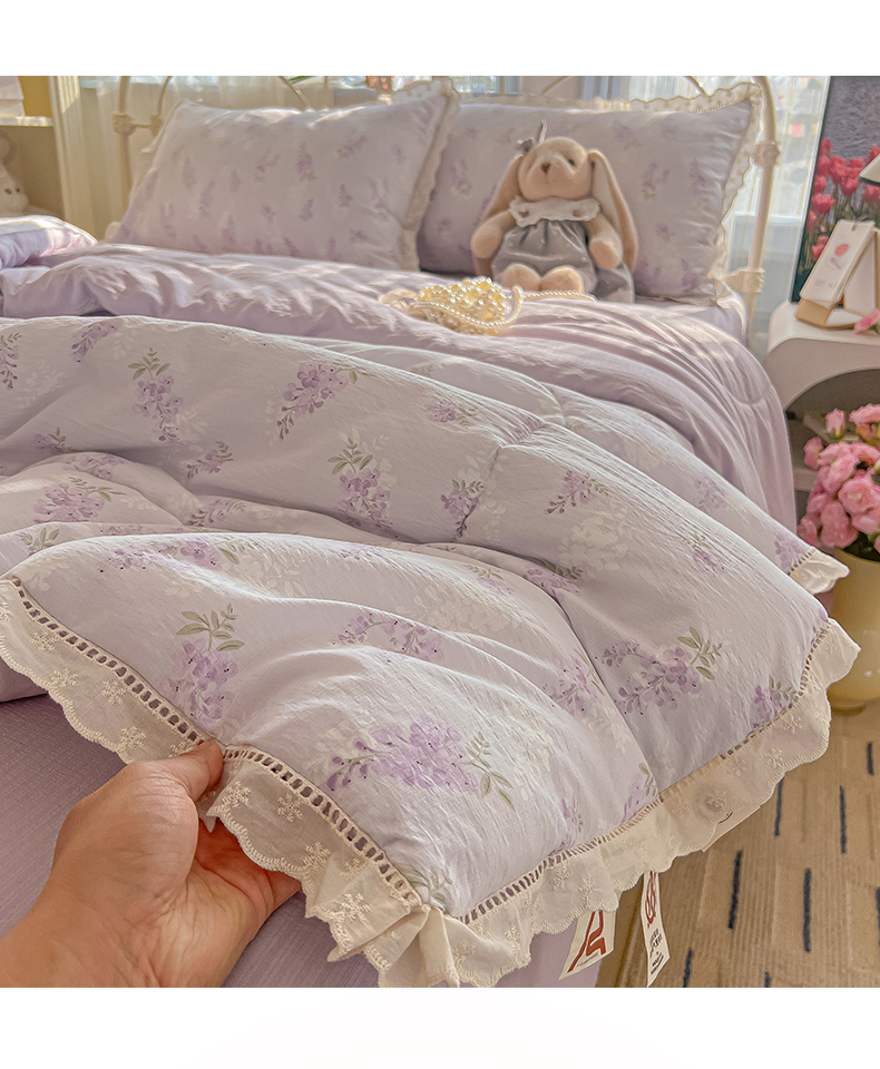 商品名称:罗亿家纺 2026新款全棉镂空花边云感双层纱夏被四件套 萄气满满