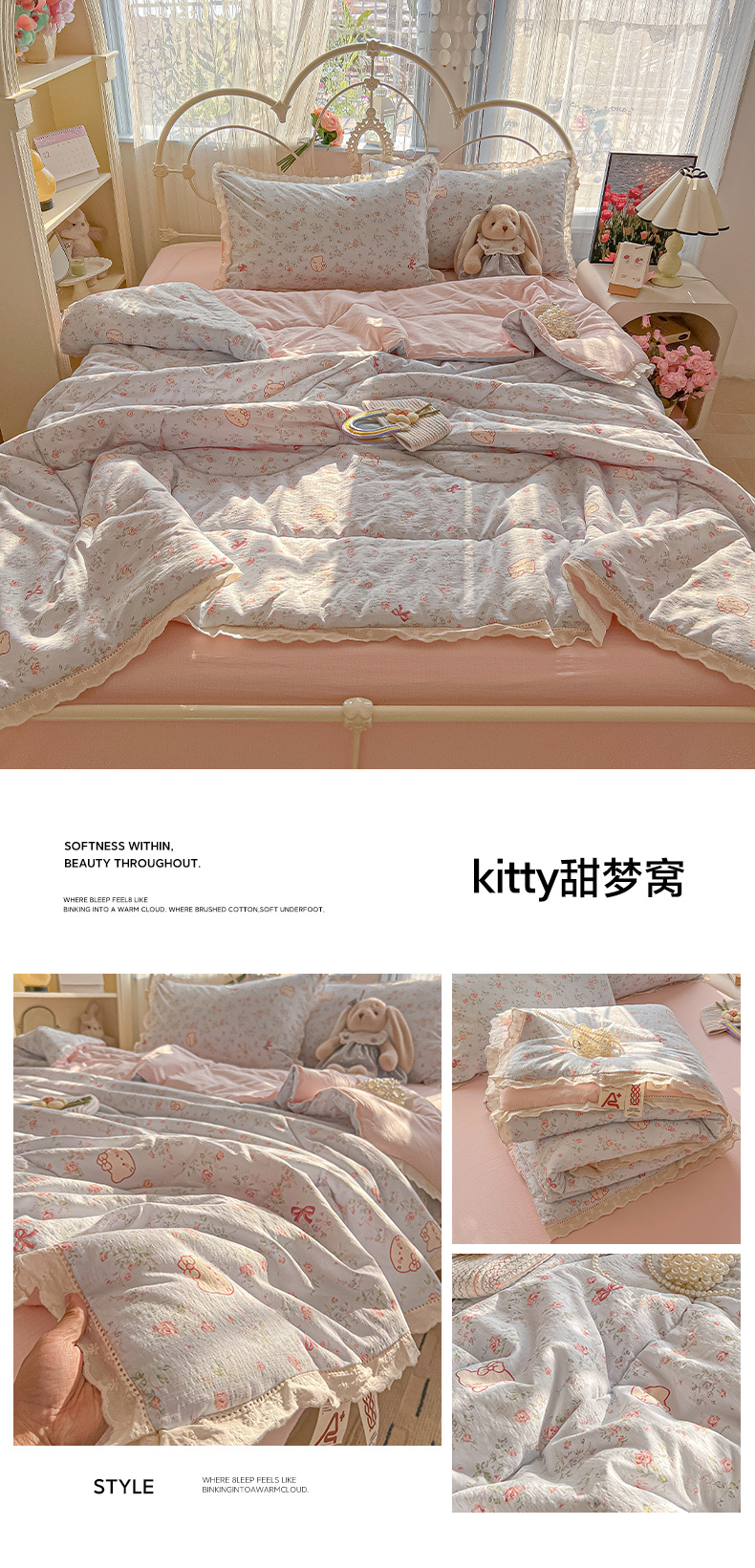 (总)罗亿家纺 2026新款小清新云感双层纱木棉四件套系列(小红书热款推荐),kitty甜梦窝,春日限定,点点小狗,海盐甜心,韩范小猫,赫本小姐,花花腊肠狗,花清梦,花漾kitty,花与兔,简夏,橘园,蓝蓝小奶狗,蓝萱,曼塔庄园,七里香,蔷薇絮,甜莓,甜昔,小猫数星星,小熊奶盖,星星屁屁兔,星星人后花园,星星兔,薰衣草,枝蔓,棕韵梦境