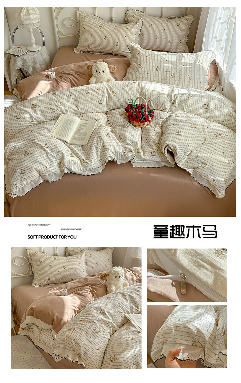 当前位置: 91家纺网 > 商品网购 > 床品套件 > 四件套 > 水洗棉四件套 > 晚爱家纺(原晚安家居) 2026春夏新款古法水洗棉复古法式花边四件套少女公主风 童趣木马