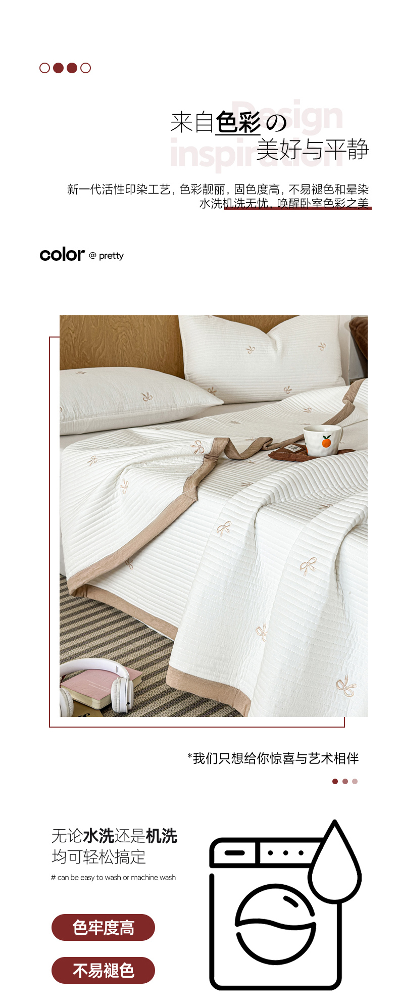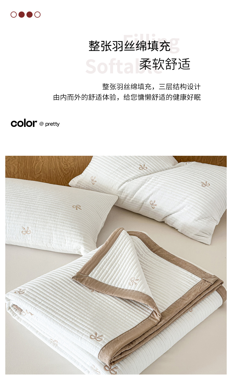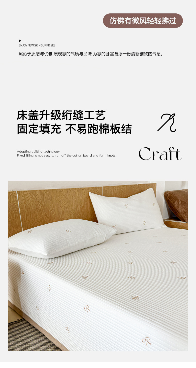 商品名称:木楌家居 2026春夏新款双面全棉纯棉皱皱纱刺绣款床盖床盖单件 奶咖蝴蝶结