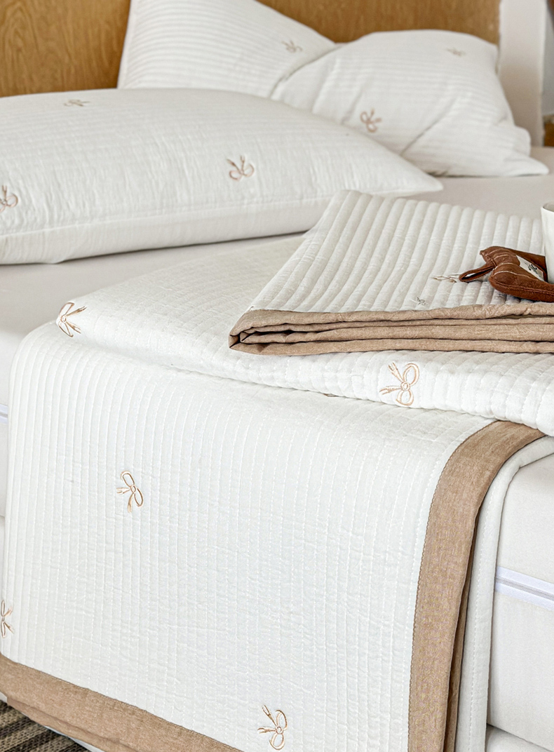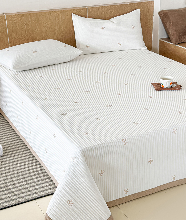 木楌家居 2026春夏新款双面全棉纯棉皱皱纱刺绣款床盖床盖单件 奶咖蝴蝶结