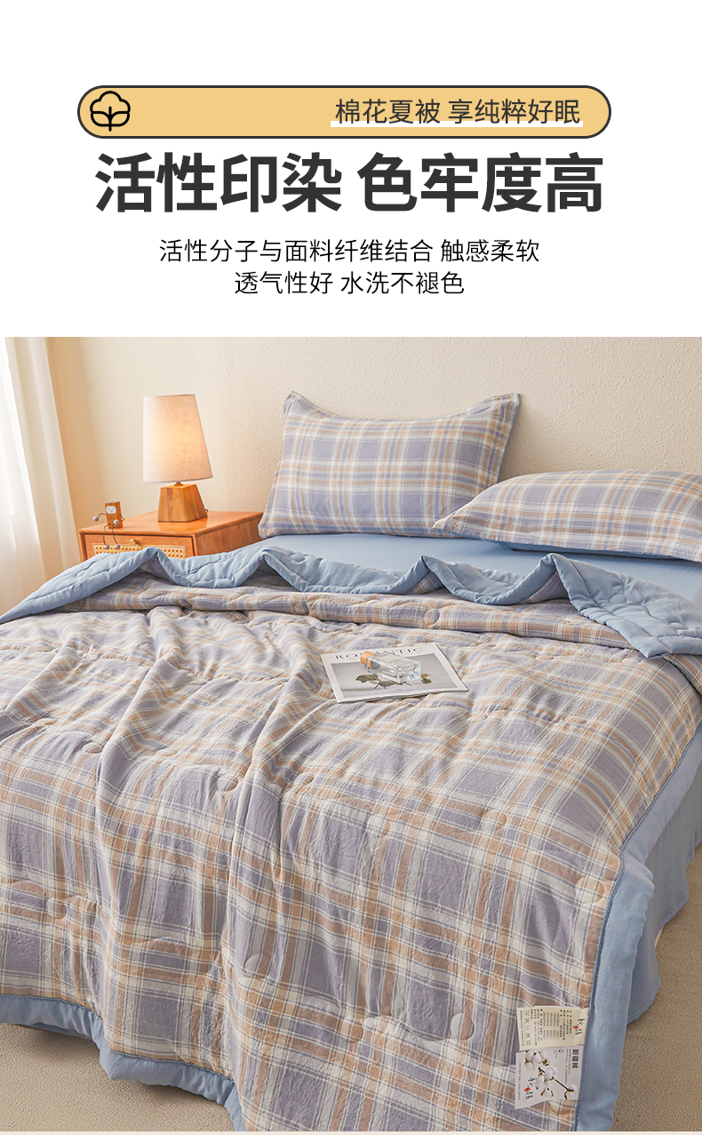 (总)西域种棉人 2026新款A类新疆棉花夏凉被加宽包边水洗棉无印格子印花吸湿透气棉花夏被空调被,格子灰,格子蓝,格子熊,格子紫,小格灰,小格绿