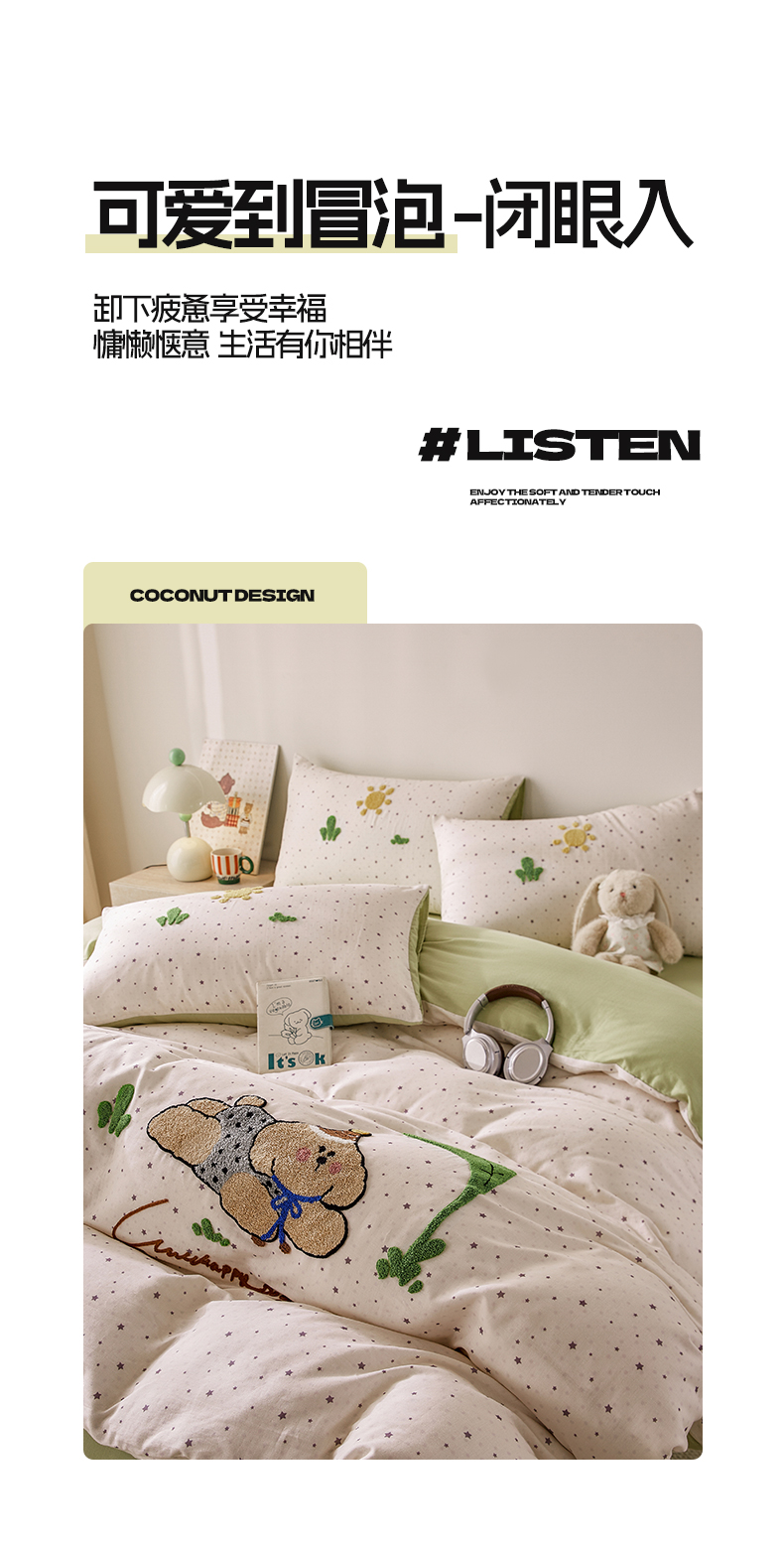 (总)麦田家纺 2025新款A类云感木棉皱皱双层纱印花四件套,春意浓,繁花,花颜,简意,开心小熊,腊肠犬,浪漫花语,免挽星辰,甜心格,小蓝町,樱桃格,紫韵