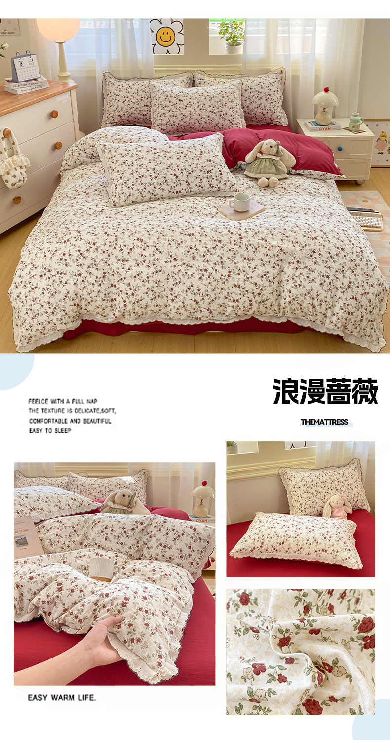 (总)豫见家纺 2026新款A类仿棉云感纱花边四件套,浪漫花叙,梦境之间,芊芊花海,碎花眠语,暗香,草莓多多,春风里,梵高印象,粉豹纹,狗狗家族,蝴蝶梦,琥珀流光,花漫漫,花影如梦,浪漫蔷薇,栗色木马纹,木马乐园,年华,日光漫游,赛琳娜,山茶左岸,线条表情狗,小鱼心事,雨沫蝴蝶结,紫色花野,紫藤花开