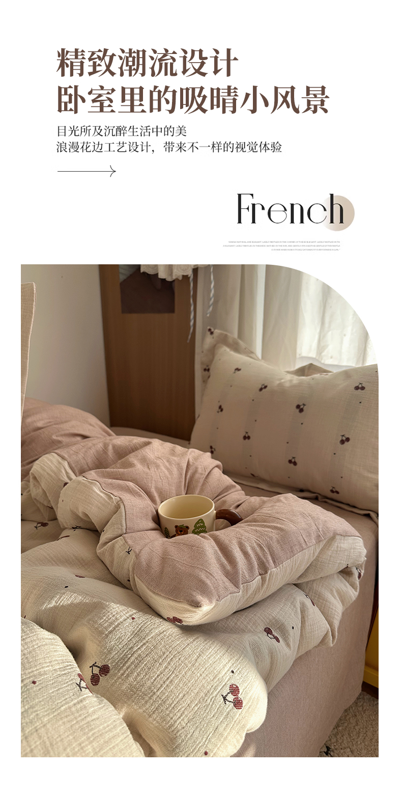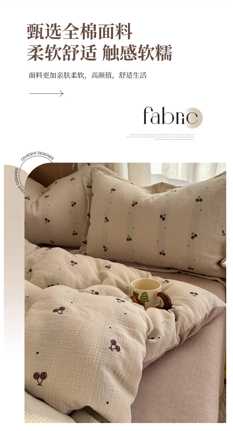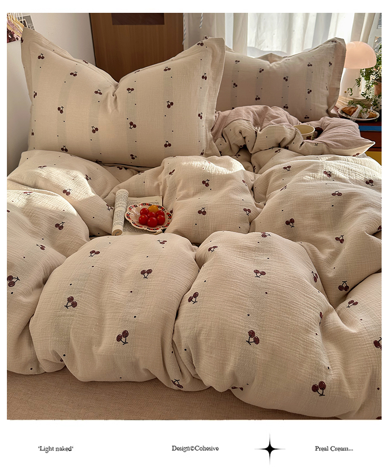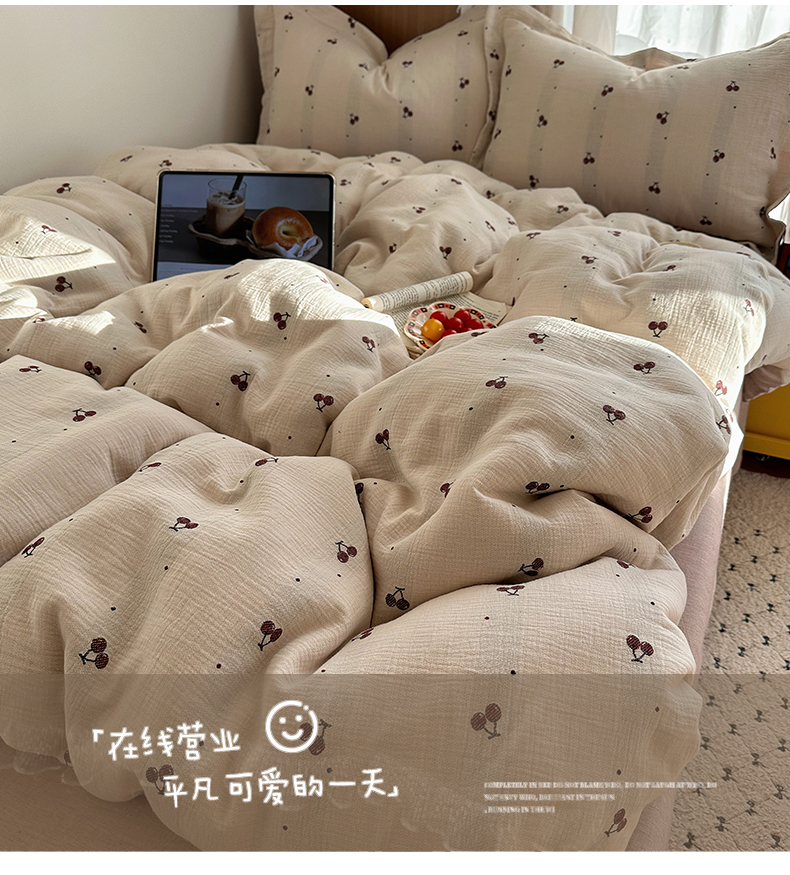 当前位置: 91家纺网 > 商品网购 > 床品套件 > 四件套 > 全棉普通四件套 > 萝莉家纺 2026新款全棉纯棉色织双层纱提花四件套 点点樱桃
