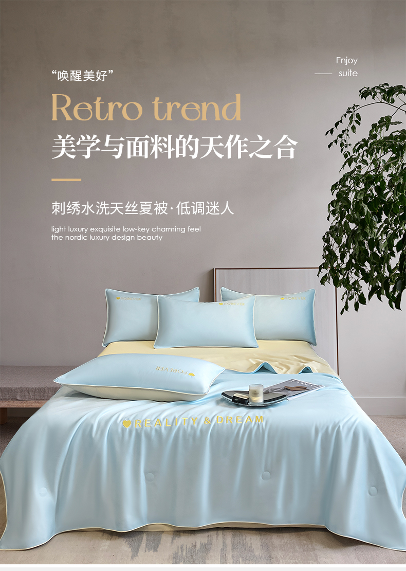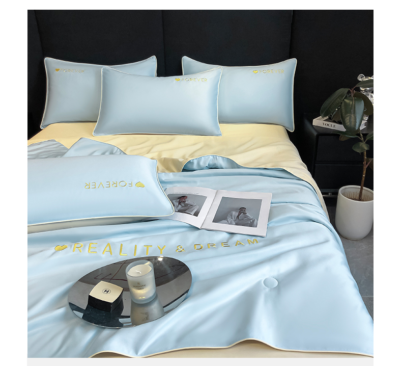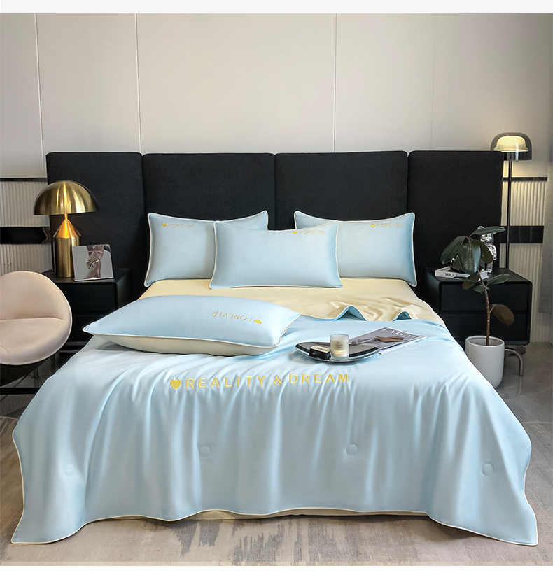 • 91家纺网 家纺一手货源 找家纺 吾诺家居 2026新款双拼及羽毛刺绣夏被夏凉被空调被四件套-柔羽 天空蓝-奶黄