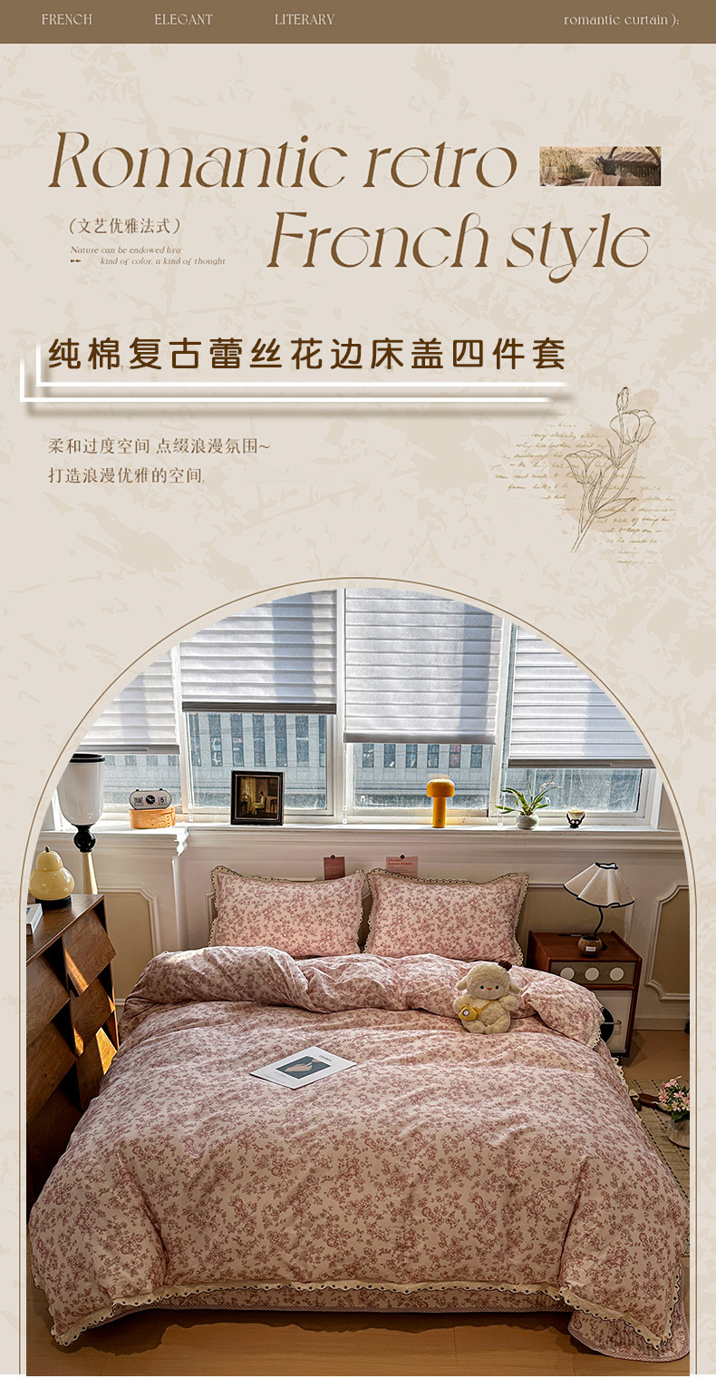 (总)橙子家居 2026新款纯棉法式复古蕾丝花边床盖四件套,复古蔷薇粉,花町,花影,墨影,普罗旺斯,枝蔓-浅灰,枝蔓-浅蓝