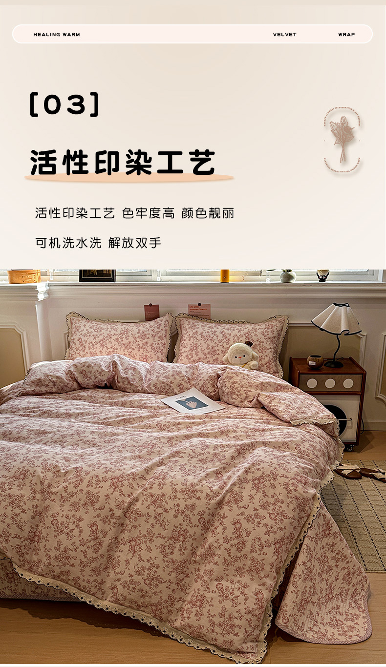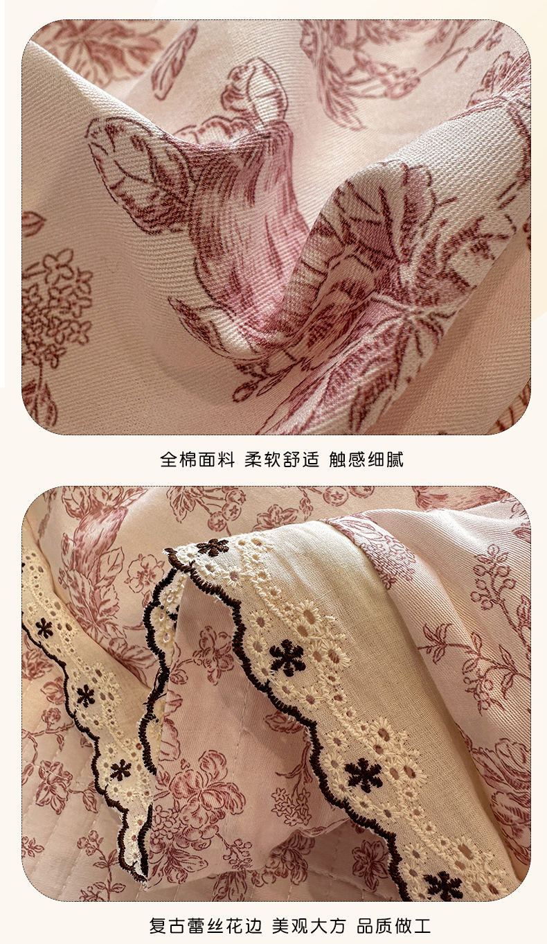 橙子家居 2026新款纯棉法式复古蕾丝花边床盖四件套 复古蔷薇粉