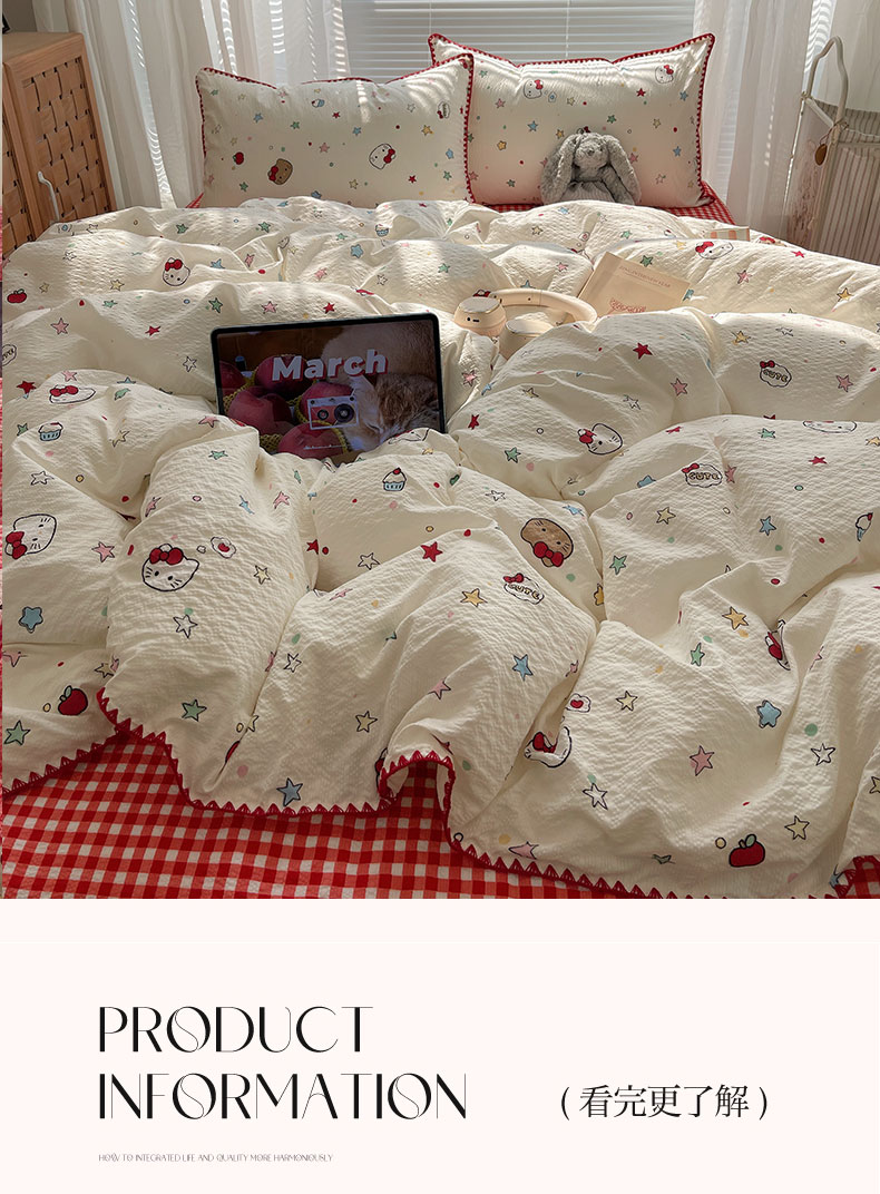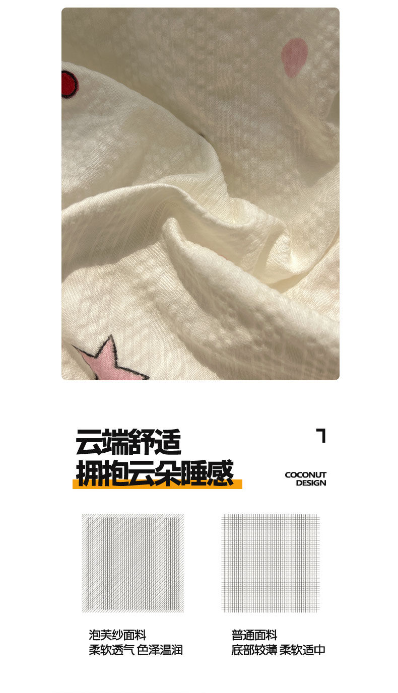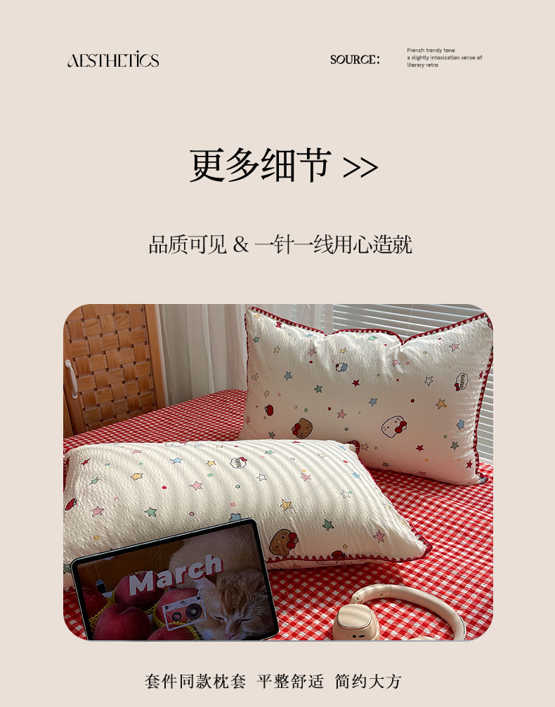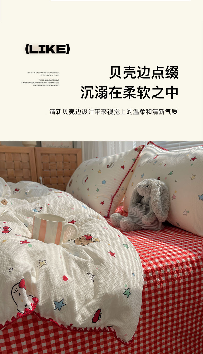 当前位置: 91家纺网 > 商品网购 > 床品套件 > 四件套 > 其它四件套 > 桃心家居 2026新款A类费尔岛可爱卡通贝壳边三角针工艺双层纱泡芙棉泡芙纱系列四件套 泡芙棉-可可猫咪