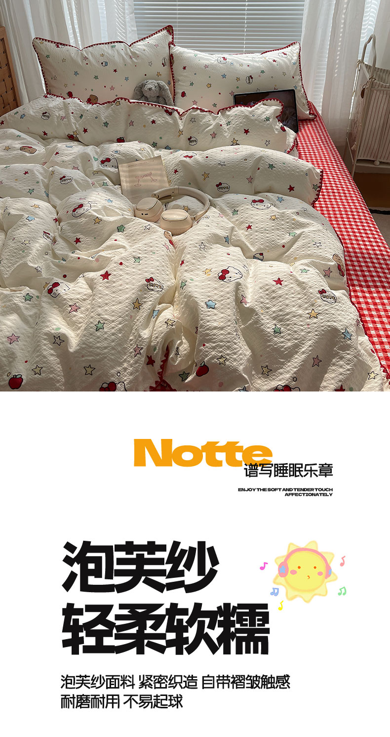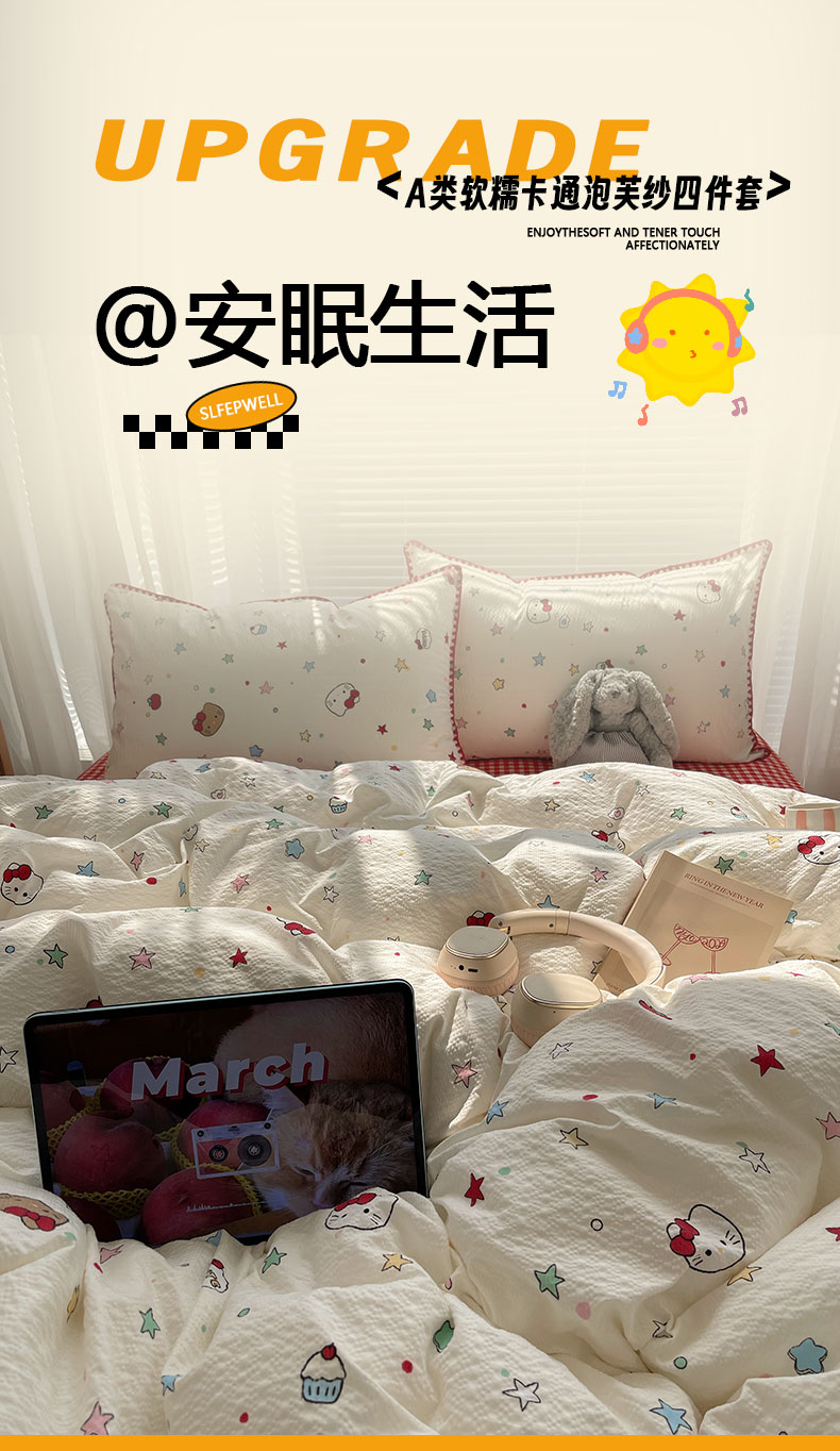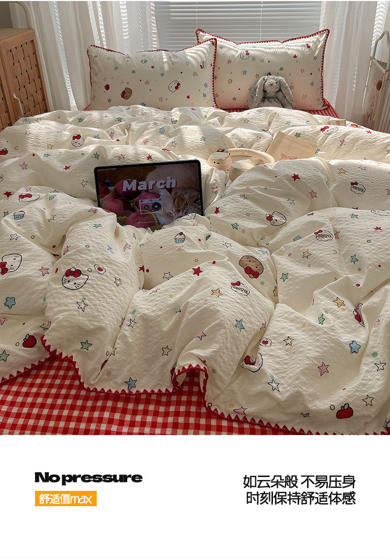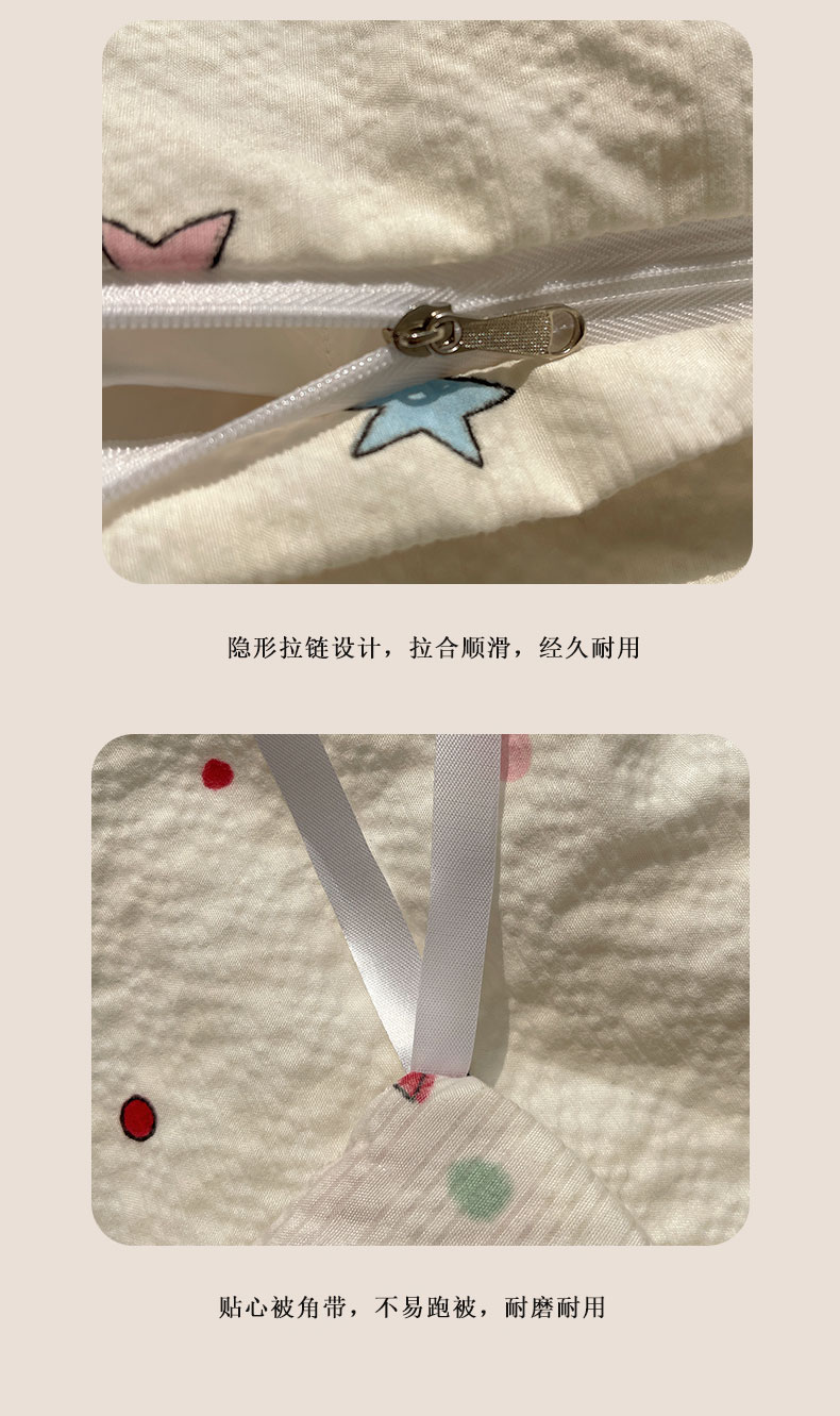 当前位置: 91家纺网 > 商品网购 > 床品套件 > 四件套 > 其它四件套 > 桃心家居 2026新款A类费尔岛可爱卡通贝壳边三角针工艺双层纱泡芙棉泡芙纱系列四件套 泡芙棉-可可猫咪