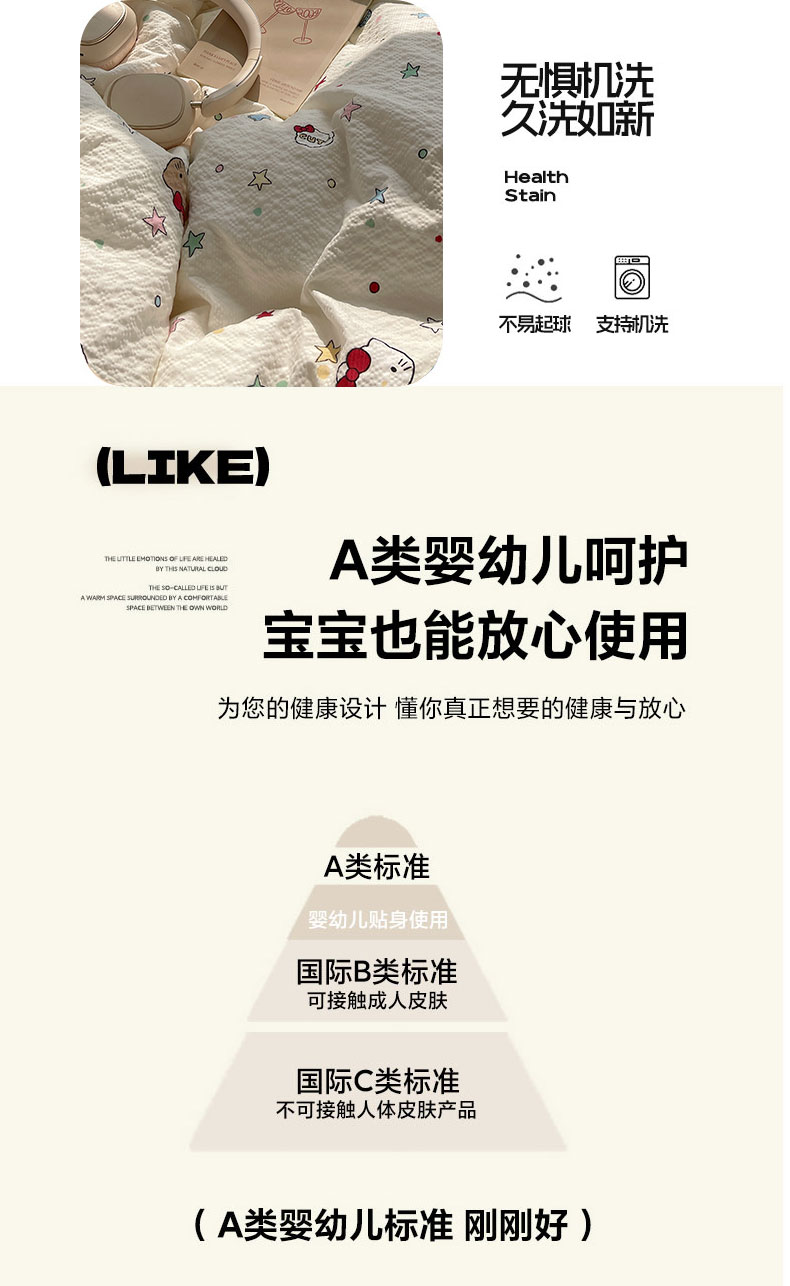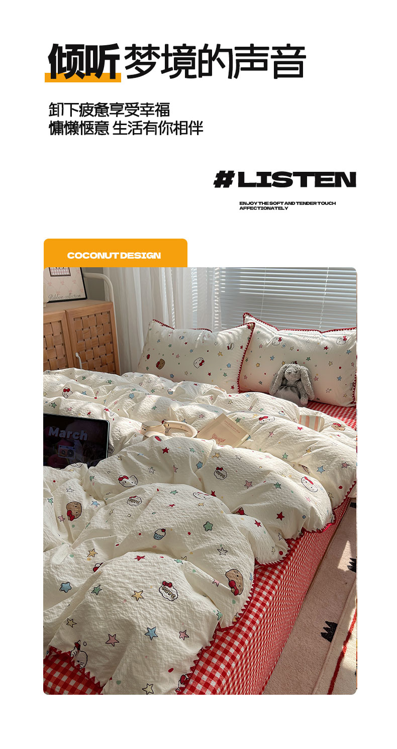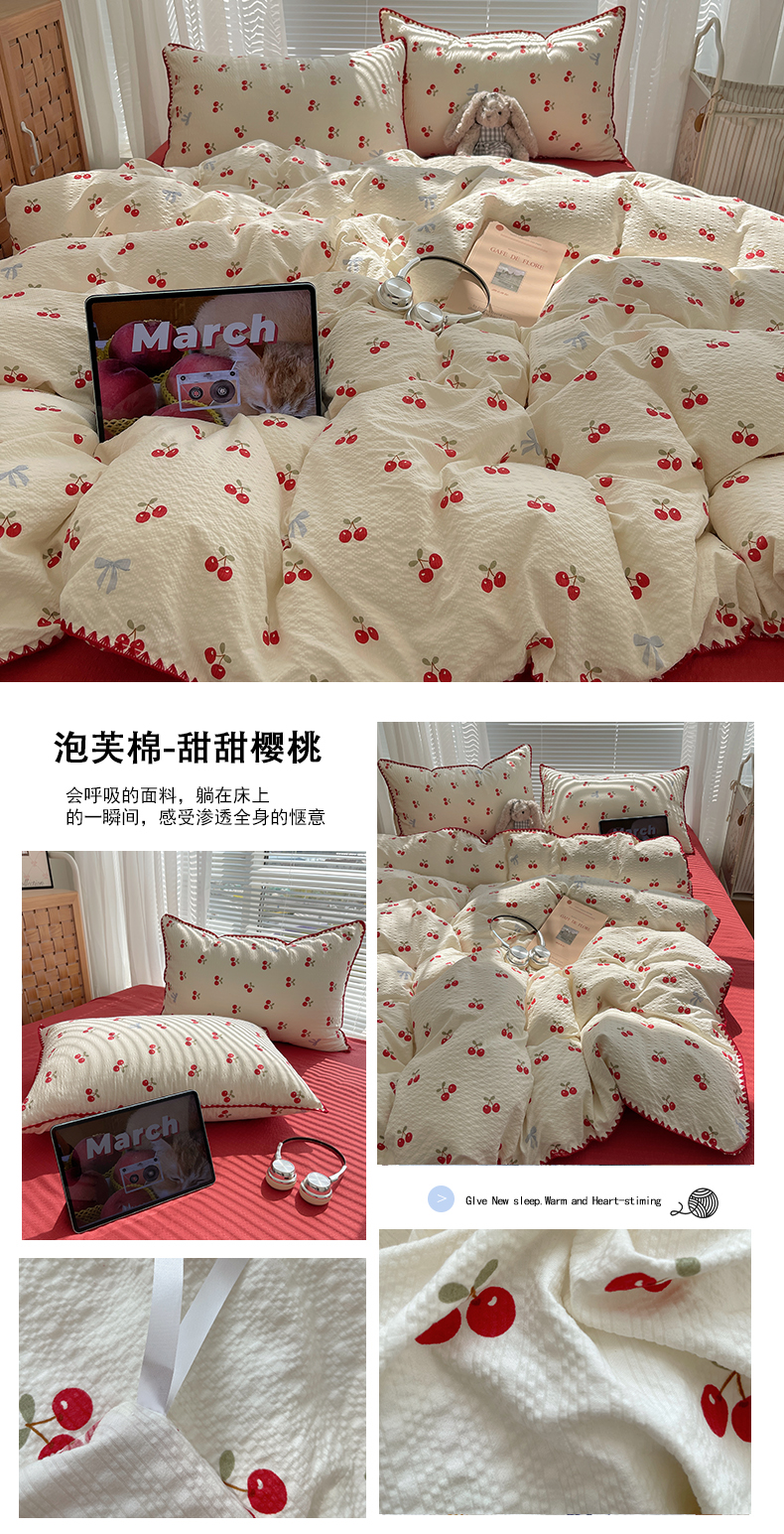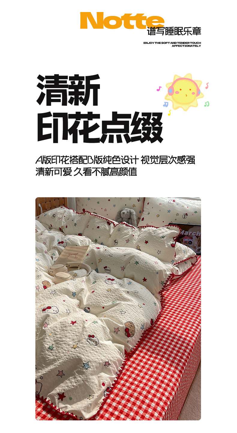 当前位置: 91家纺网 > 商品网购 > 床品套件 > 四件套 > 其它四件套 > 桃心家居 2026新款A类费尔岛可爱卡通贝壳边三角针工艺双层纱泡芙棉泡芙纱系列四件套 泡芙棉-可可猫咪