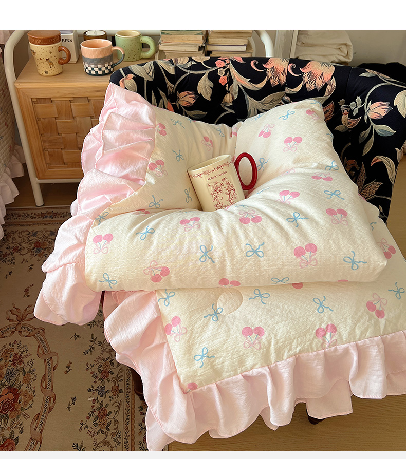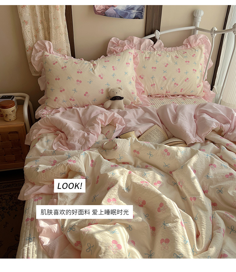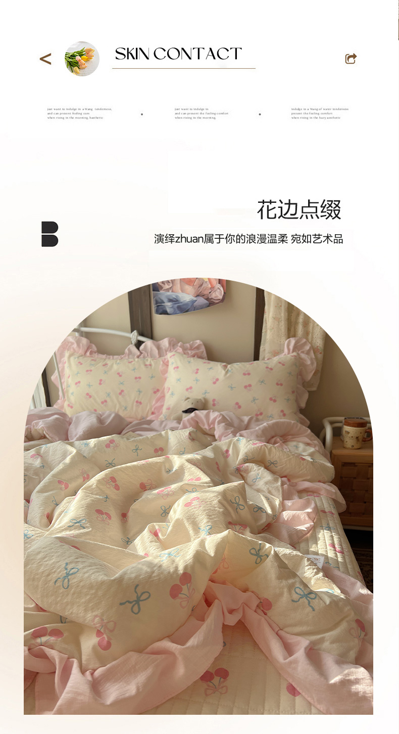 商品名称:繁花家居 2026新款木棉泡芙感超糯叽叽花边床盖夏被四件套 殷桃结语