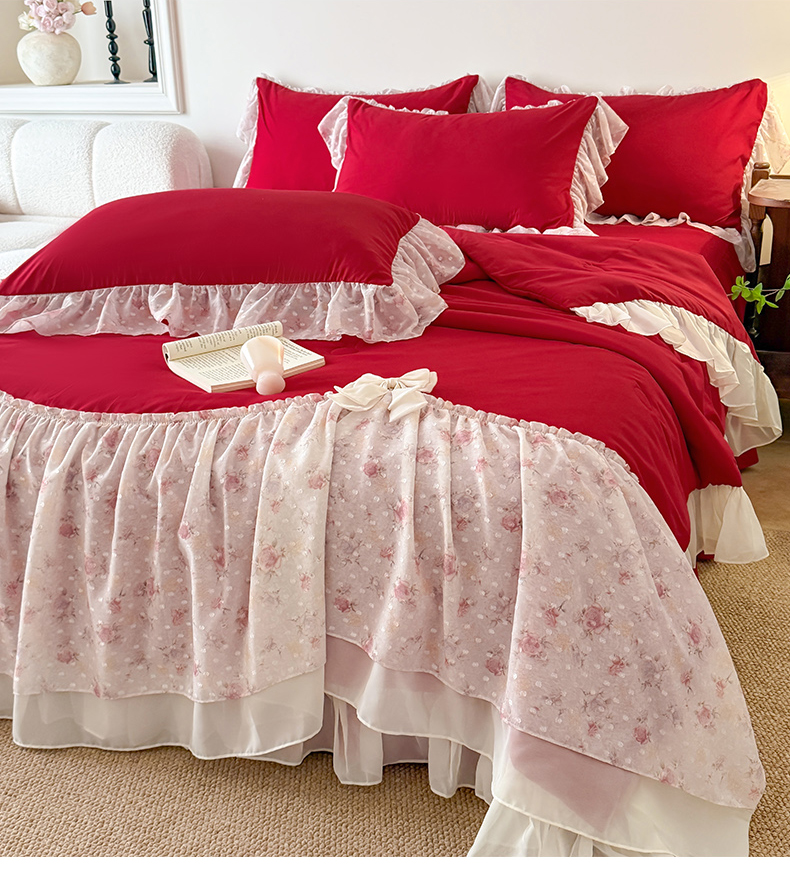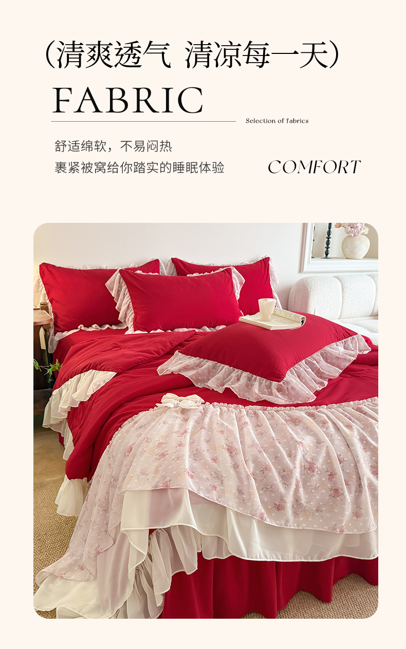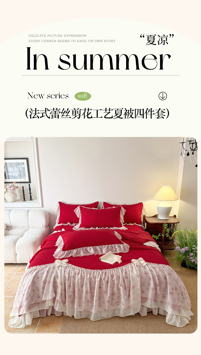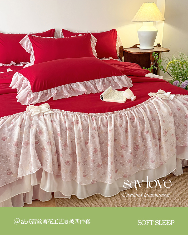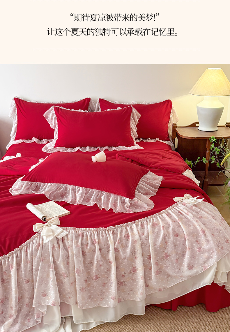 • 91家纺网 家纺一手货源 找家纺 富盛家纺 2026新款雪纺蕾丝刺绣法式床裙韩版夏凉被空调被夏被四件套 夏被四件套—浪漫主义(大红)