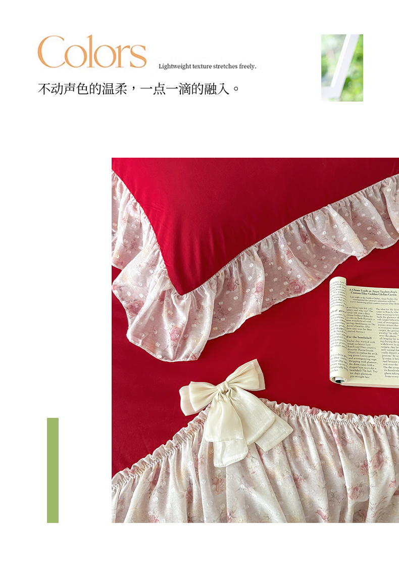 (总)富盛家纺 2026新款水洗亲肤棉雪纺蕾丝法式床裙韩版四件套,自由女神—粉,自由女神—大红,自由女神—白,自由女神—绿,自由女神—紫,自由女神—黄,自由女神—豆沙,自由女神—蓝