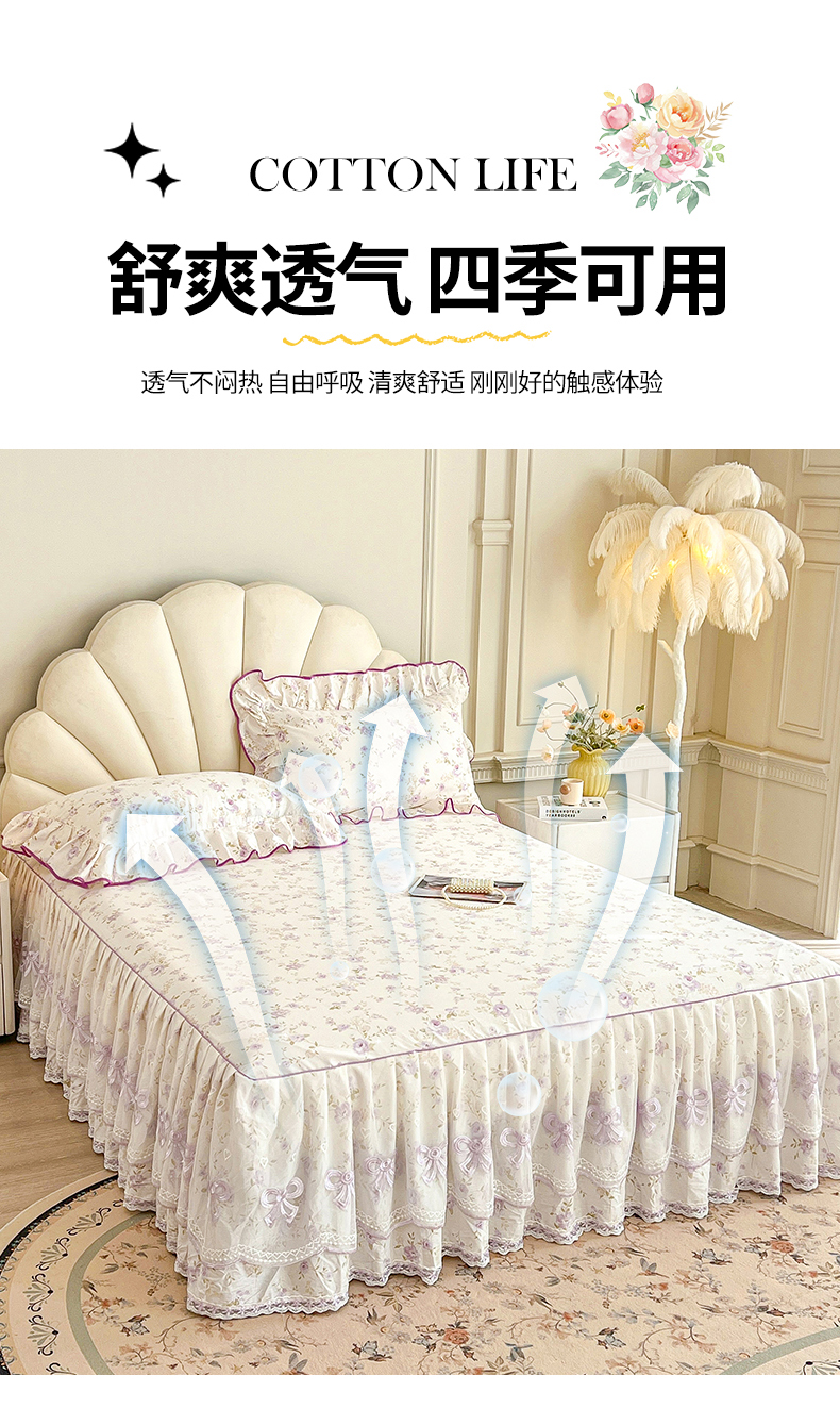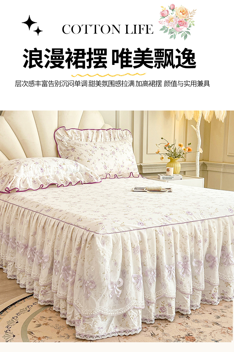 (总)宜凡家纺 2026新款全棉公主风单层床裙三件套,海棠之恋,镜花映月,水苏栀清,玉容昭婉
