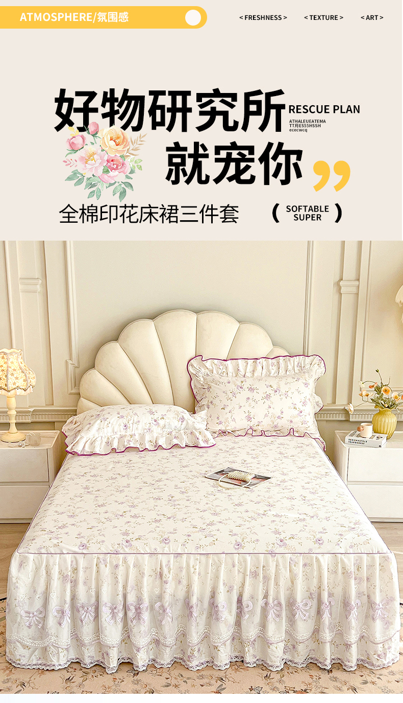 • 91家纺网 家纺一手货源 找家纺 (总)宜凡家纺 2026新款全棉印花公主风夹棉床裙三件套,海棠之恋,镜花映月,水苏栀清,玉容昭婉