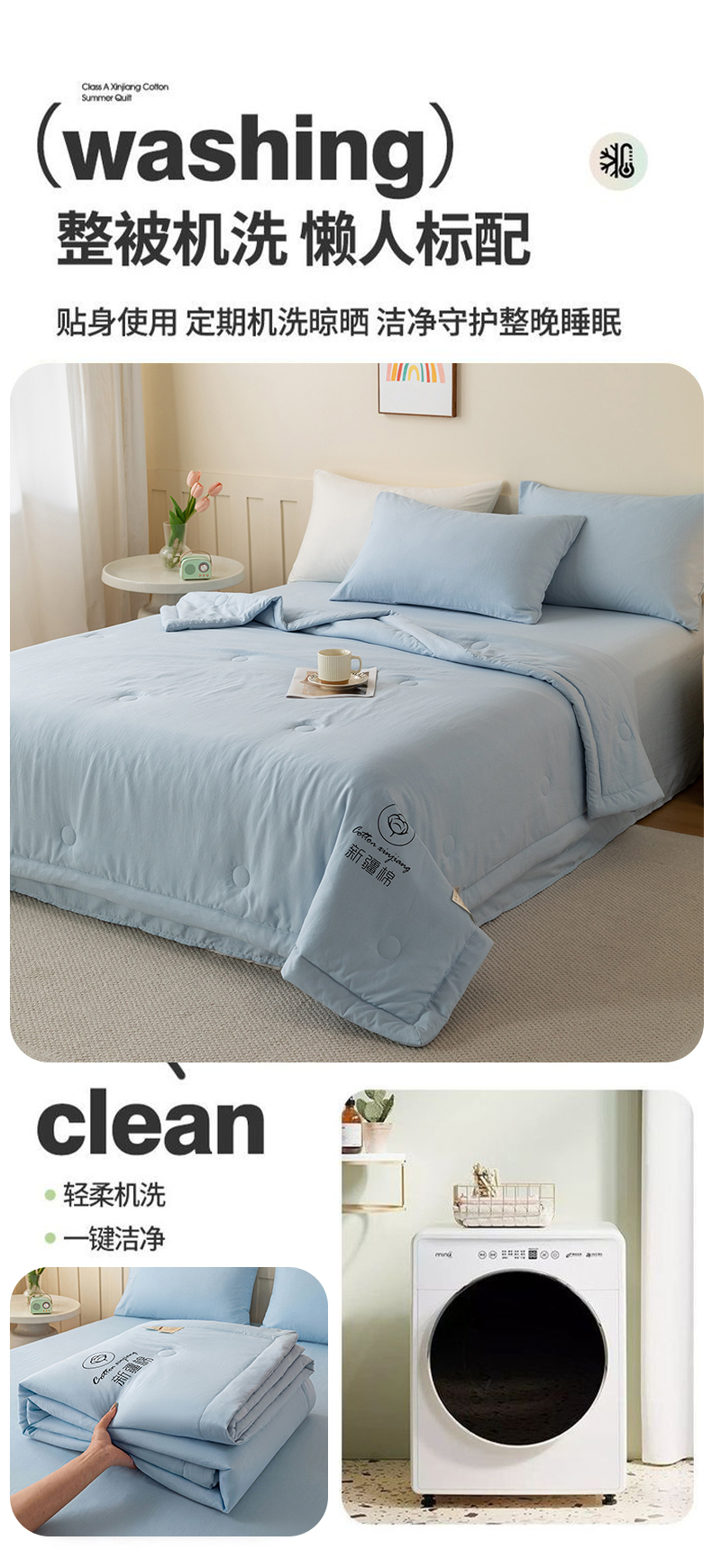 商品名称:几禾 2026春夏新款纯色水洗棉双拼夏被新疆棉花被夏凉被空调被被子被芯 纯色-天蓝