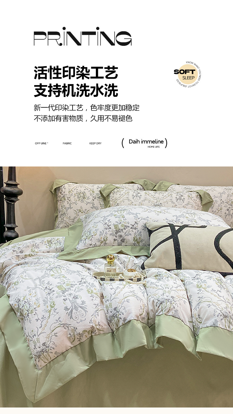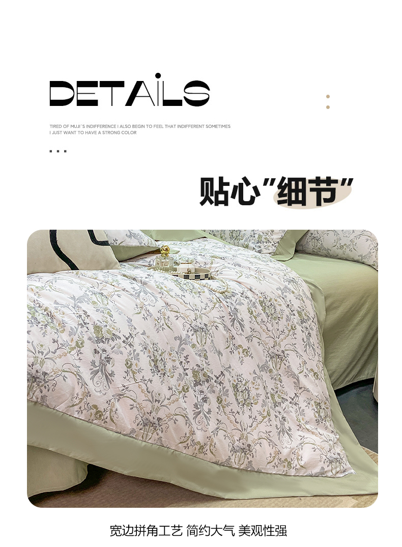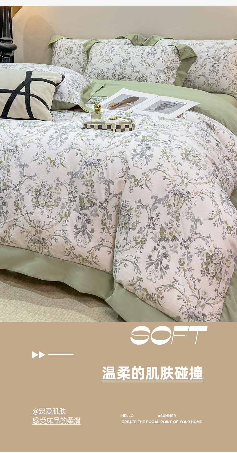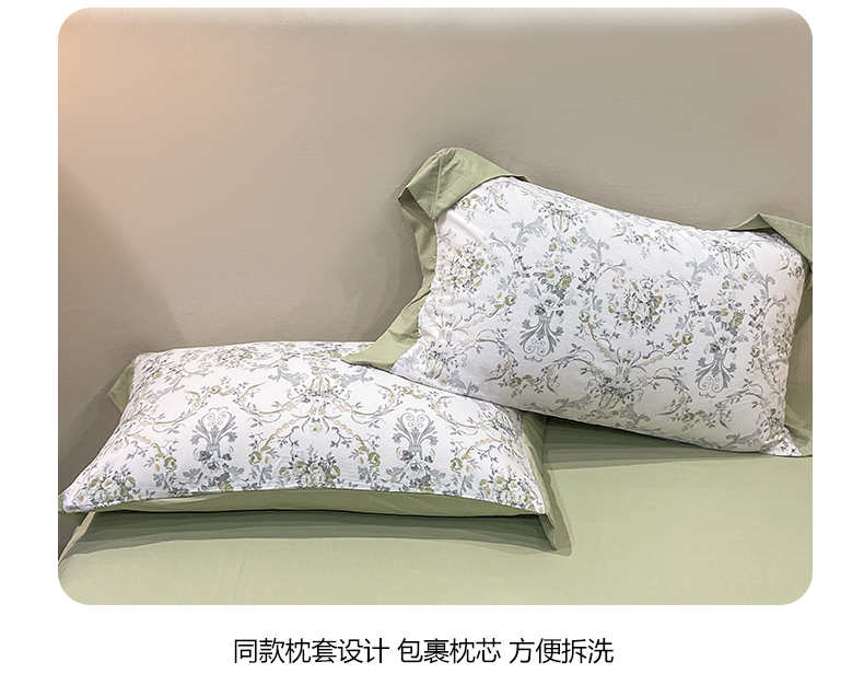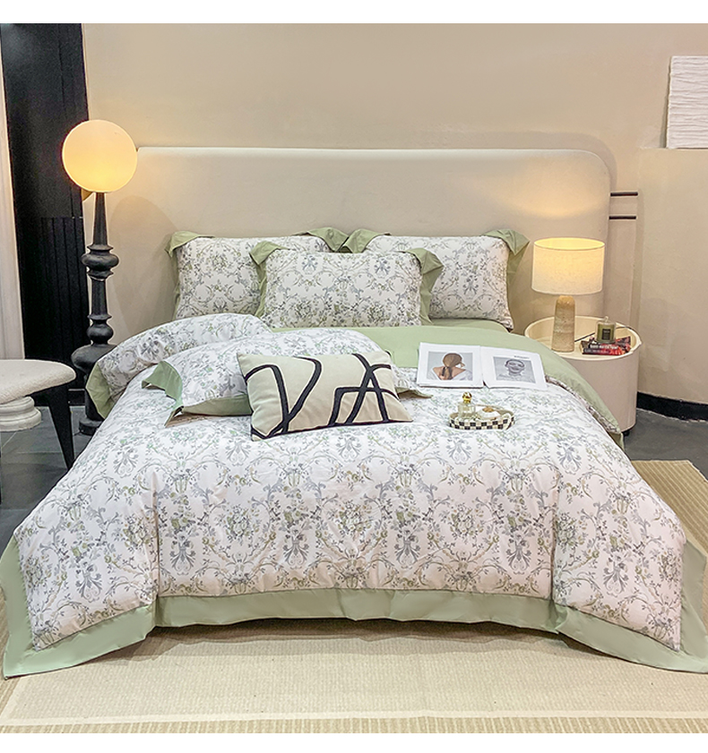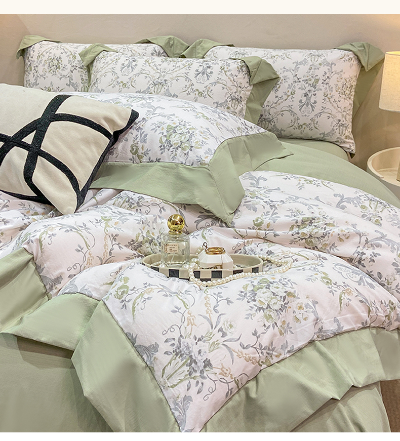 当前位置: 91家纺网 > 商品网购 > 床品套件 > 四件套 > 其它四件套 > 慕木家纺 2026新款A类印花拼角工艺慕斯棉四件套系列(抽空压缩可供跨境)提供买家秀 清漫+绿