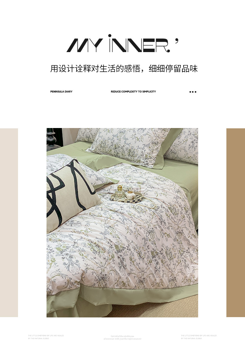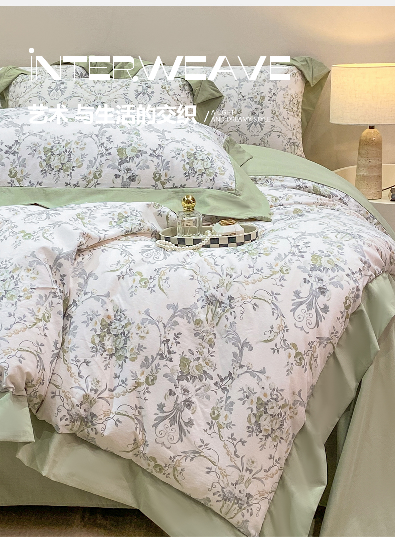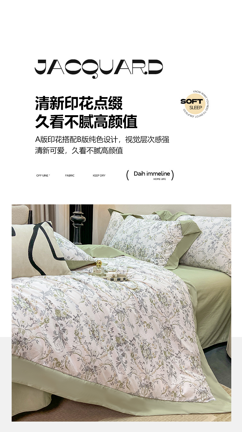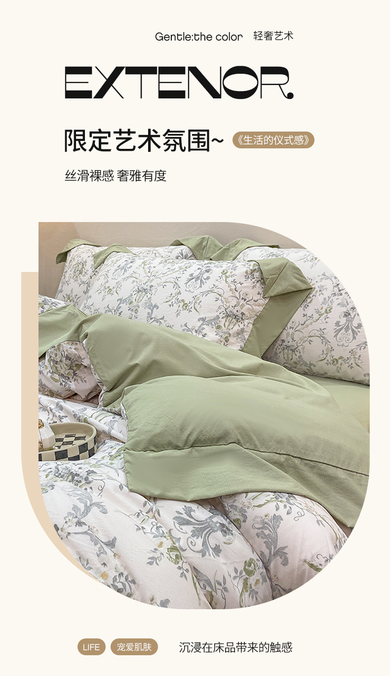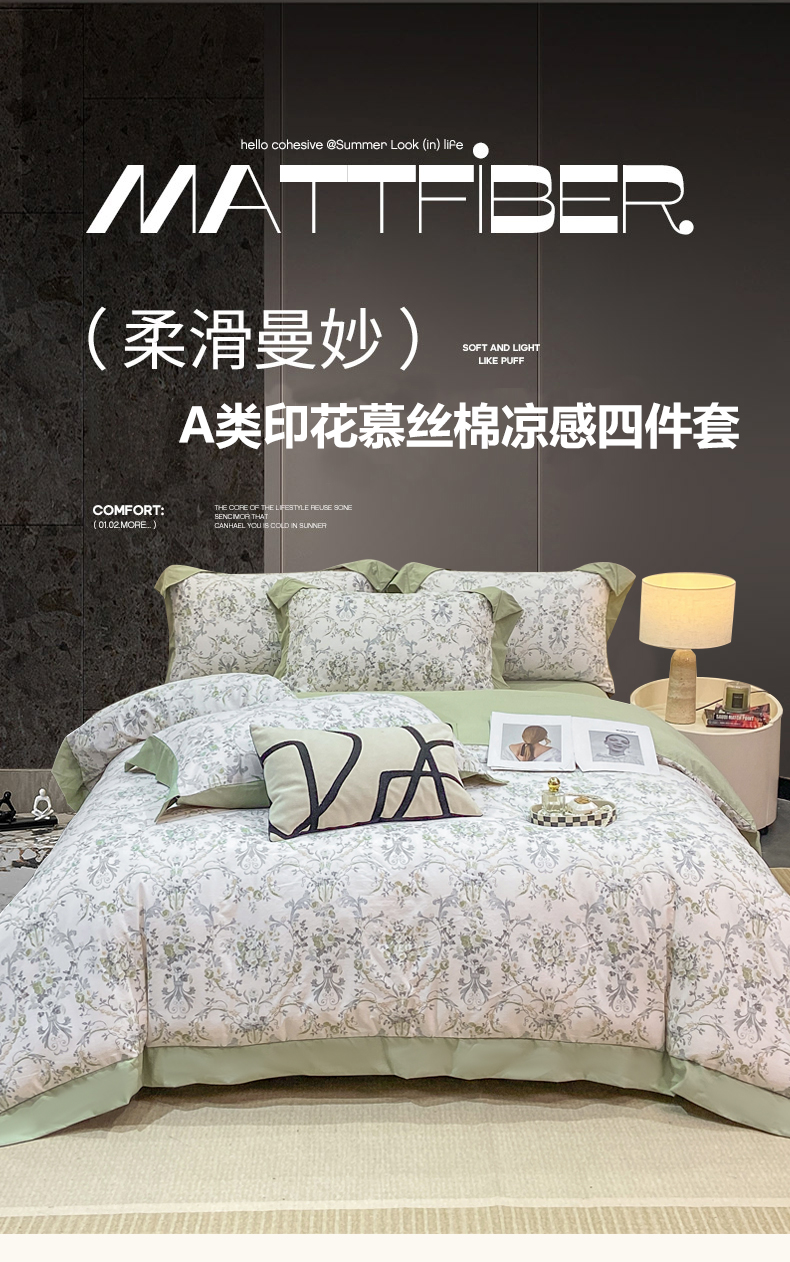 当前位置: 91家纺网 > 商品网购 > 床品套件 > 四件套 > 其它四件套 > 慕木家纺 2026新款A类印花拼角工艺慕斯棉四件套系列(抽空压缩可供跨境)提供买家秀 清漫+绿