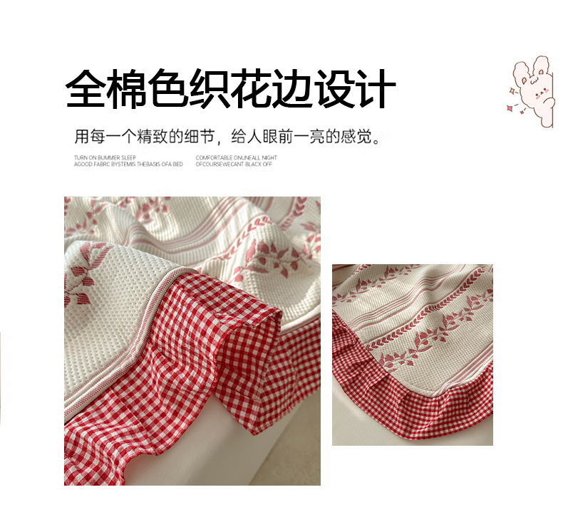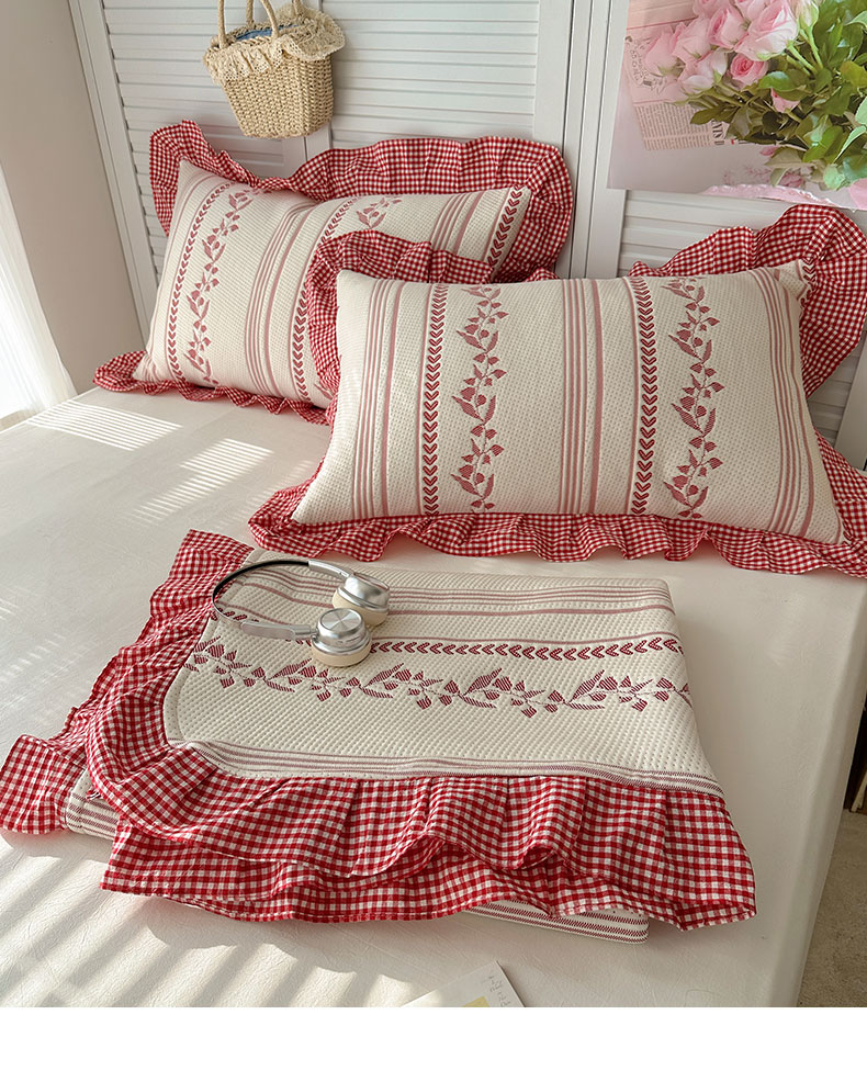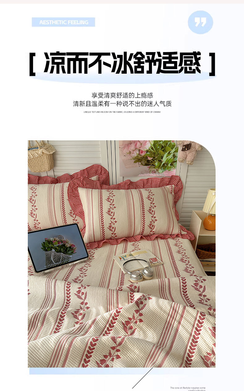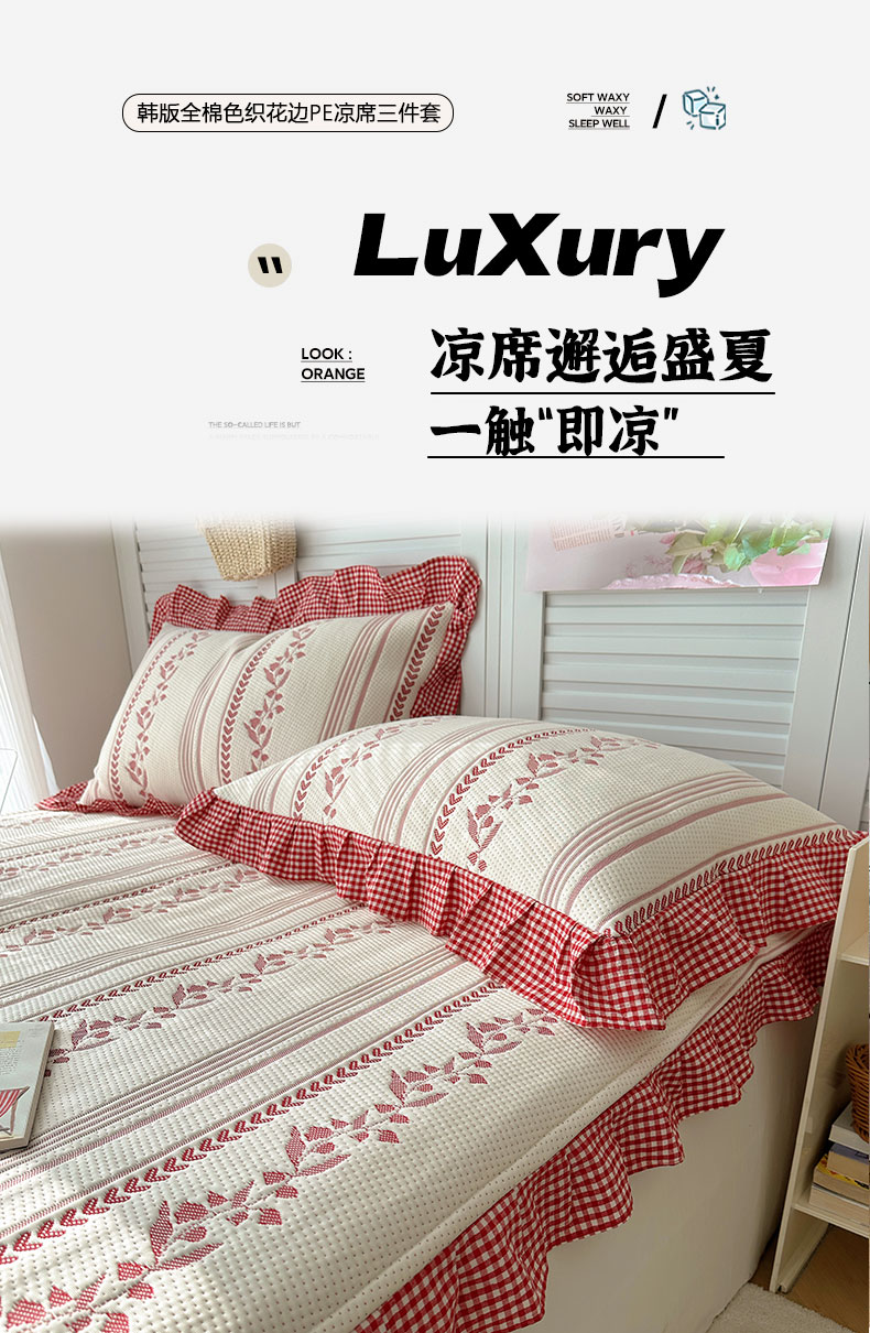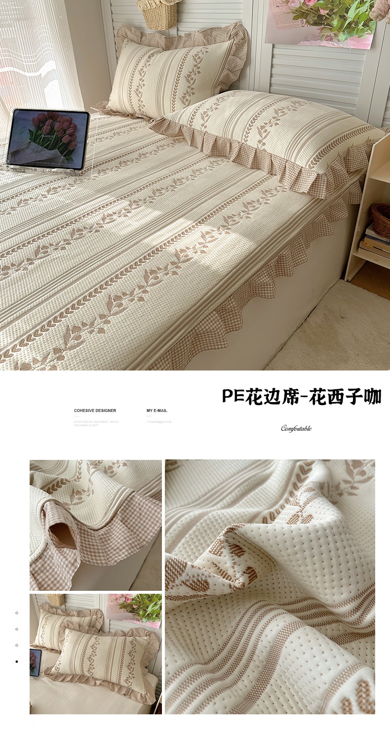 当前位置: 91家纺网 > 商品网购 > 床上用品 > 凉席 > 其他凉席 > 桃子家居 2026新款A类韩版全棉色织花边工艺提花PE凉感凉席席子凉席三件套系列 PE花边席-花西子红
