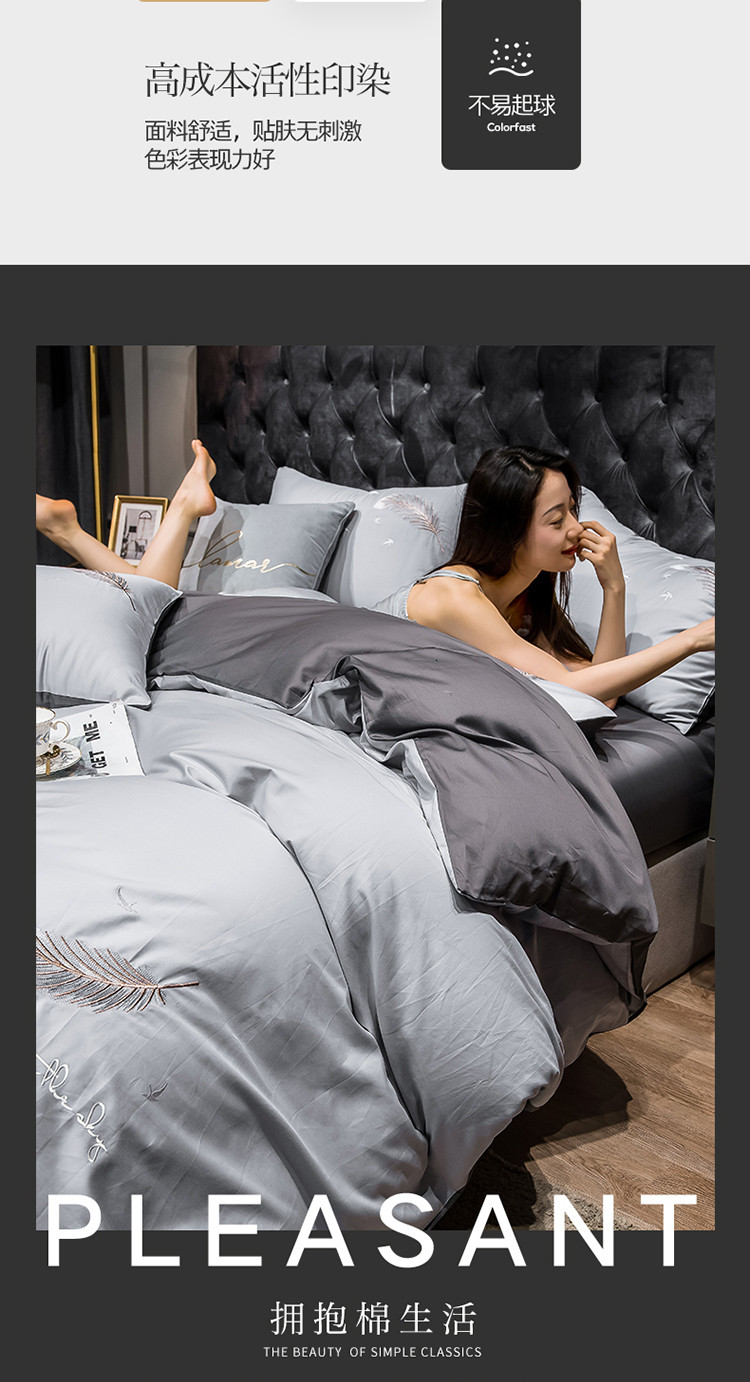 骏腾 2022新款全棉羽毛绣花四件套 羽毛-银灰+深灰