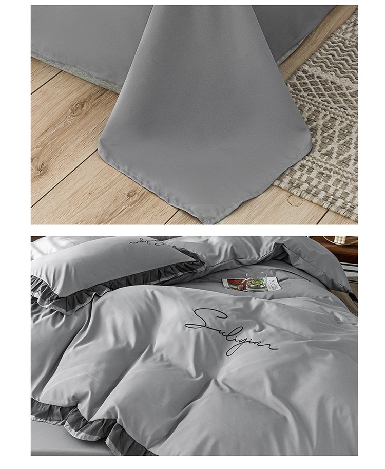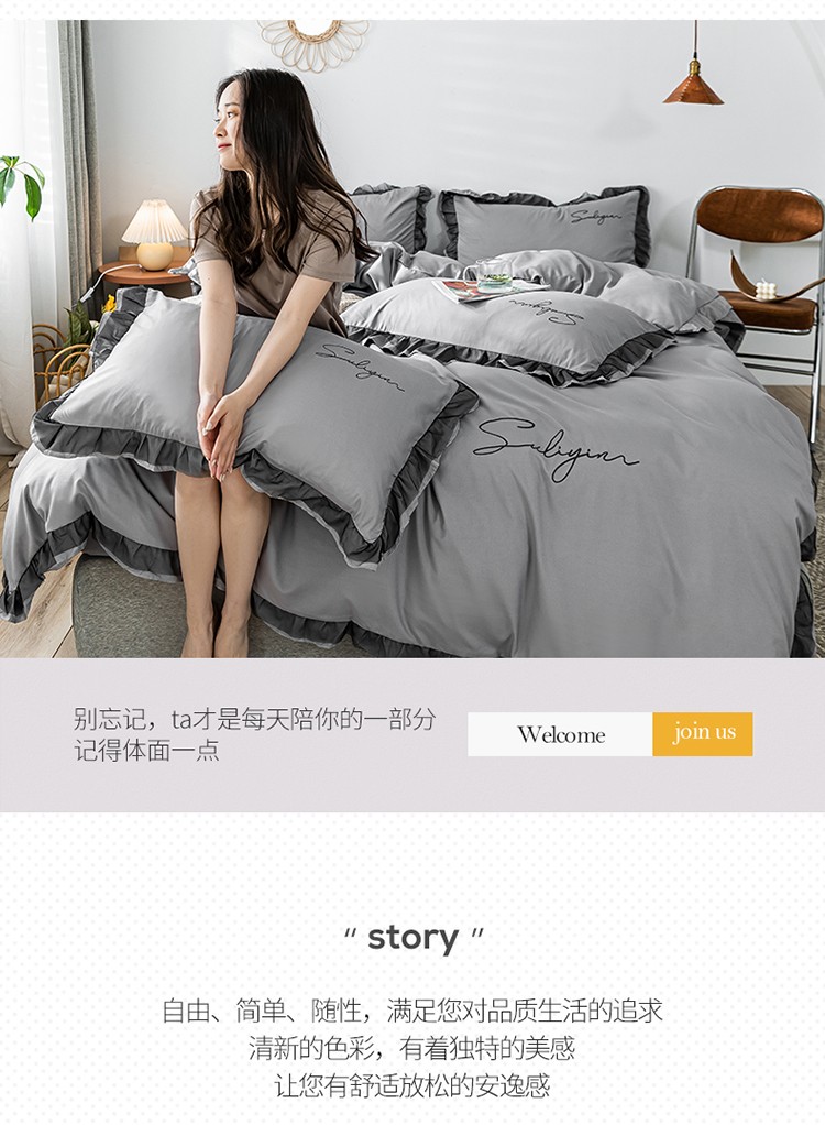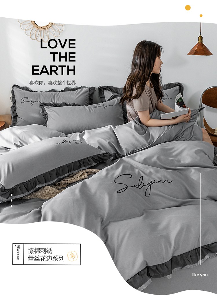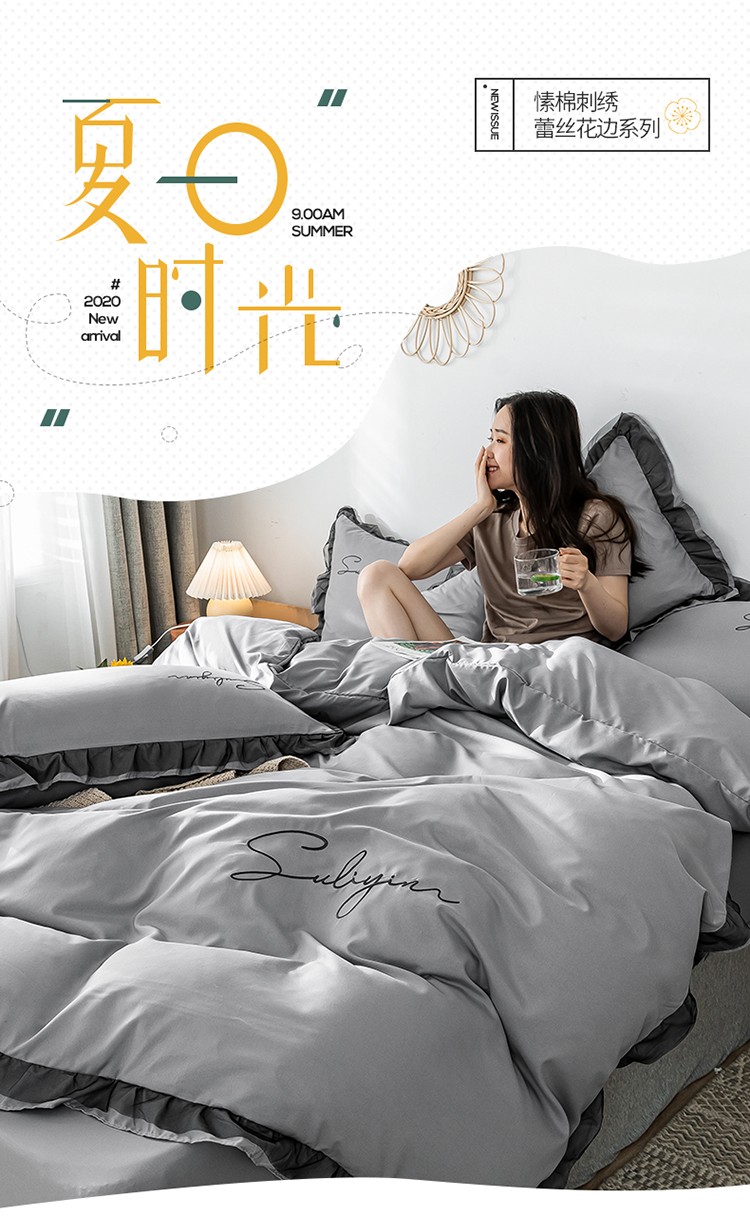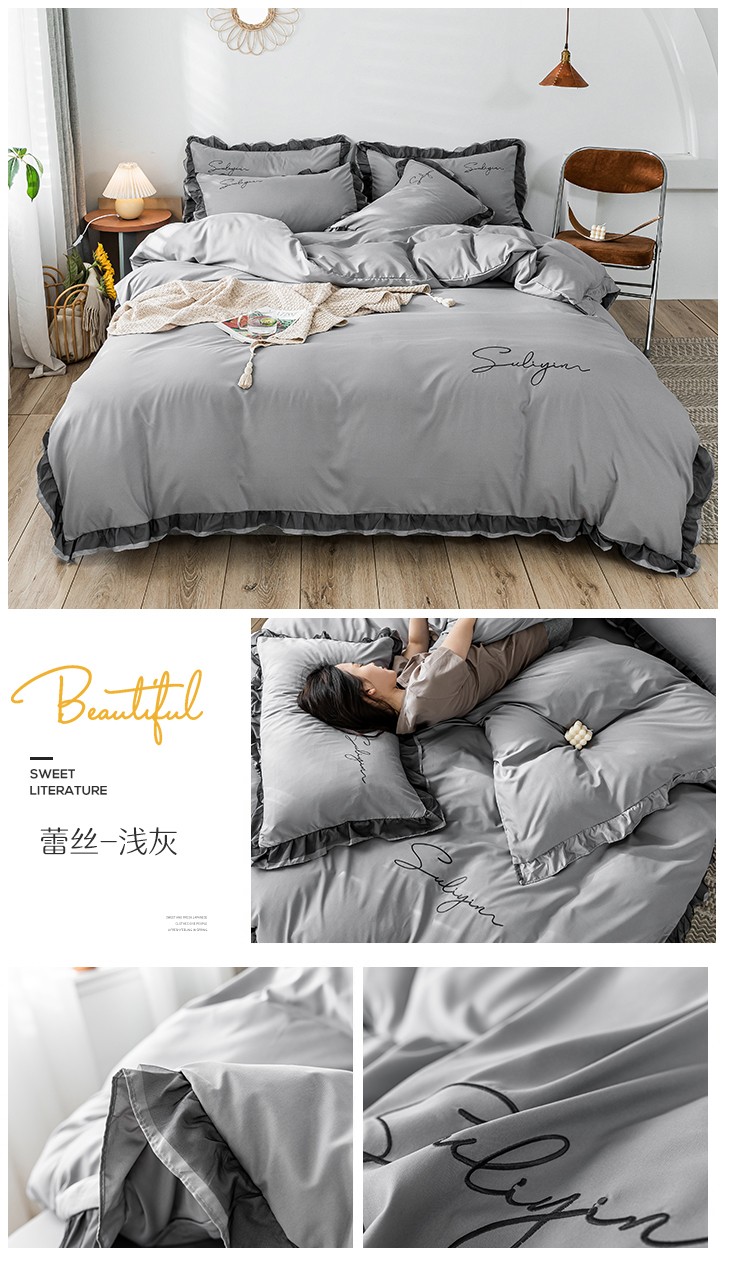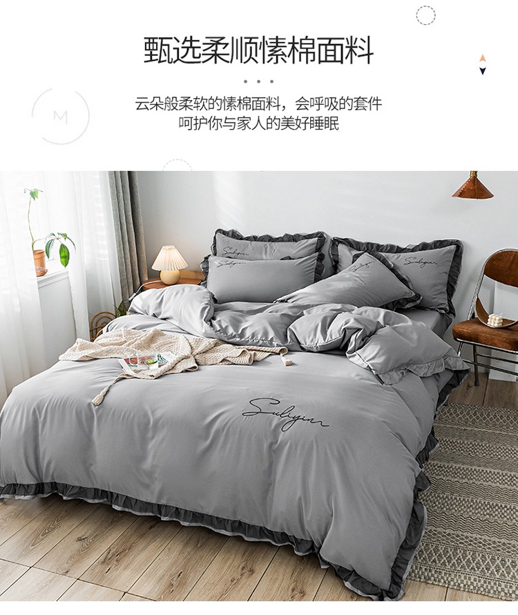 金麦家纺 2020新款愫棉刺绣蕾丝花边四件套 浅灰